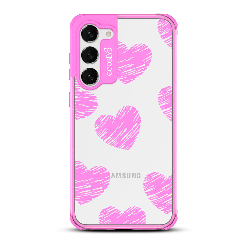 Perfectly capturing the magnetic pull of passion, the Drawn To You design on our Laguna clear Galaxy S23 case is an artful arrangement of scribbled hearts and the perfect representation of the power of love, turning any phone into an object of desire in five vibrant colorways: Midnight Black, Cascade Blue, Foliage Green, Illuminating Yellow, and Wildflower Pink.