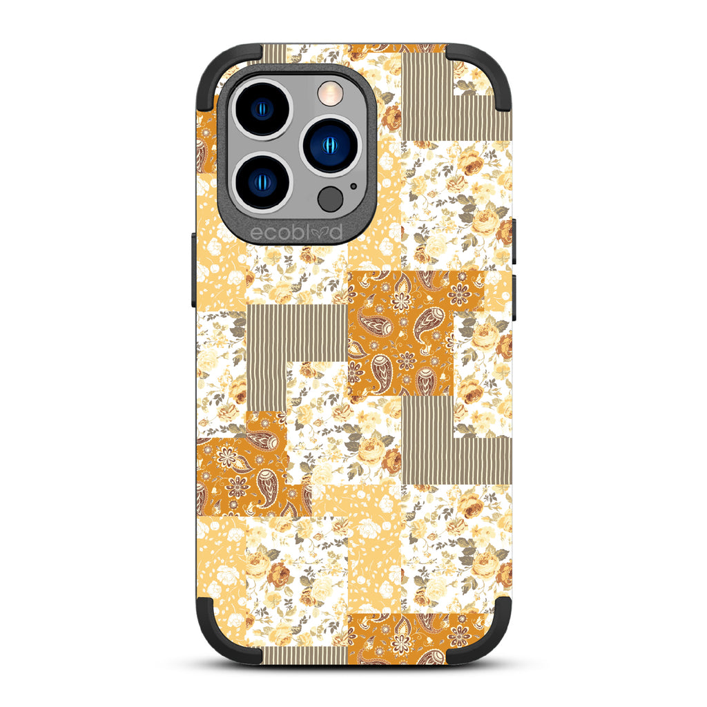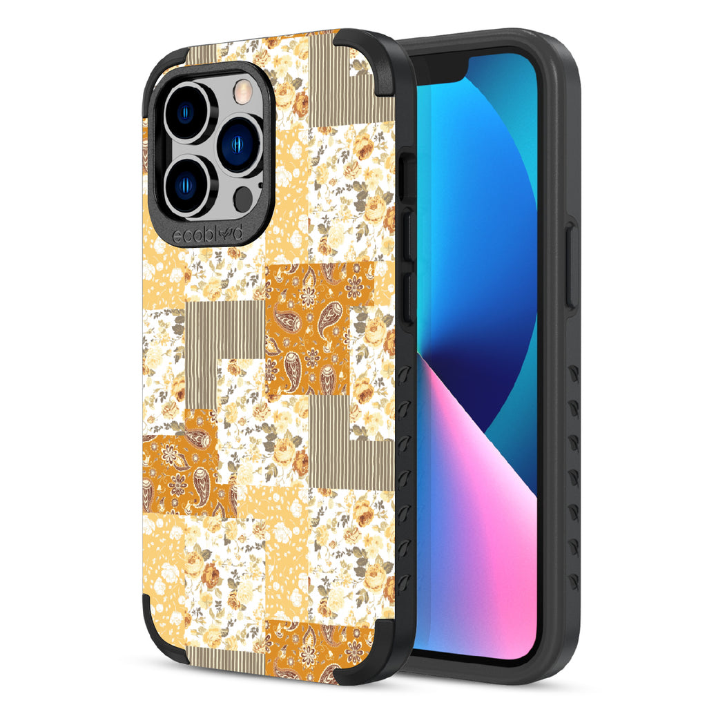 Everything falls into place with the Fall into Place design on our Mojave rugged and compostable iPhone 13 Pro cases. Layered with intricate florals, bold stripes, and earthy tones of mustard, cream, and rust, this patchwork mirrors the textured complexity of fall. From the crisp rustle of leaves underfoot to the soft warmth of layered knits, this design reflects autumn’s depth and richness at every turn.