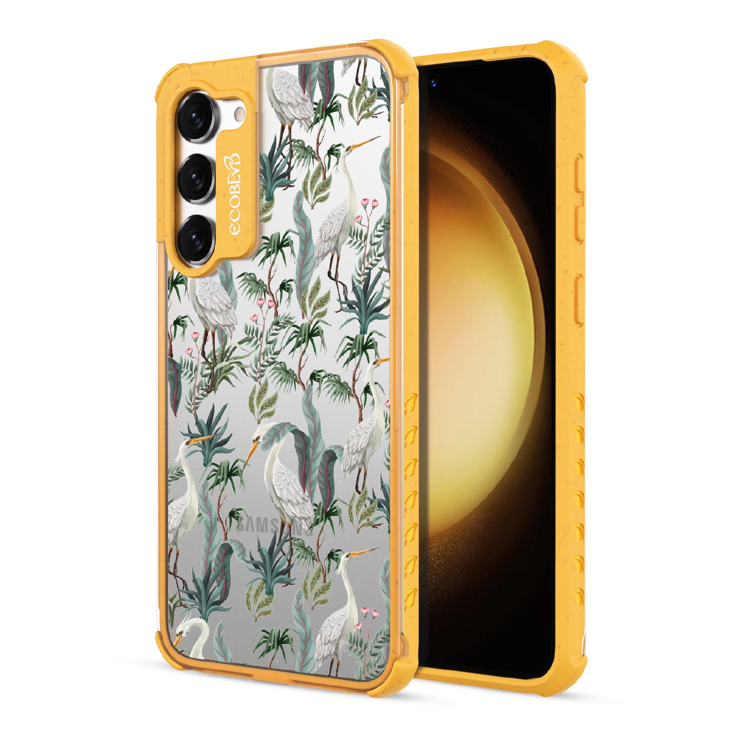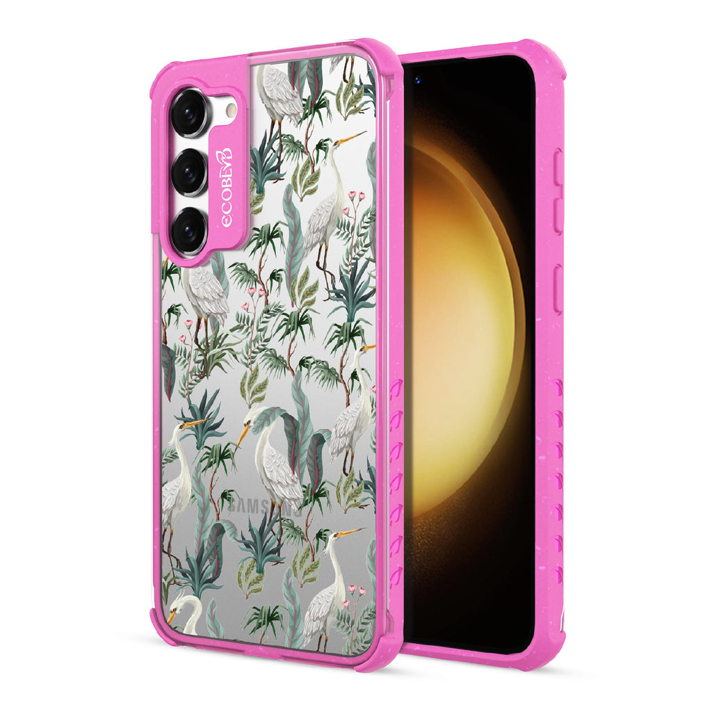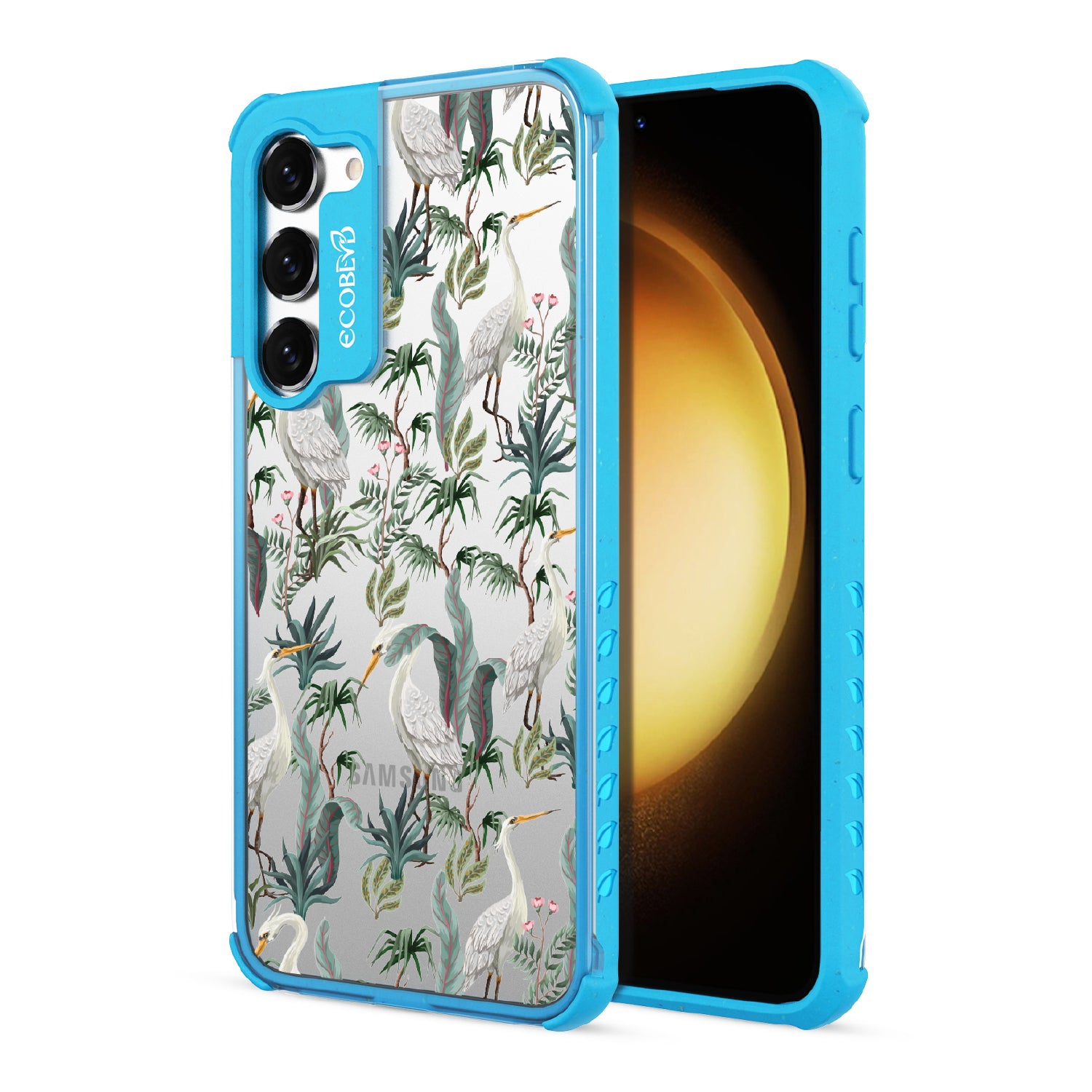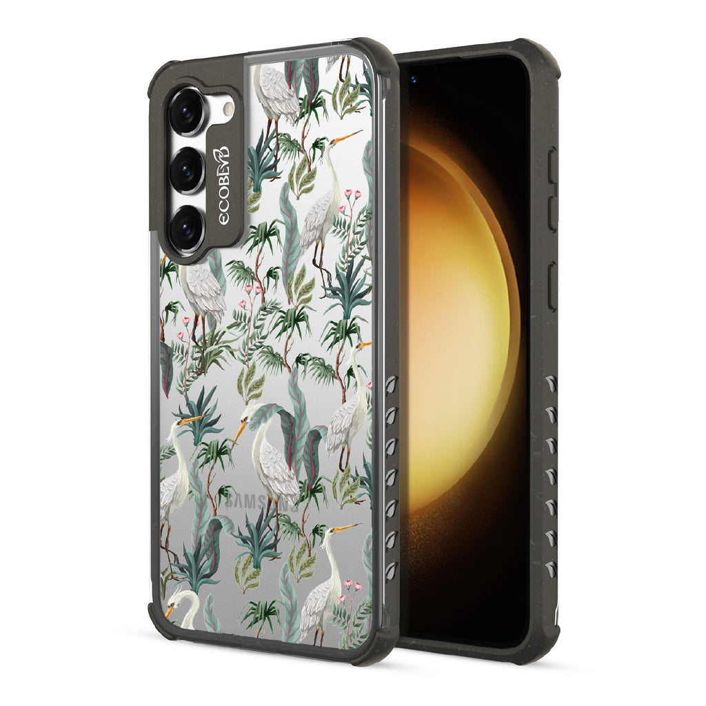 Embrace the strength and beauty of sticking together with Flock Together, an exclusive design crafted for the Laguna clear Galaxy S23 Plus case. Immerse yourself in impeccable style and protection while supporting ocean conservation efforts, as elegant heron birds and intricate peonies come together in perfect harmony. Flock Together is more than just a name, it's a powerful message of togetherness and unity. Featuring elegant heron birds and intricate peonies, this design inspires us to embrace our connections and appreciate the beauty that comes with standing together in five captivating colors: Midnight Black, Cascade Blue, Foilage Green, Illuminating Yellow, and Wildflower Pink. With this phone case, you carry with you a reminder of the beauty that lies within collective strength and the significance of standing together.