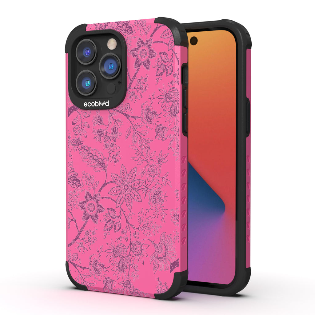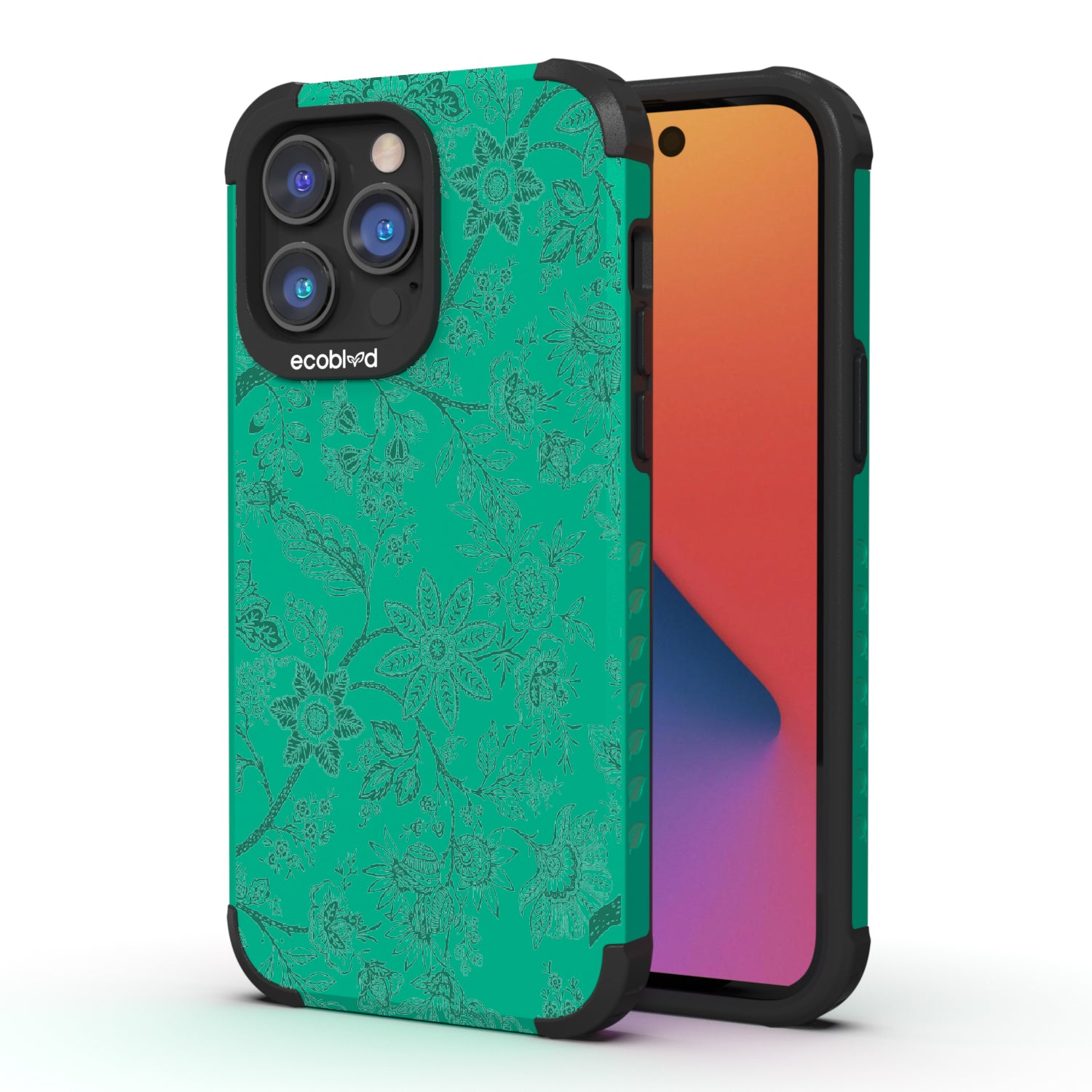 Explore that floral feeling as the Flower Crown design on our Mojave rugged and compostable iPhone 14 Pro case brings out your inner sparkle so you can stand beautiful, fierce, and free with the perfect fashion accessory on your phone full of care-free, hippy style. Available in five lively color options: Midnight Black, Cascade Blue, Foliage Green, Illuminating Yellow, and Wildflower Pink.