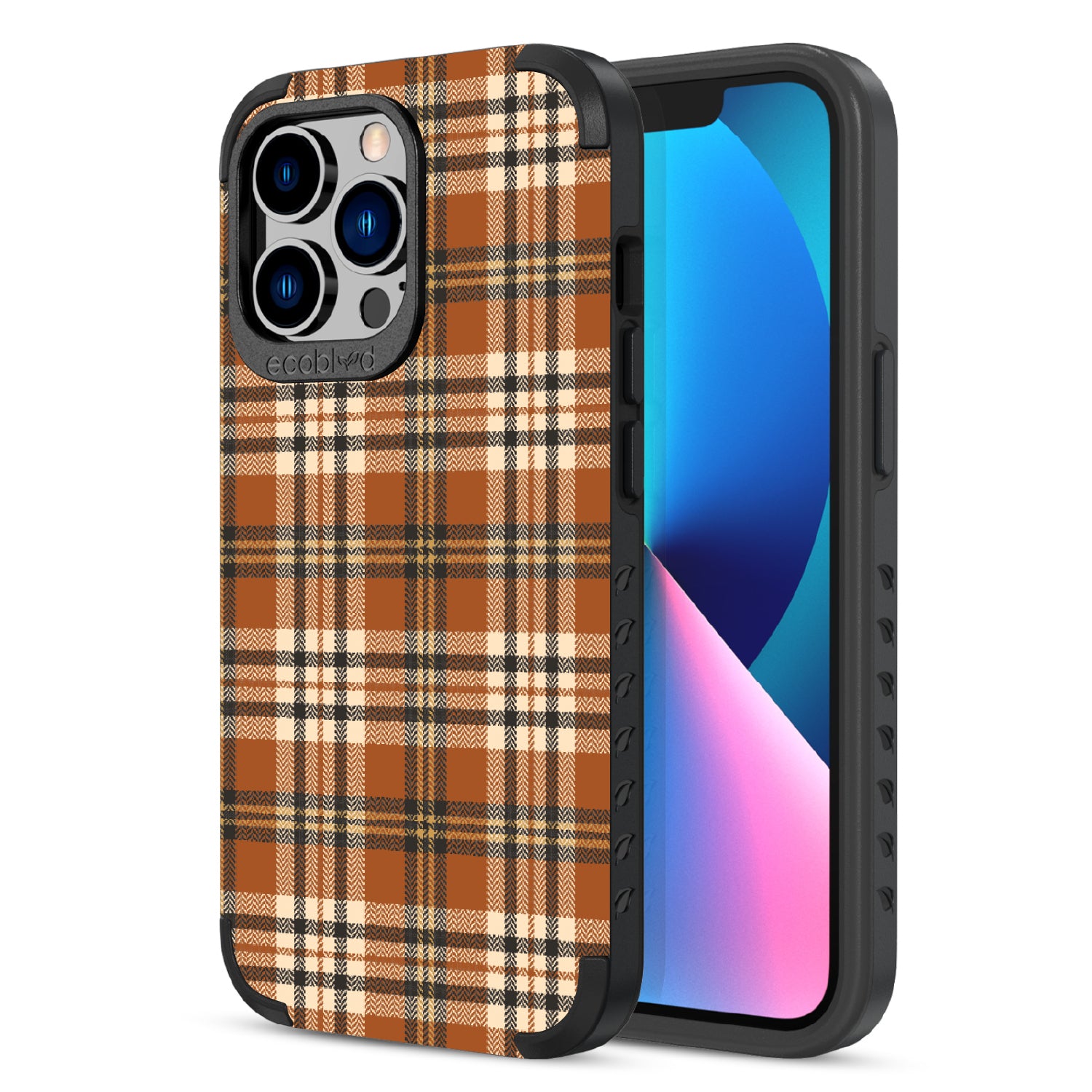 The Harvest Plaid design on our Mojave rugged and compostable iPhone 13 Pro phone case exudes plaid-itudes as it adds a touch of rustic charm to your ensemble. The warm brown and yellow plaid pattern captures the essence of autumn and the harvest season, making it a perfect complement to your fall wardrobe.