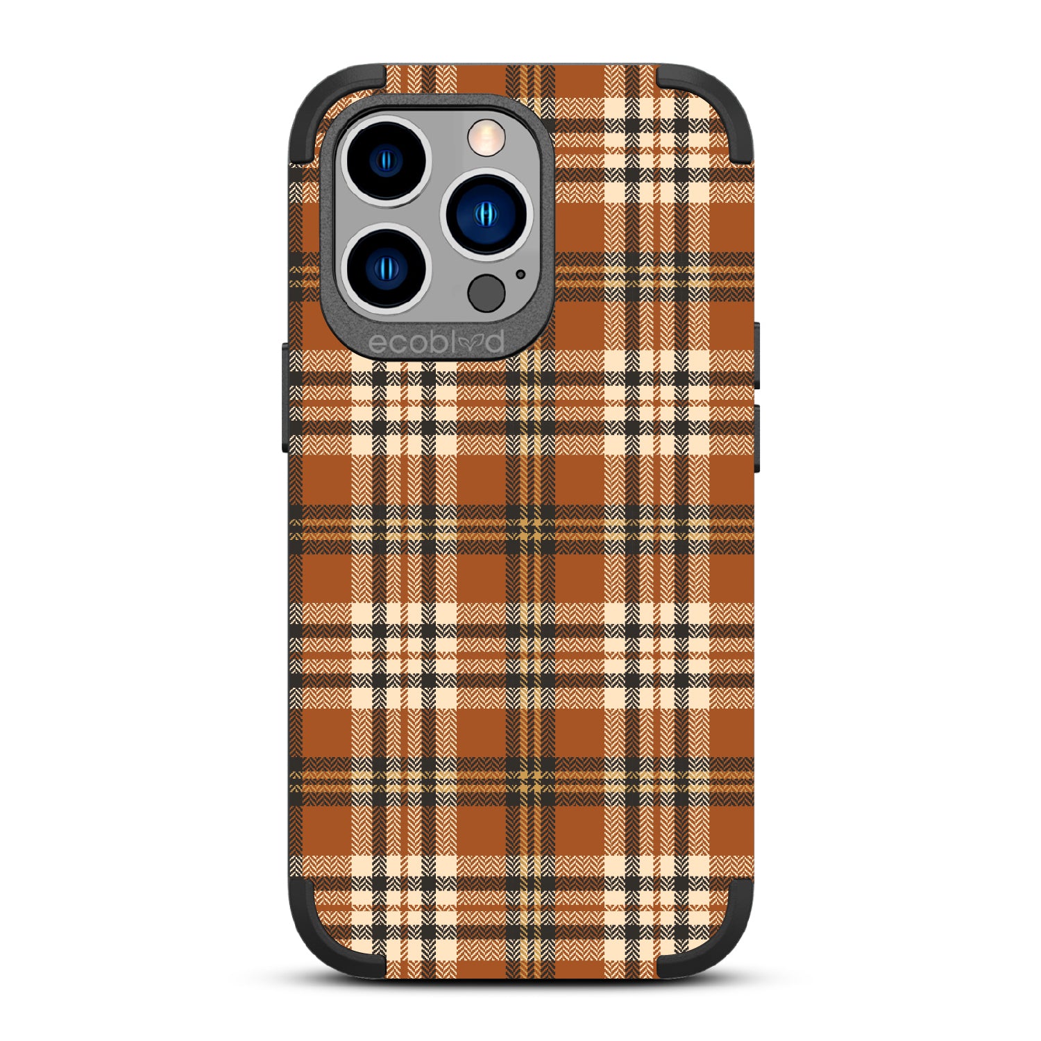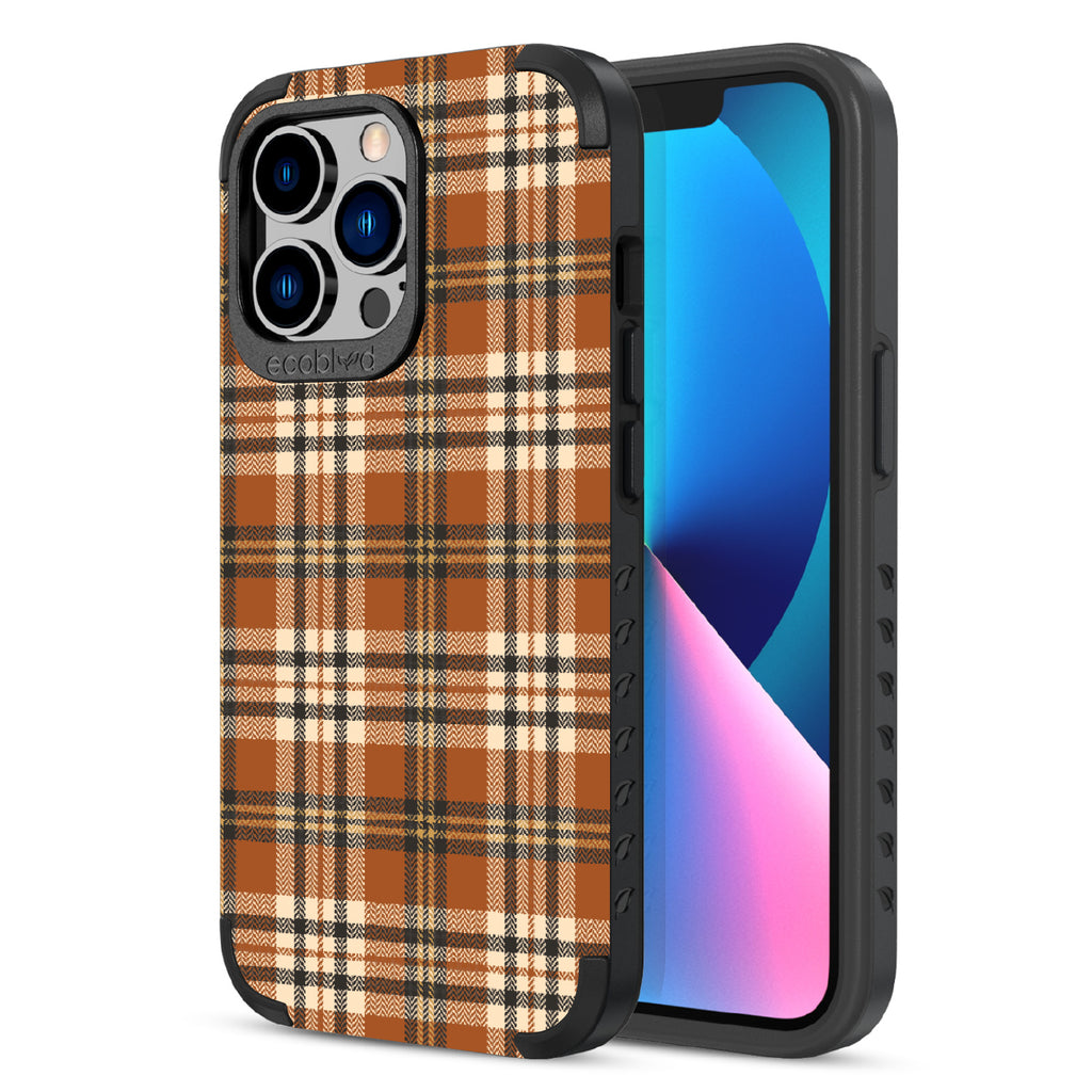The Harvest Plaid design on our Mojave rugged and compostable iPhone 12 Pro Max phone case & iPhone 13 Pro Max phone case exudes plaid-itudes as it adds a touch of rustic charm to your ensemble. The warm brown and yellow plaid pattern captures the essence of autumn and the harvest season, making it a perfect complement to your fall wardrobe.