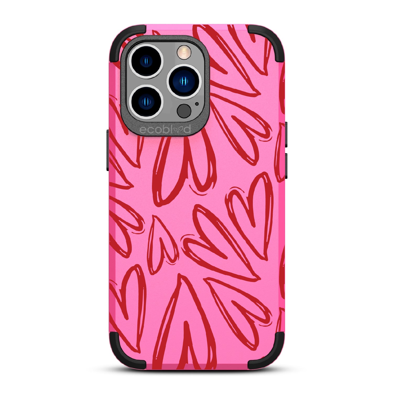 Scribbled with love and passion, the Heartfelt design on our Mojave rugged and compostable iPhone 12 Pro Max phone case & iPhone 13 Pro Max phone case's bold red hearts will put a smile on your face and a spring in your step every time you use your iPhone. Choose from two romantic colorways: Midnight Black and Wildflower Pink.