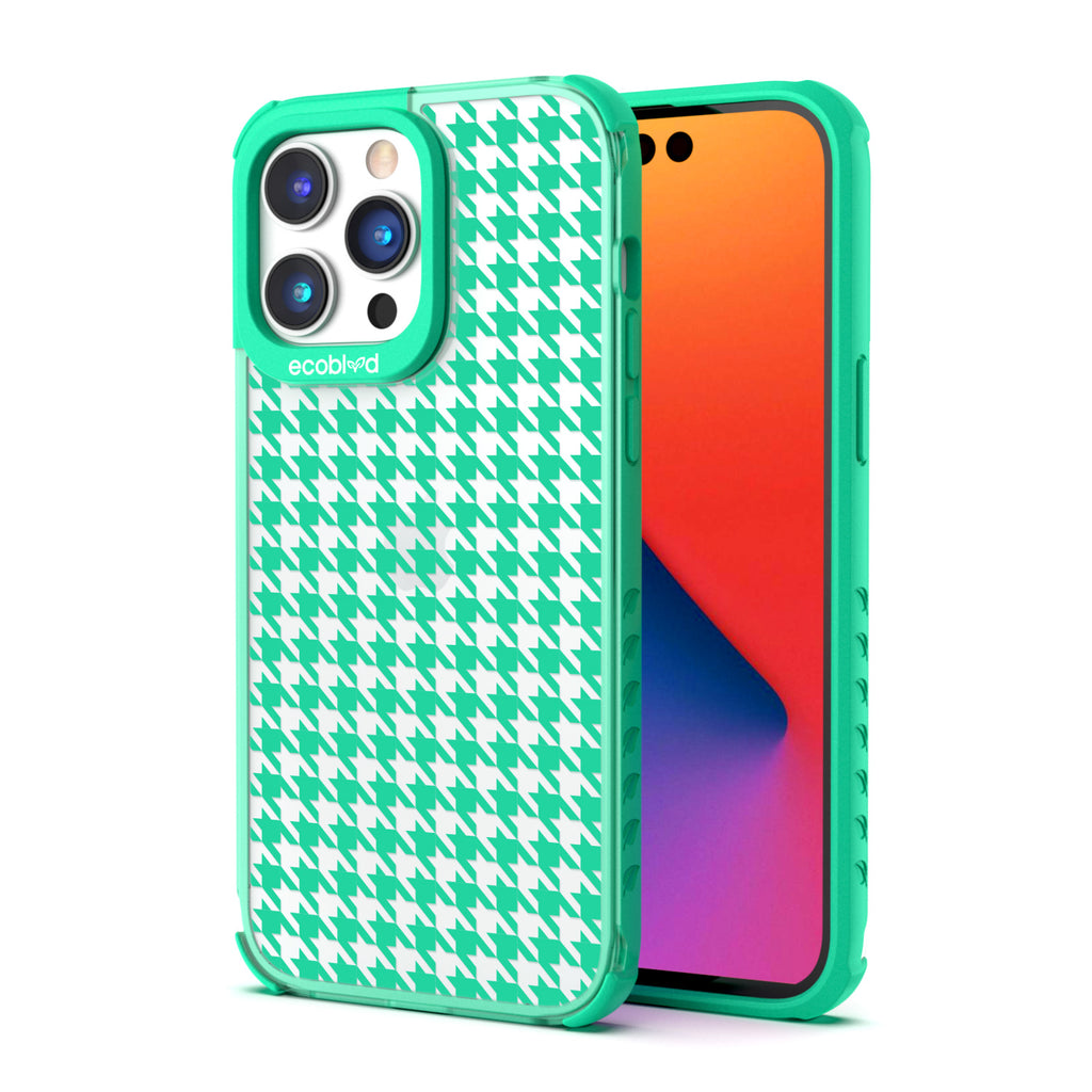 The Houndstooth design on our Laguna clear iPhone 14 Pro Max phone case will have you saying, "Check, please!" as its utilitarian two-toned weaved pattern brings a high society attitude to wake up your style and your iPhone 14 Pro Max with a bold look in five striking color options: Midnight Black, Cascade Blue, Foliage Green, Illuminating Yellow, and Wildflower Pink.