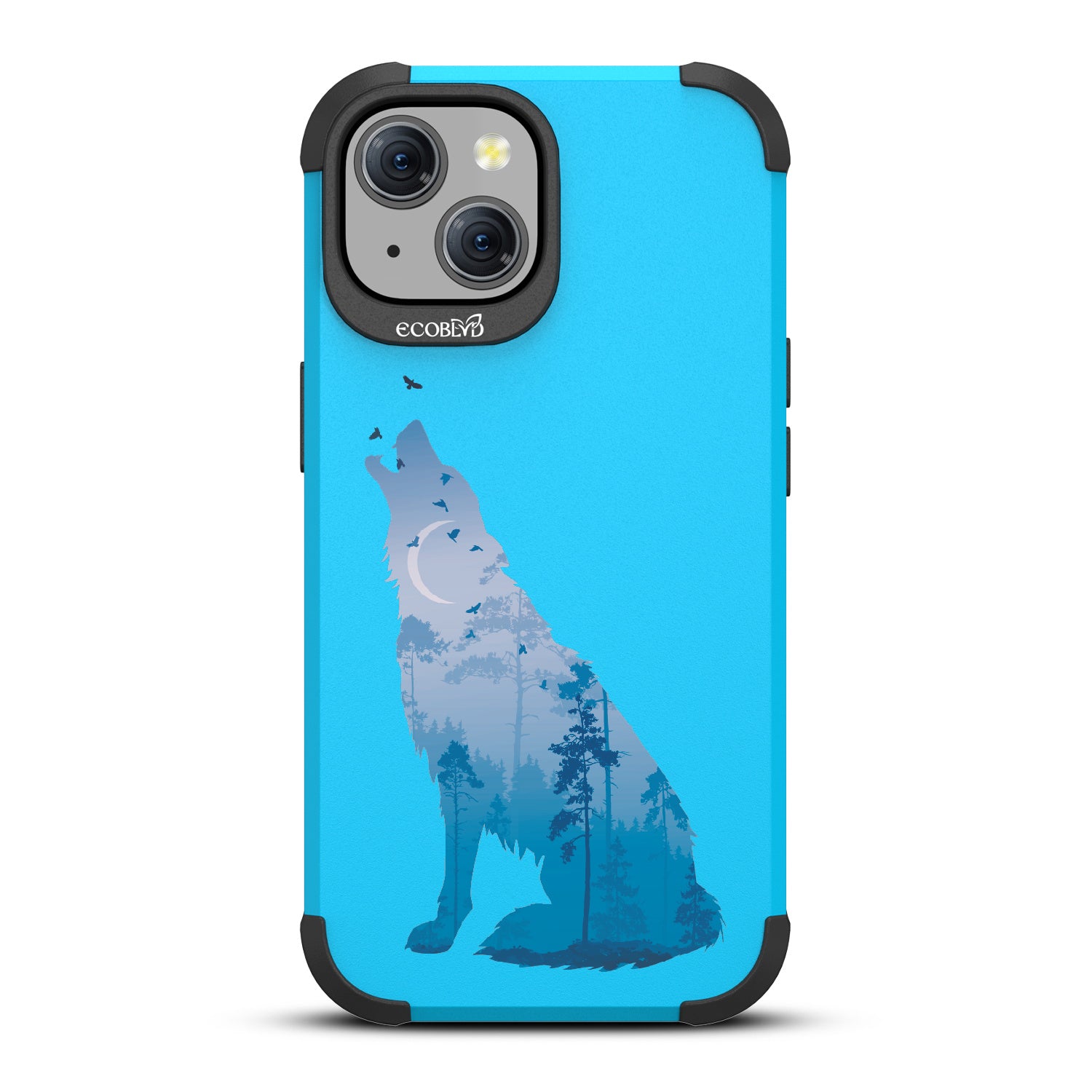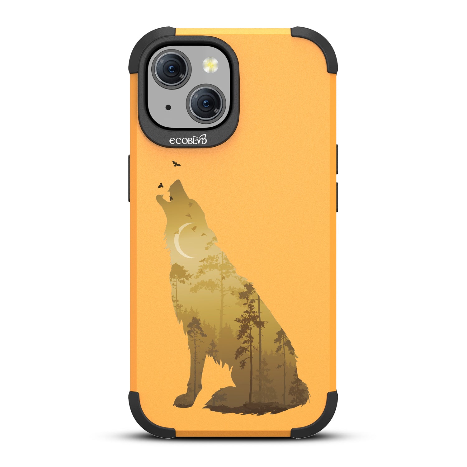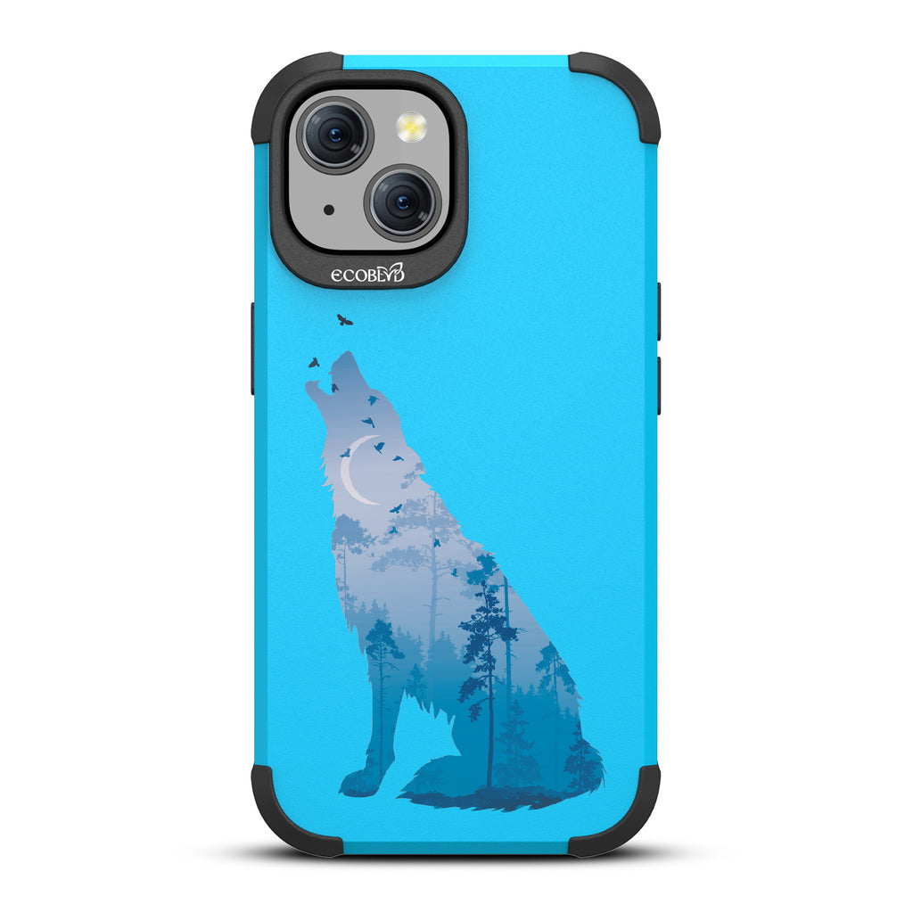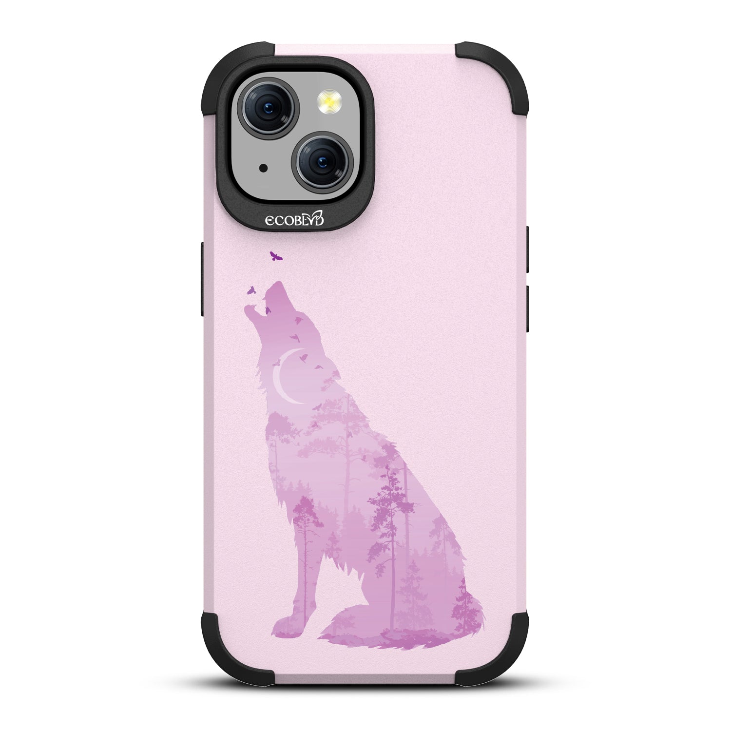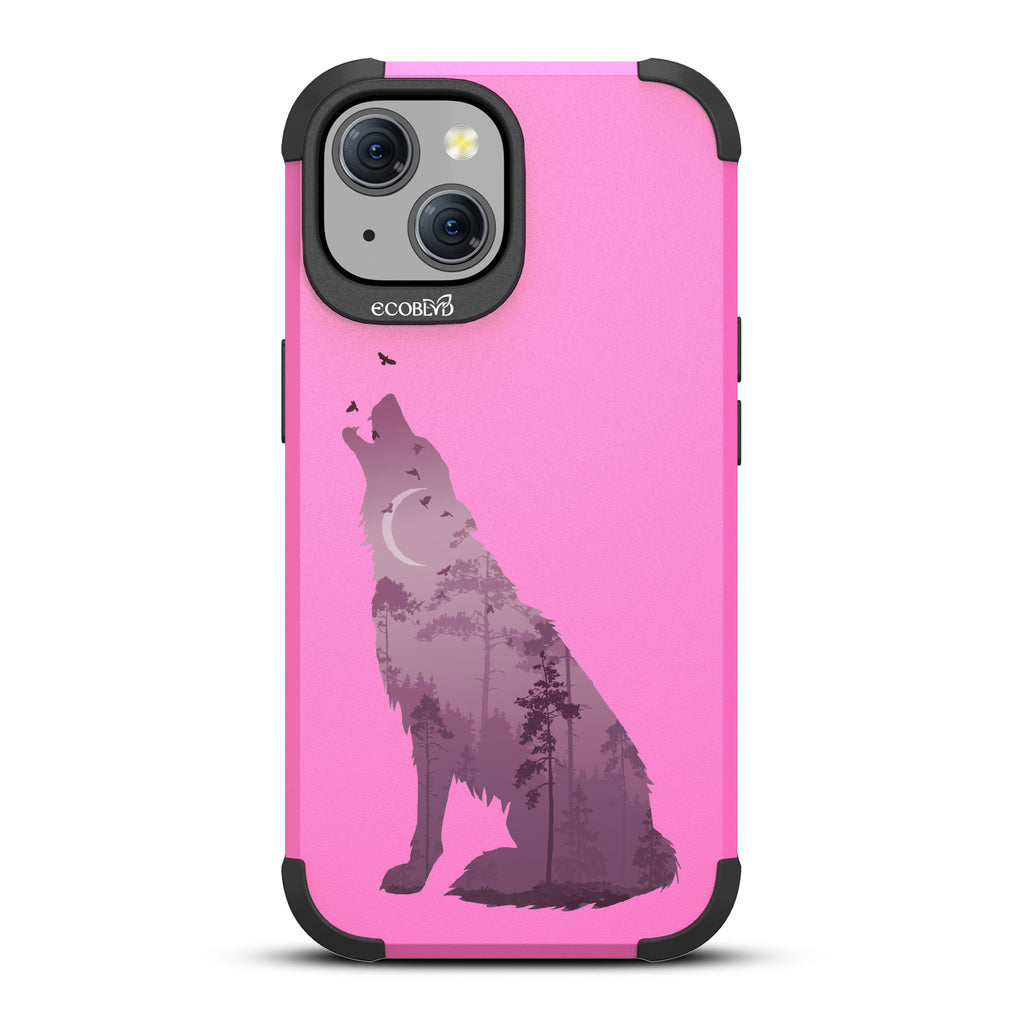 Embrace your wild side as the Howl At The Moon design on our Mojave rugged and compostable iPhone 15 MagSafe case transforms your iPhone into an enchanting moonlit woodland with a howling wolf prowling through the darkness. Available in five colorways: Midnight Black, Cascade Blue, Wildflower Pink, Illuminating Yellow, and the exclusive Pastel Lilac!