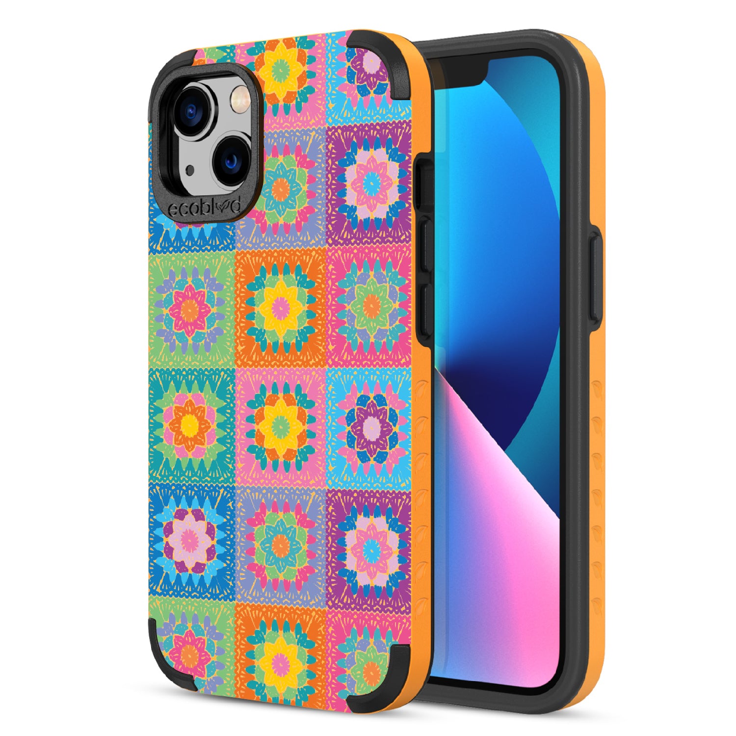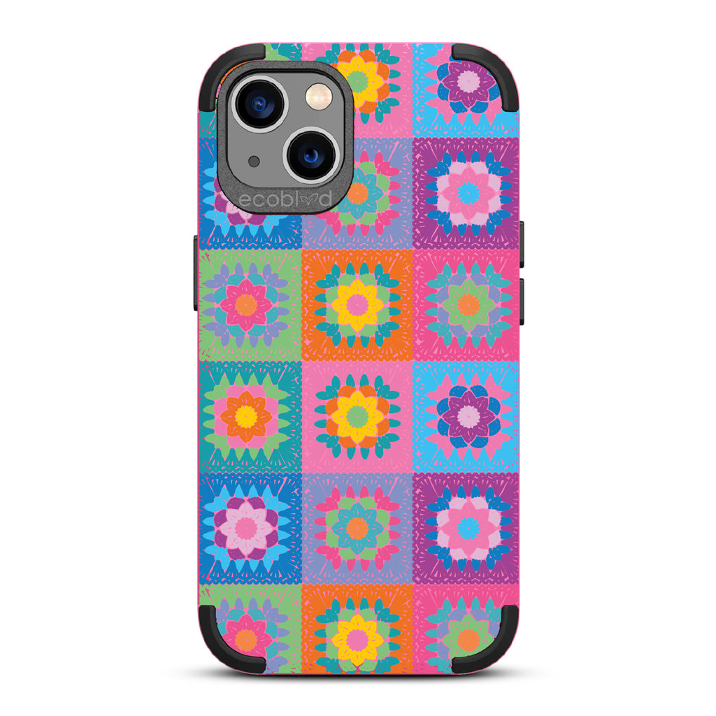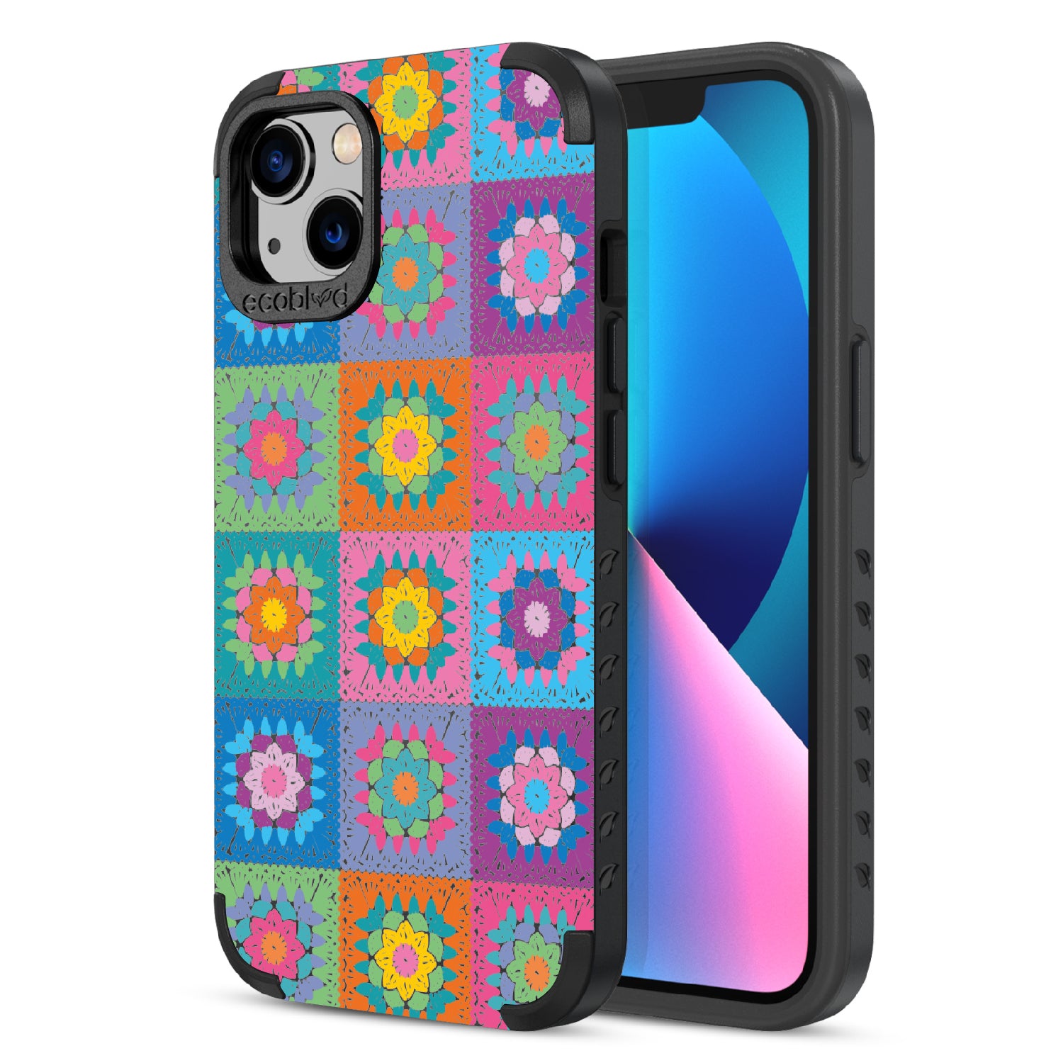 Let the All Squared Away design on our Mojave rugged and compostable iPhone 13 case be your constant companion for Spring Break, music fests, or all year round, giving you a warm and inviting look with its quilt-like design of vintage granny squares and intricate flowers in five bright colorways: Midnight Black, Cascade Blue, Foliage Green, Illuminating Yellow, and Wildflower Pink.