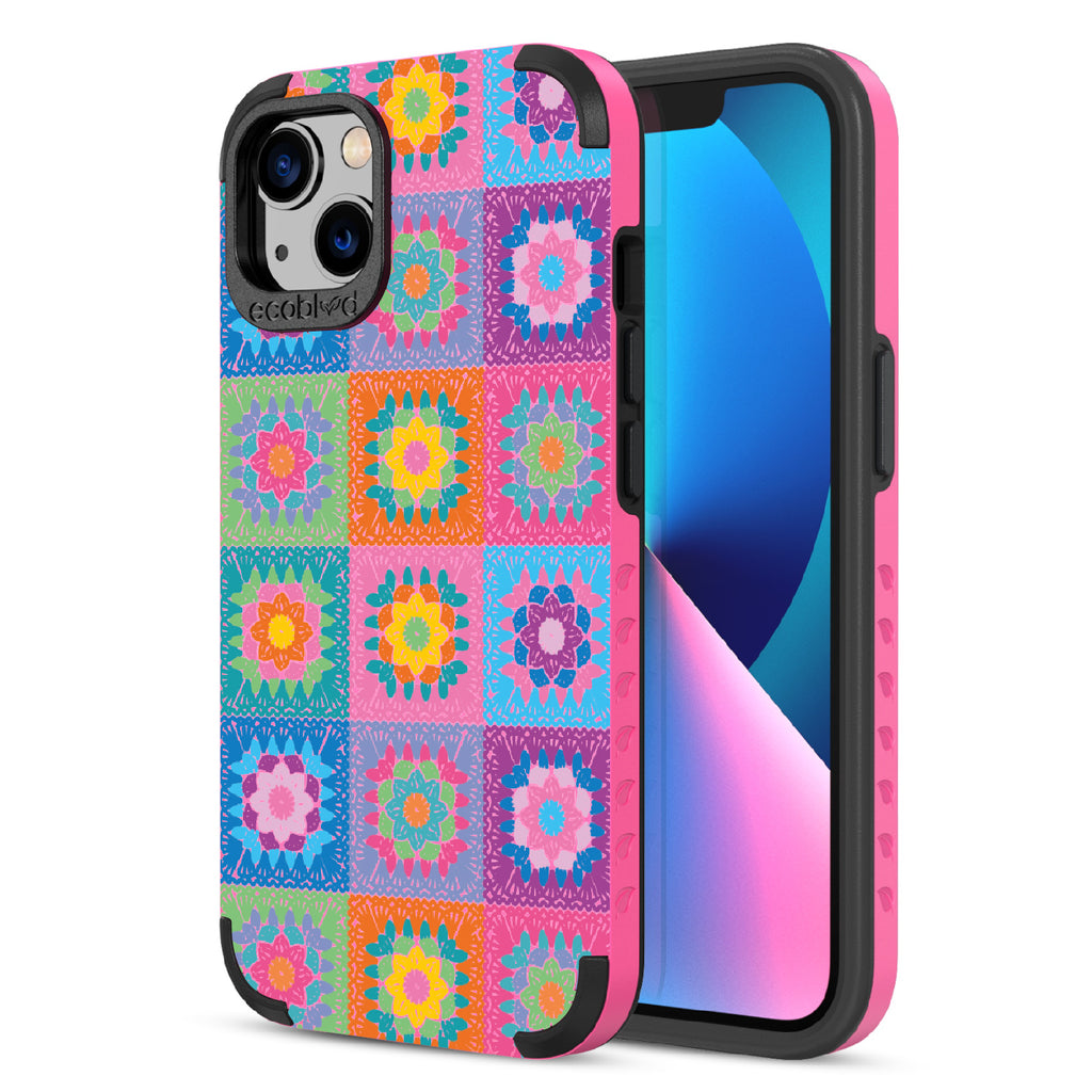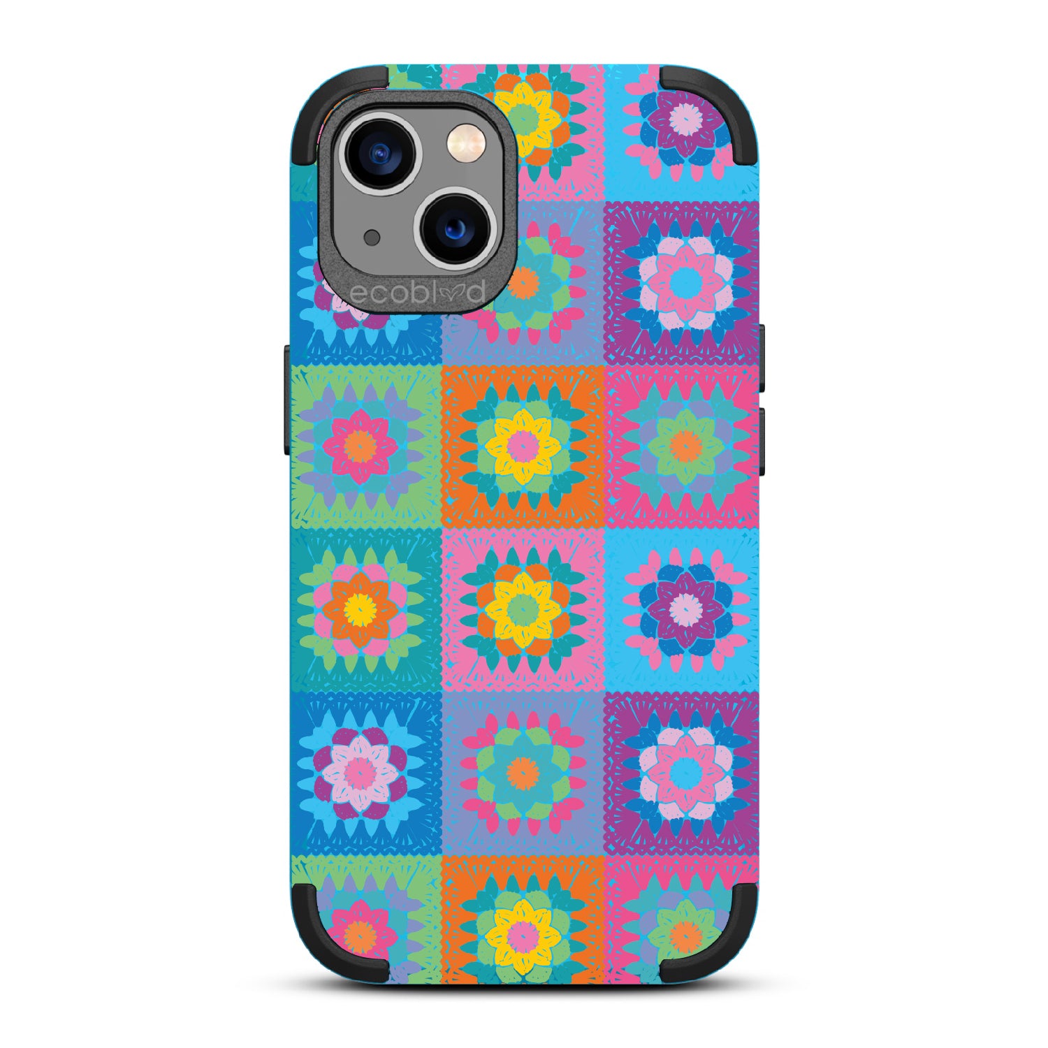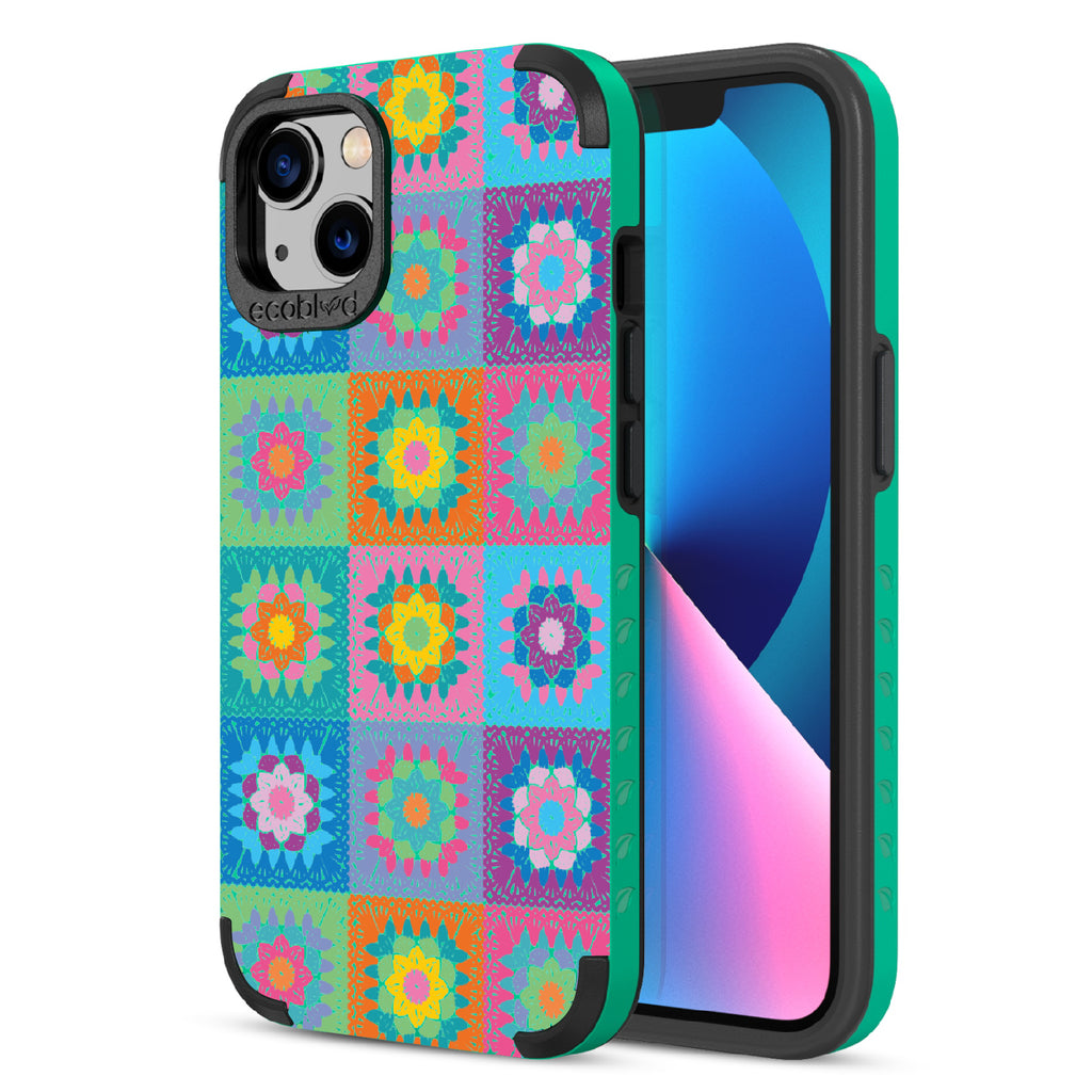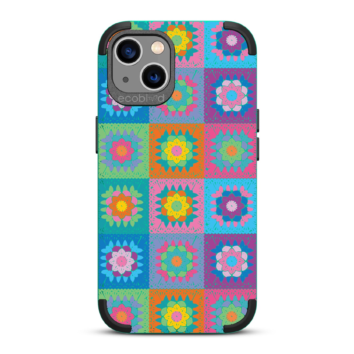 Let the All Squared Away design on our Mojave rugged and compostable iPhone 13 case be your constant companion for Spring Break, music fests, or all year round, giving you a warm and inviting look with its quilt-like design of vintage granny squares and intricate flowers in five bright colorways: Midnight Black, Cascade Blue, Foliage Green, Illuminating Yellow, and Wildflower Pink.
