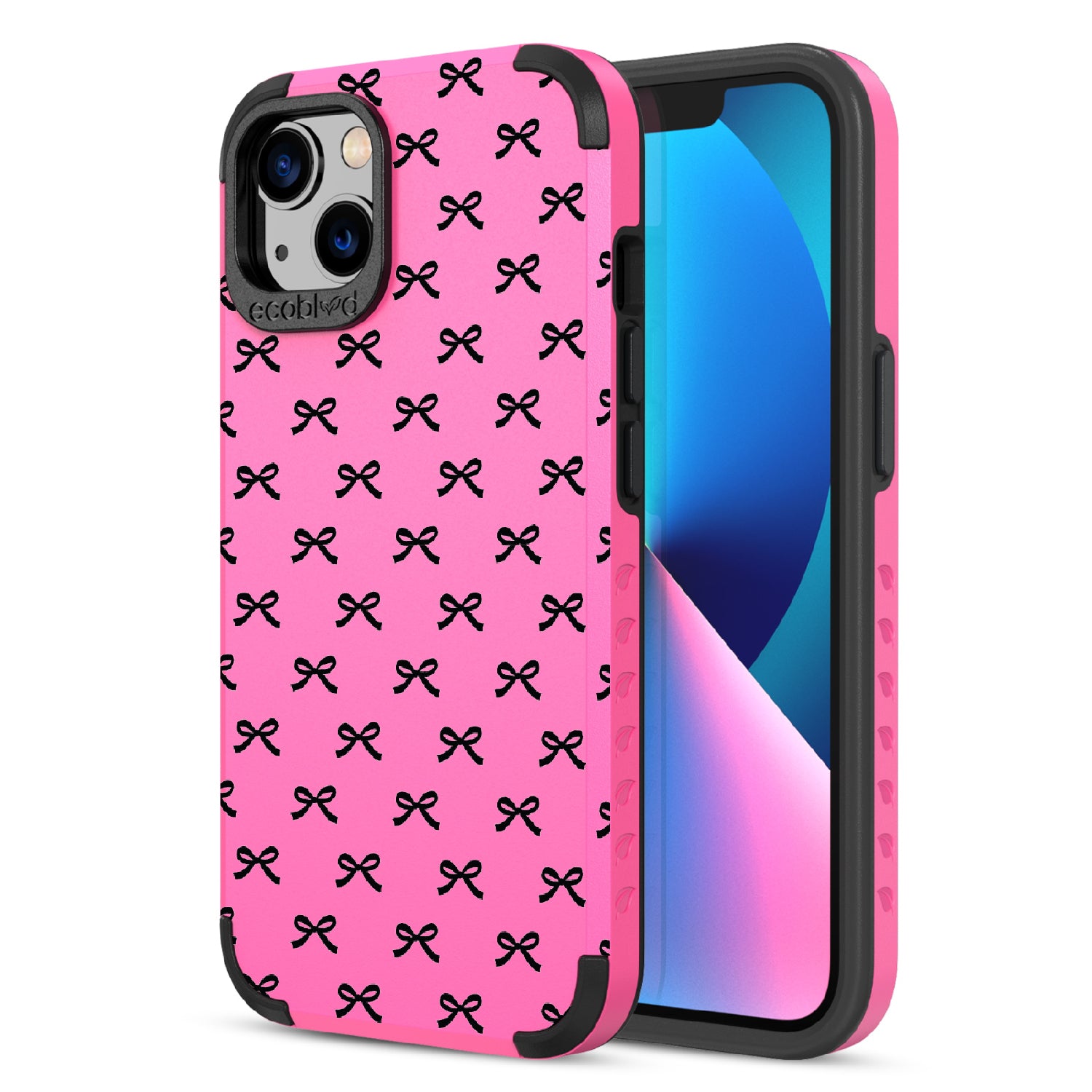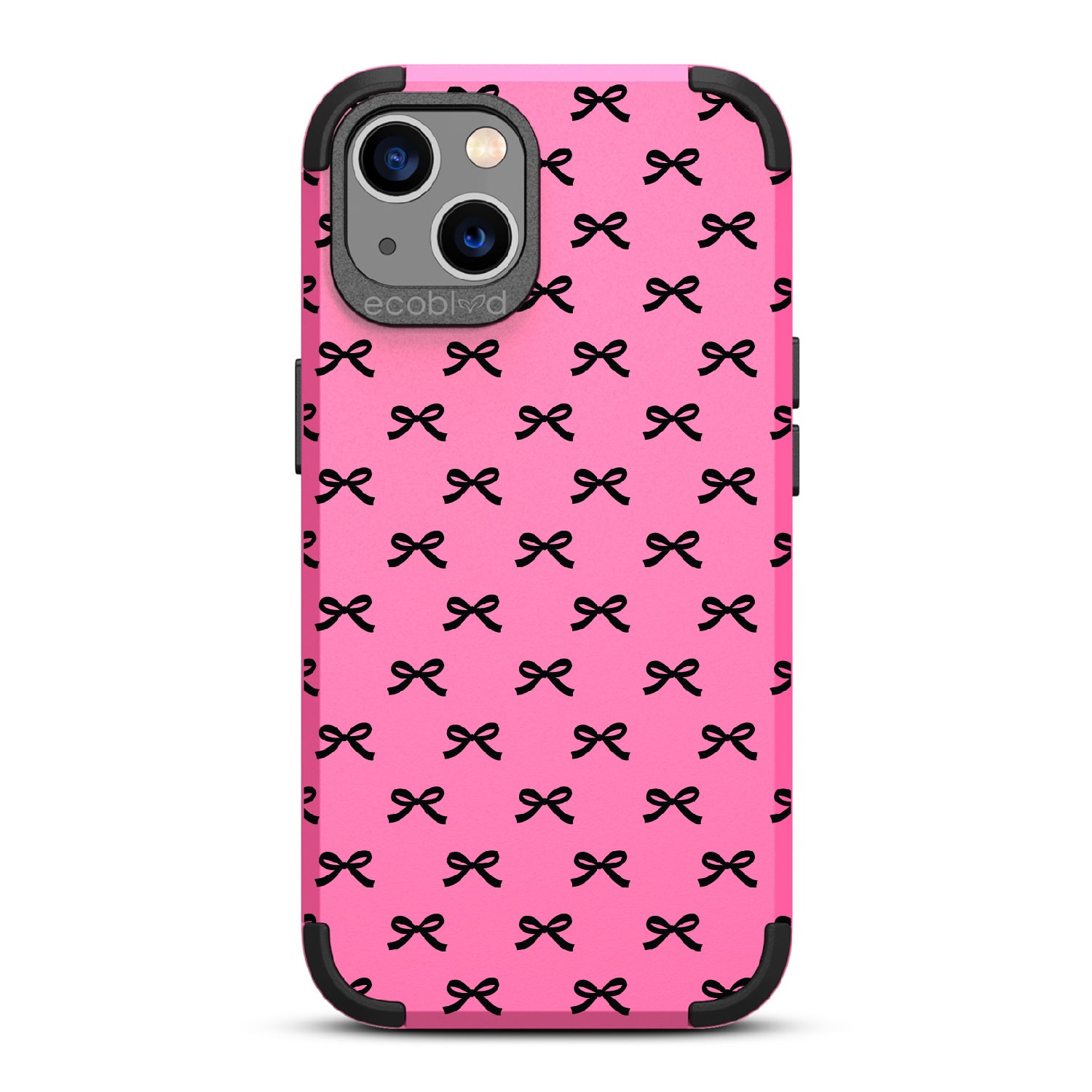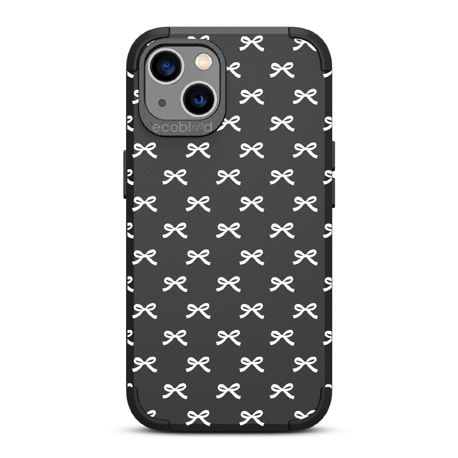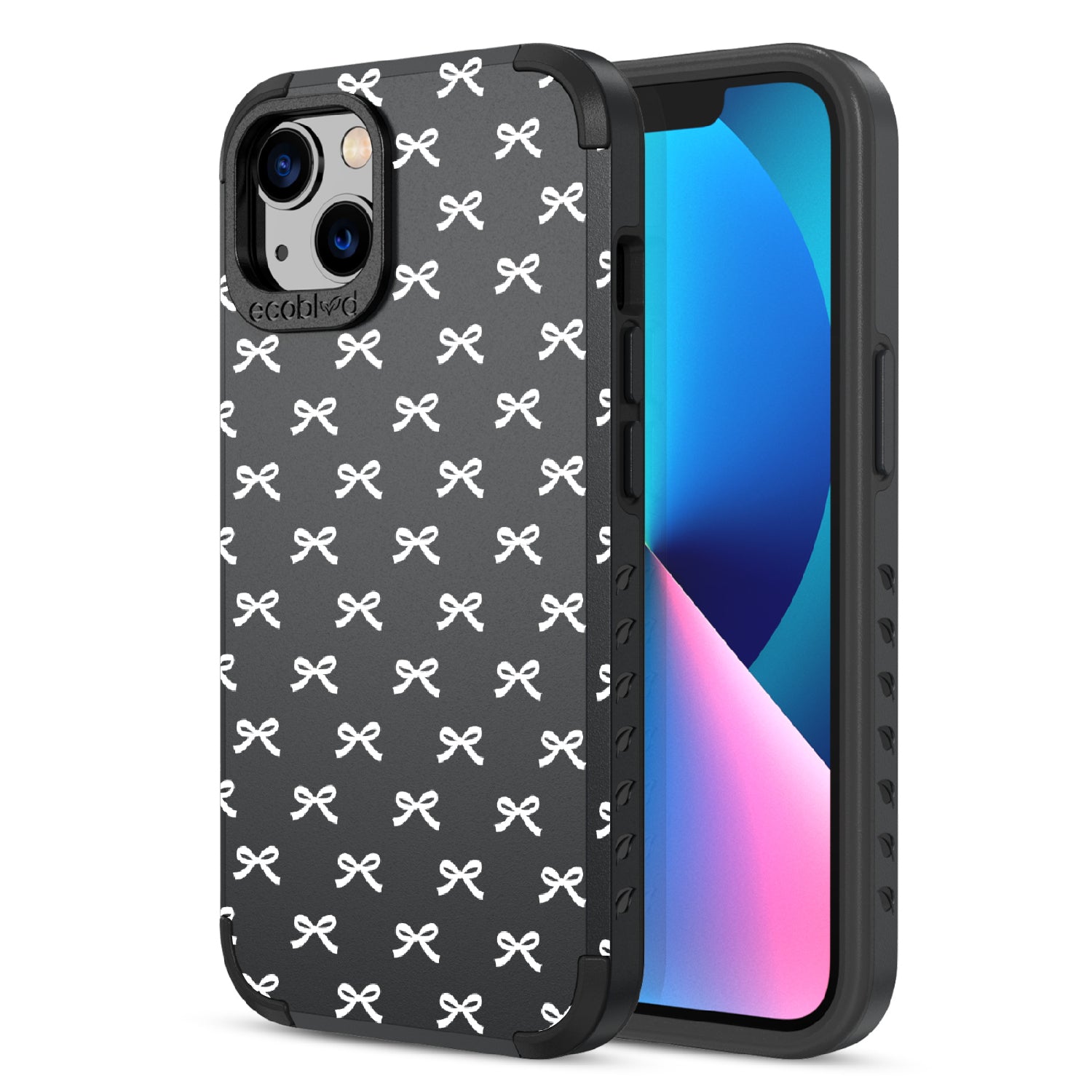 Get all dressed up to adorn and adore with the Coquette design on our Mojave rugged and compostable iPhone 13 case. Let the cute black bows be the stars of the show, gracing your phone with their dainty presence. As you hold your device, you'll feel the subtle embrace of everlasting bonds formed by each dainty knot, creating a sense of feminine connection and girlhood that goes beyond mere aesthetics.