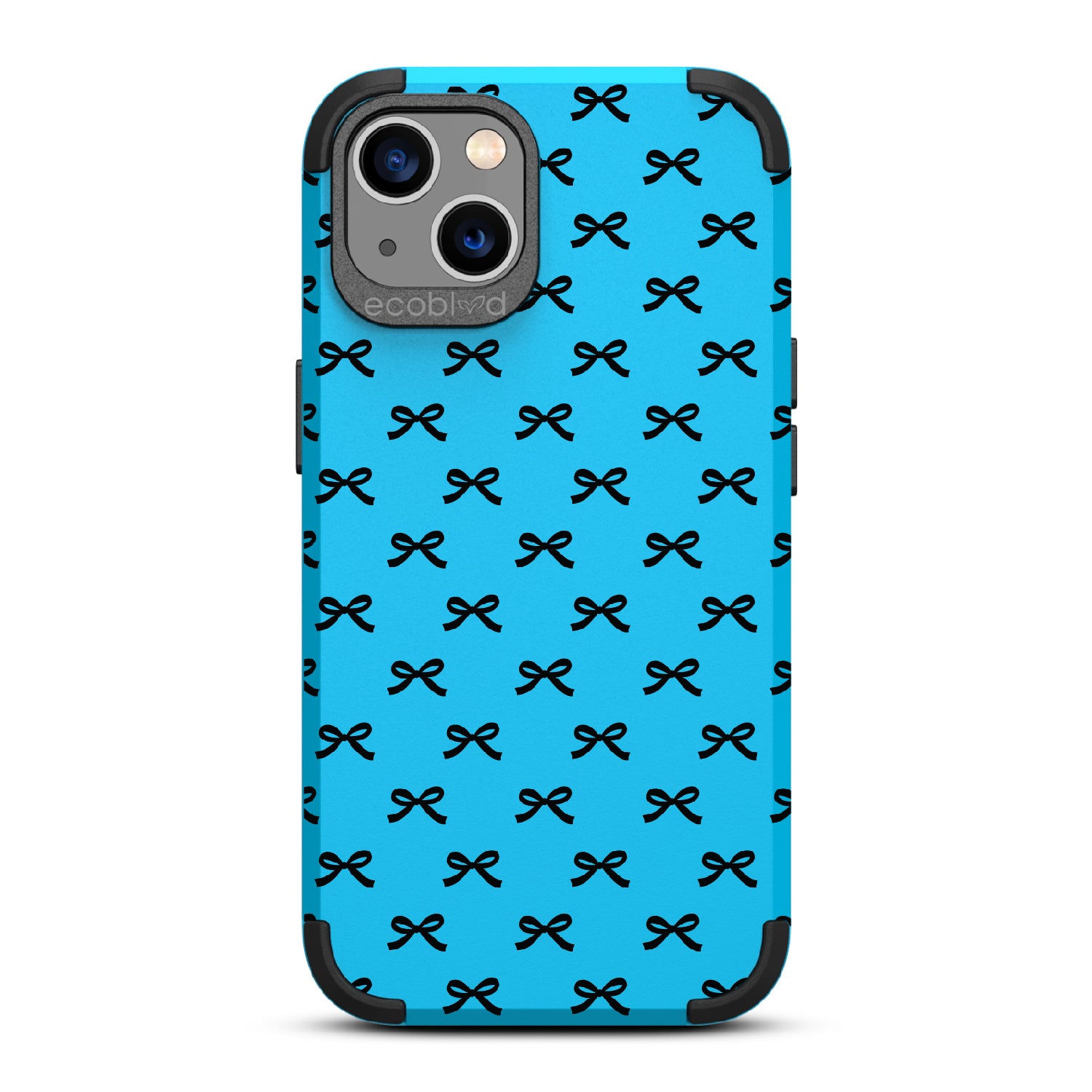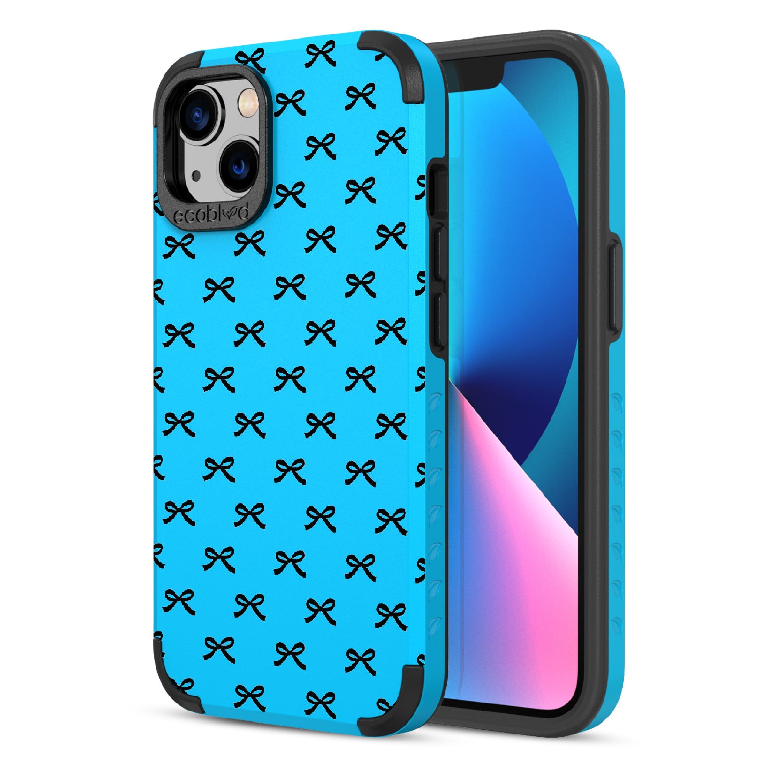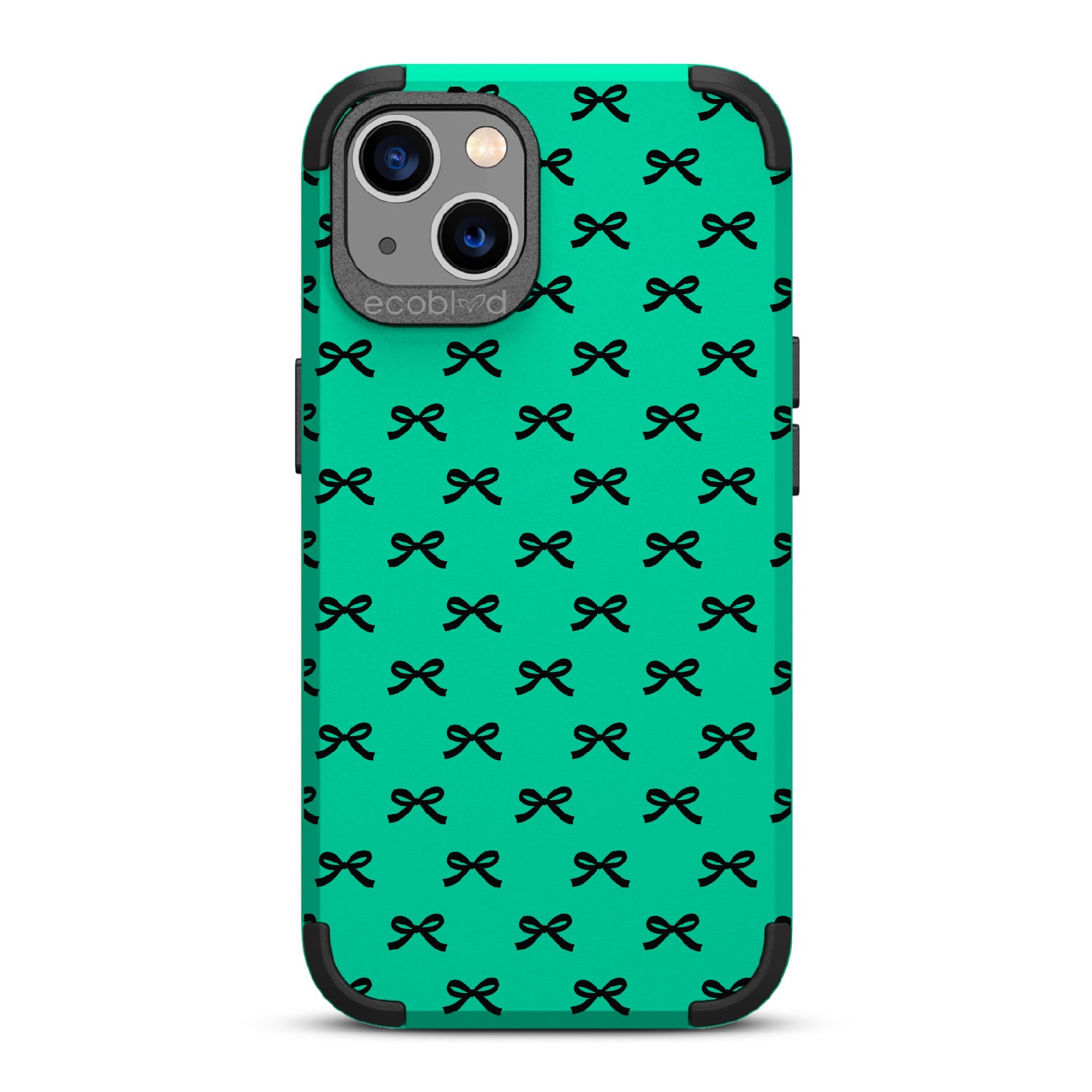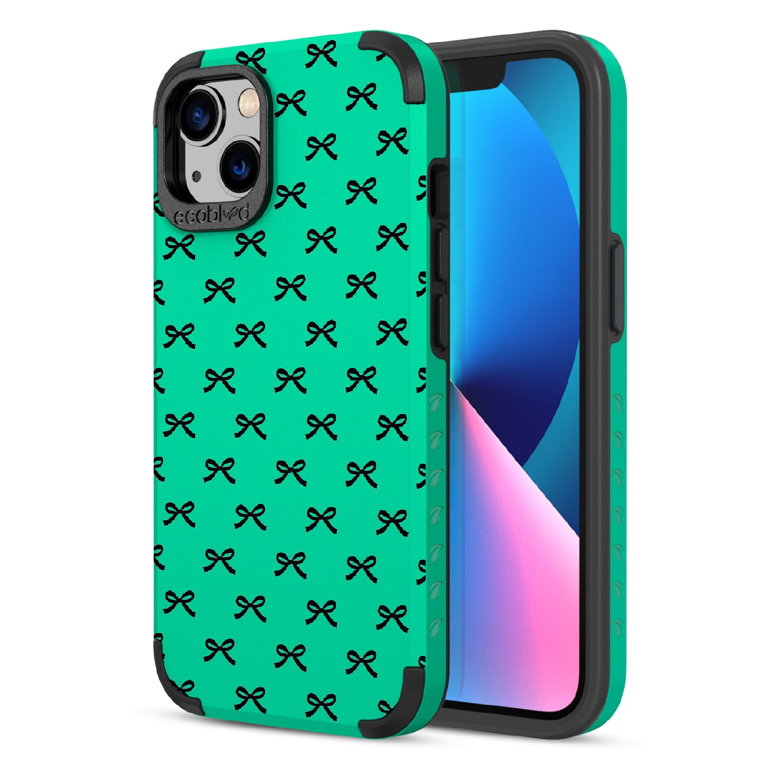 Get all dressed up to adorn and adore with the Coquette design on our Mojave rugged and compostable iPhone 13 case. Let the cute black bows be the stars of the show, gracing your phone with their dainty presence. As you hold your device, you'll feel the subtle embrace of everlasting bonds formed by each dainty knot, creating a sense of feminine connection and girlhood that goes beyond mere aesthetics.