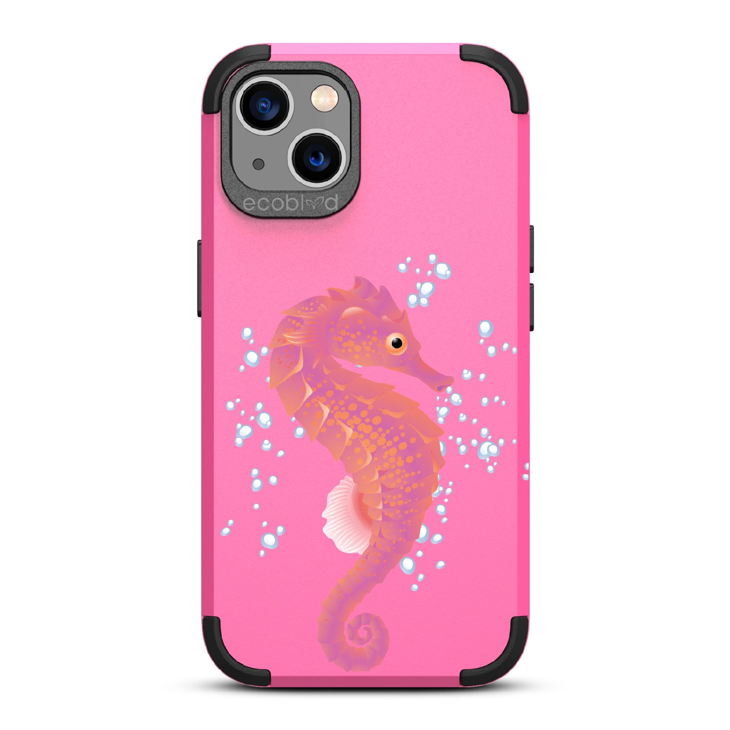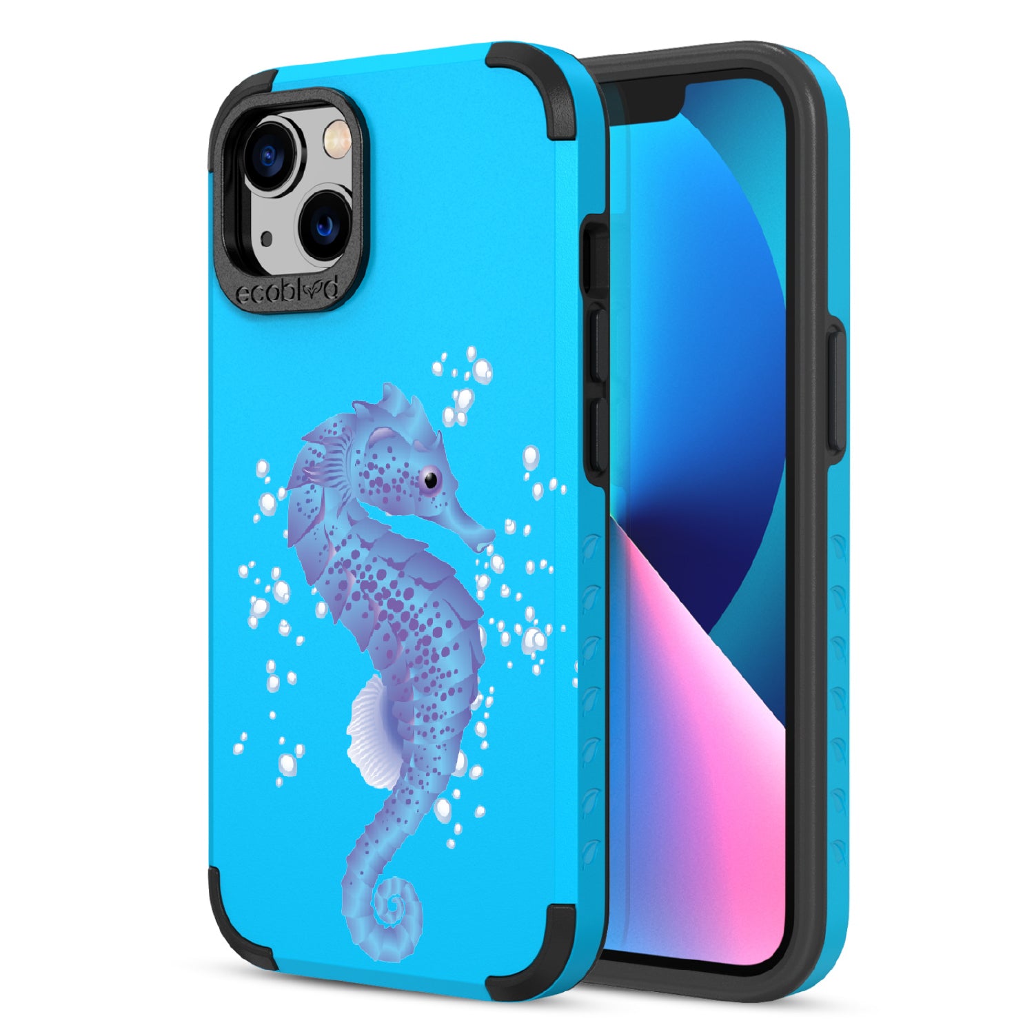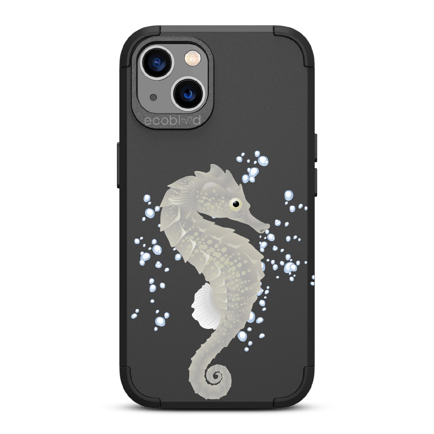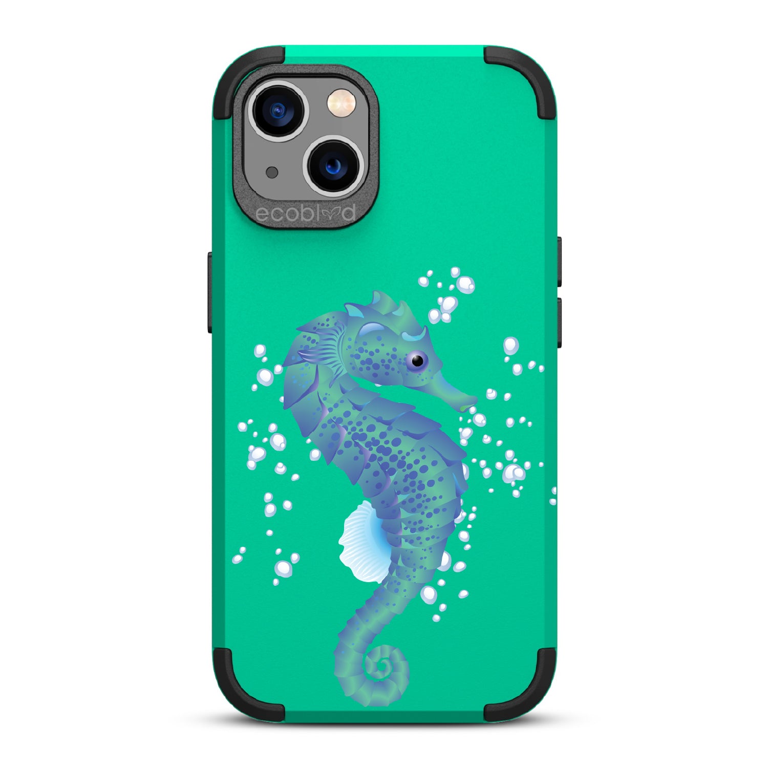 Giddy up and ride the waves with the Gallop of the Sea design on our  Mojave rugged and compostable iPhone 13 phone case.! A seahorse leads the way, prancing through a stream of shimmering bubbles, turning your phone into the ultimate sea steed. With this design, you’re always in the winner’s circle.