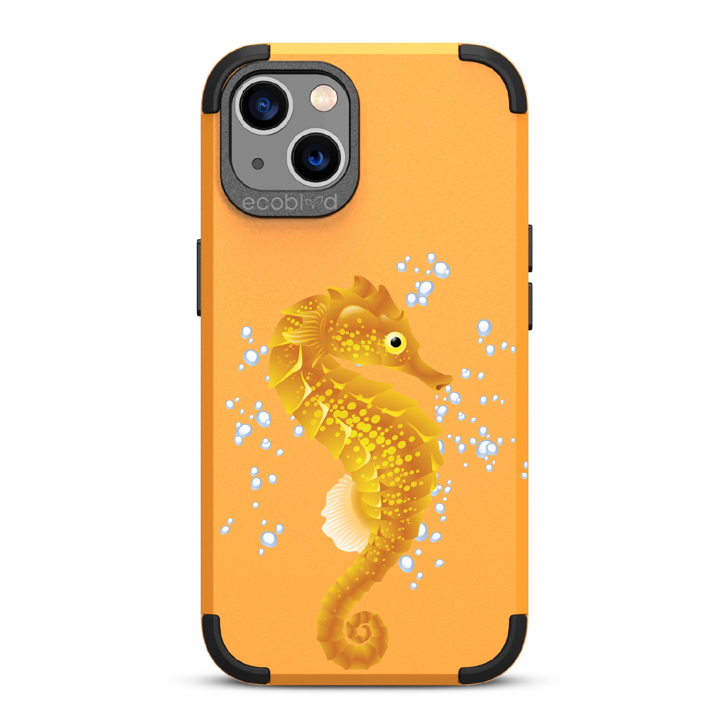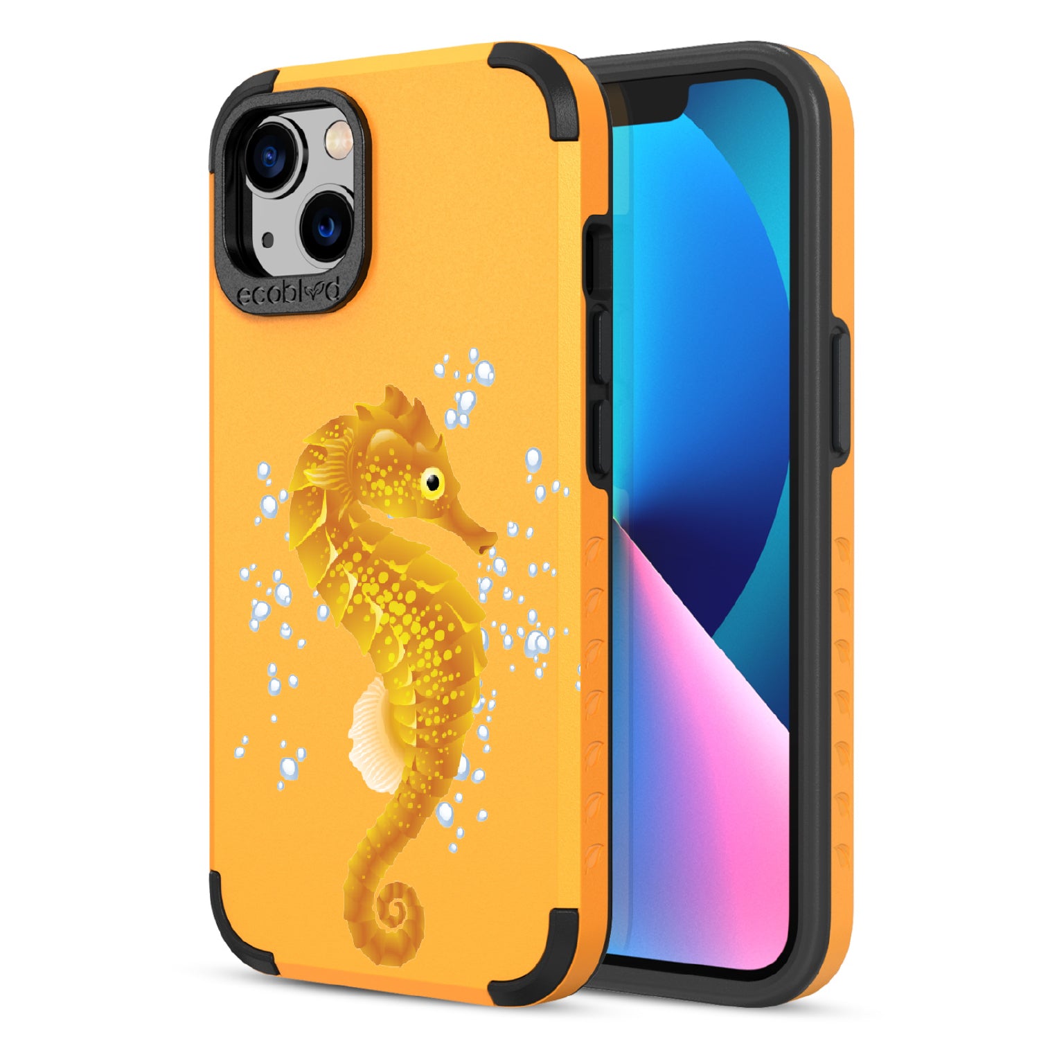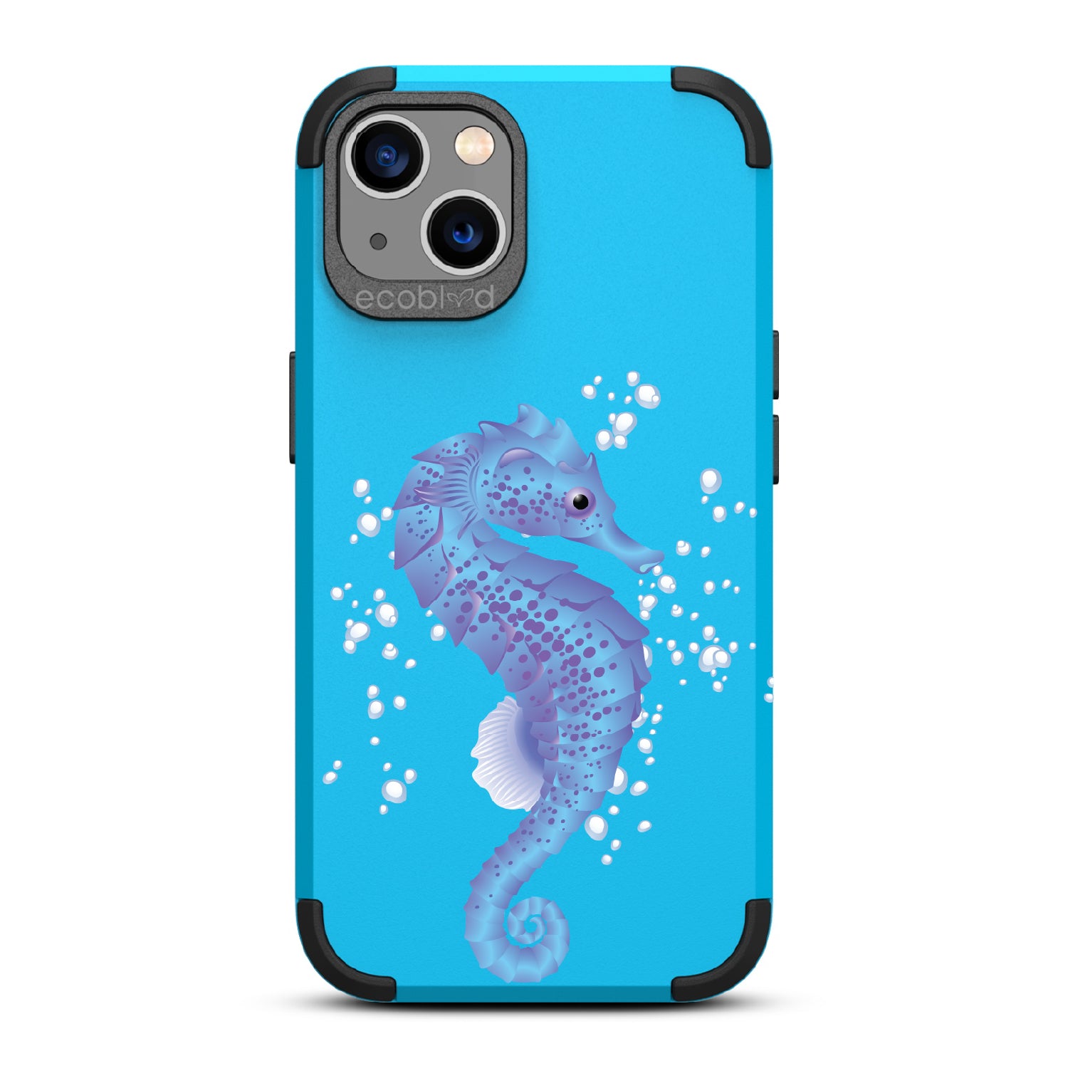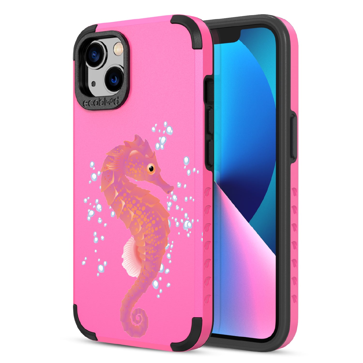 Giddy up and ride the waves with the Gallop of the Sea design on our  Mojave rugged and compostable iPhone 13 phone case.! A seahorse leads the way, prancing through a stream of shimmering bubbles, turning your phone into the ultimate sea steed. With this design, you’re always in the winner’s circle.