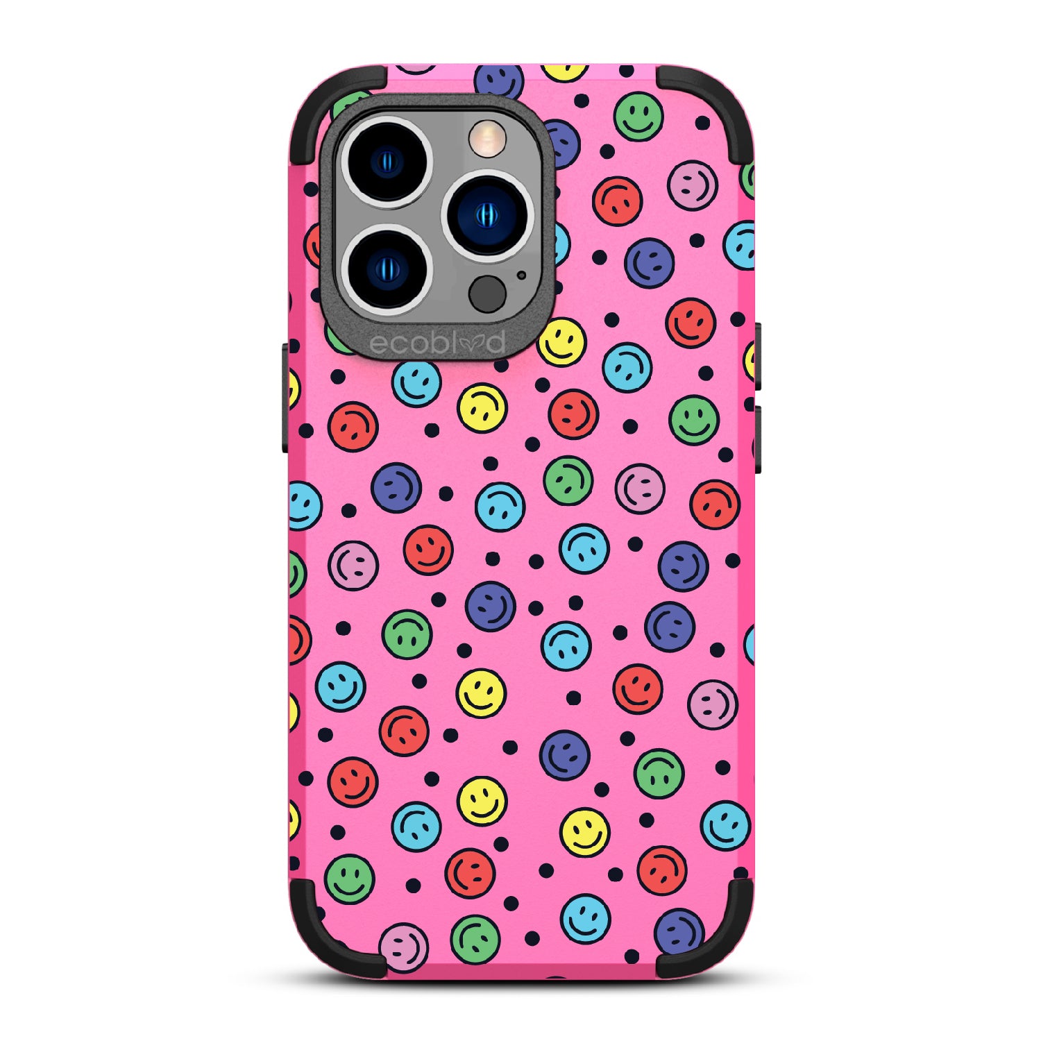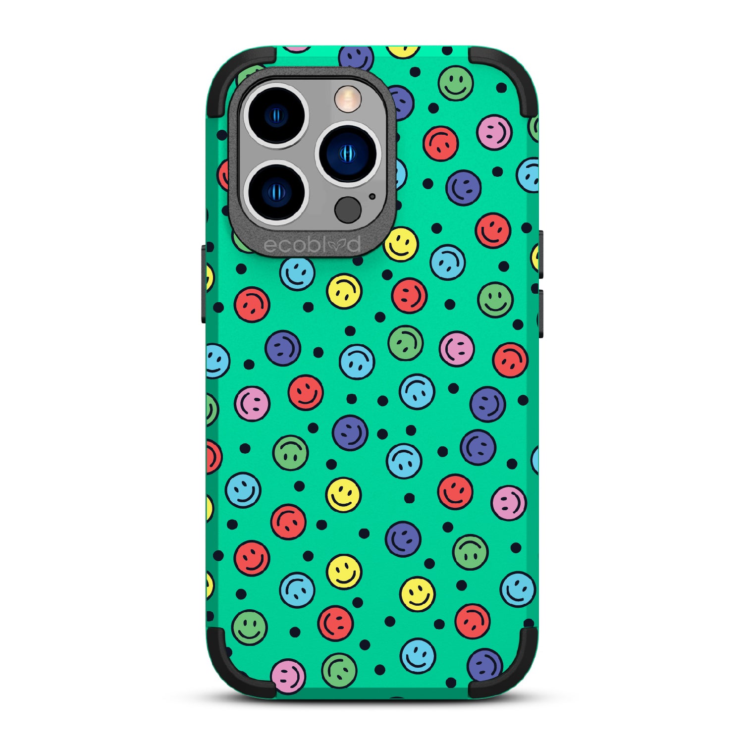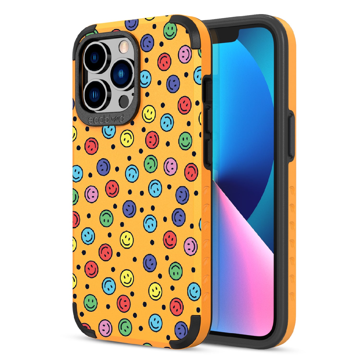 Let the All Smiles phone case design on our Mojave rugged and compostable iPhone 13 Pro case set your mood for the day as its multi-colored smiley faces surround your phone in happiness across five colors: Midnight Black, Cascade Blue, Foliage Green, Illuminating Yellow, and Wildflower Pink.