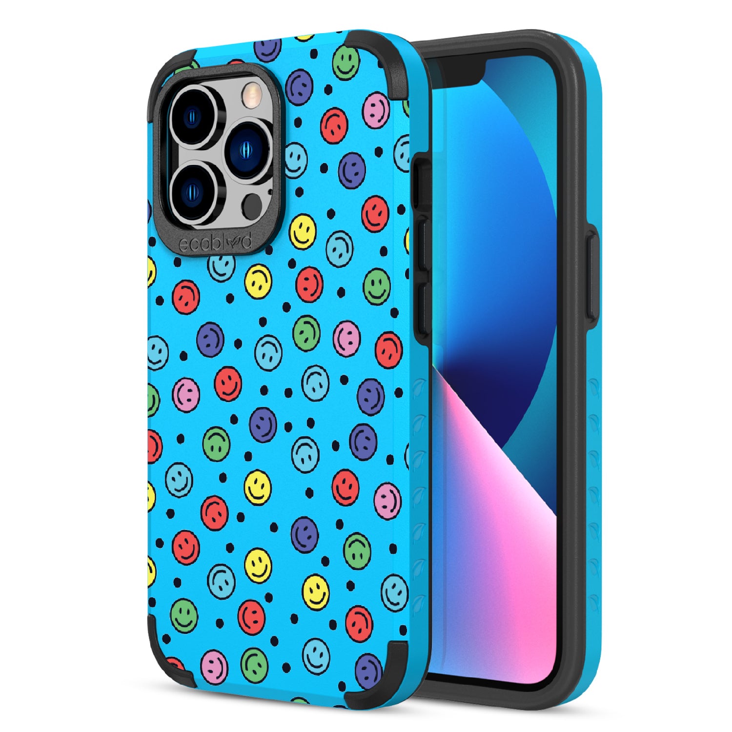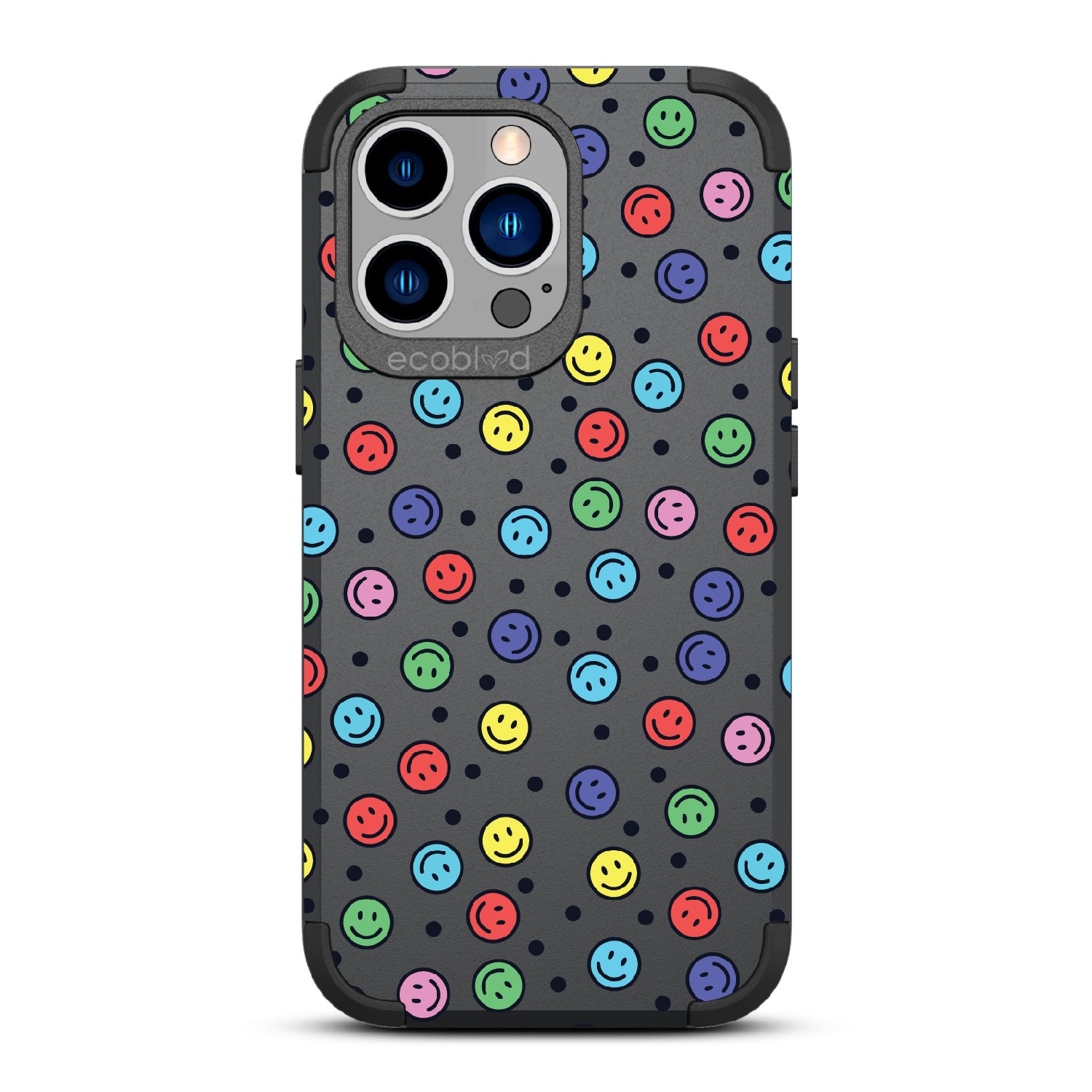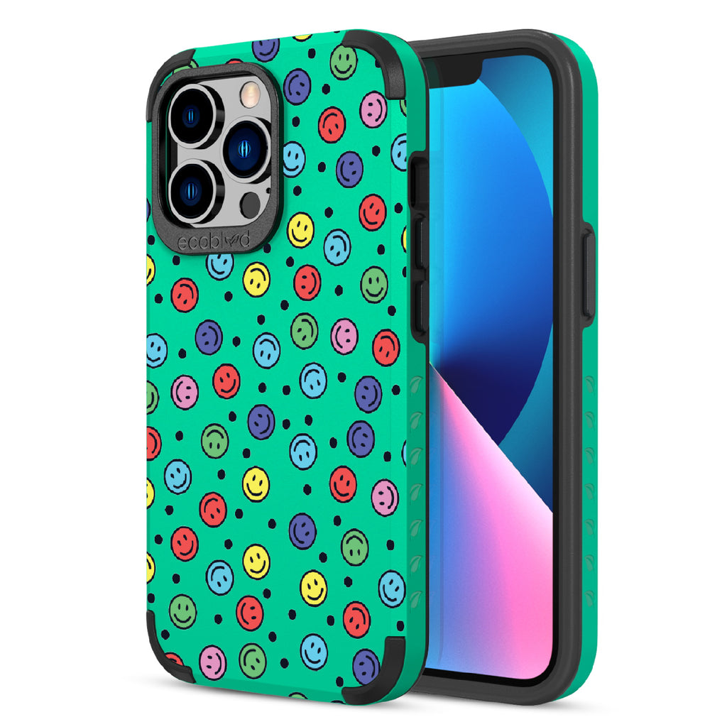 Let the All Smiles phone case design on our Mojave rugged and compostable iPhone 13 Pro case set your mood for the day as its multi-colored smiley faces surround your phone in happiness across five colors: Midnight Black, Cascade Blue, Foliage Green, Illuminating Yellow, and Wildflower Pink.
