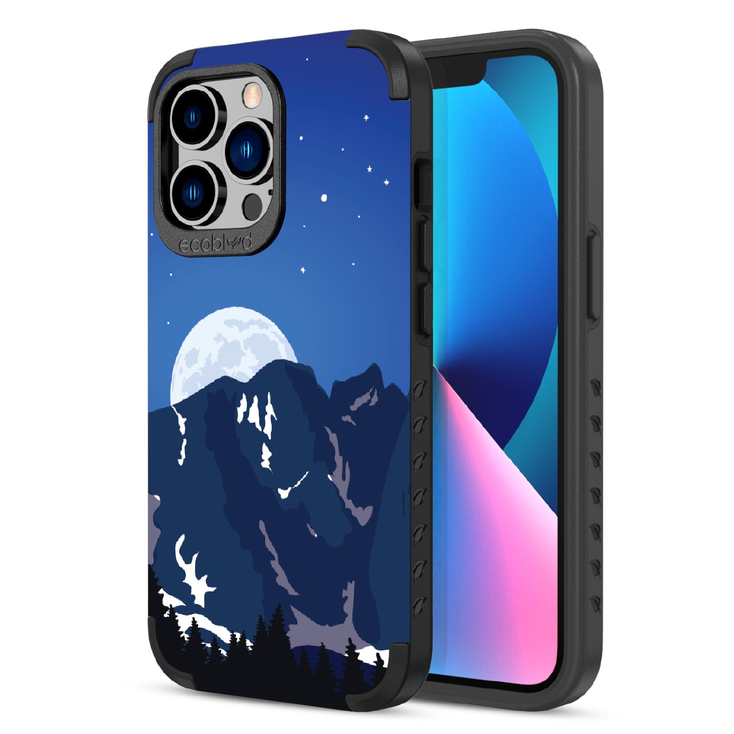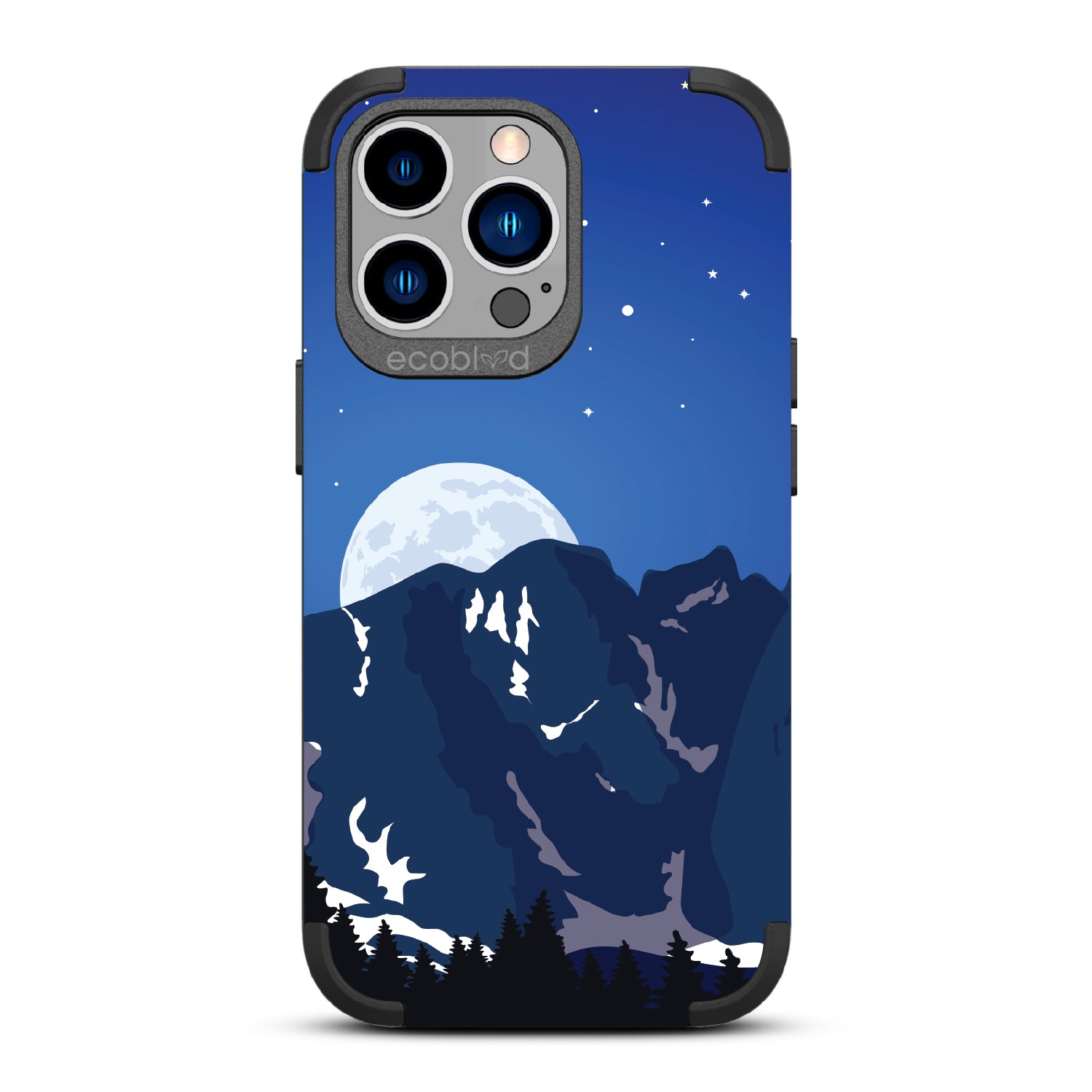 Bask in the ethereal glow of our Alpine Moon design on our Mojave rugged iPhone 13 Pro case, where the moon hangs like a luminous pearl against the velvet canvas of the night sky, casting its soft radiance upon the rugged terrain below.