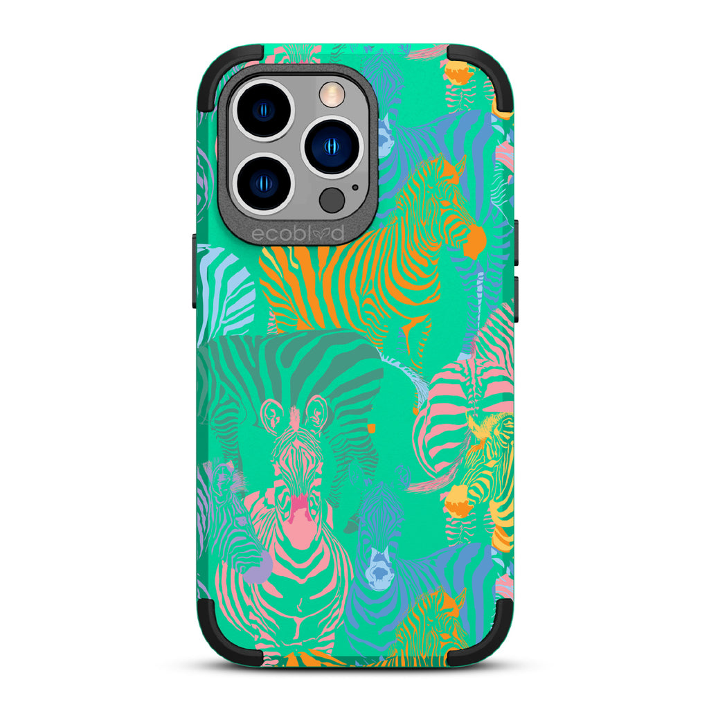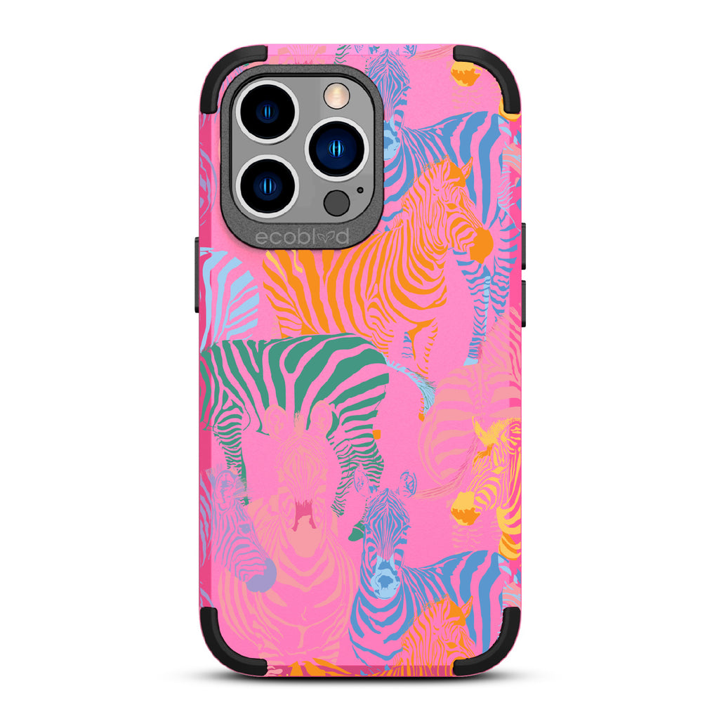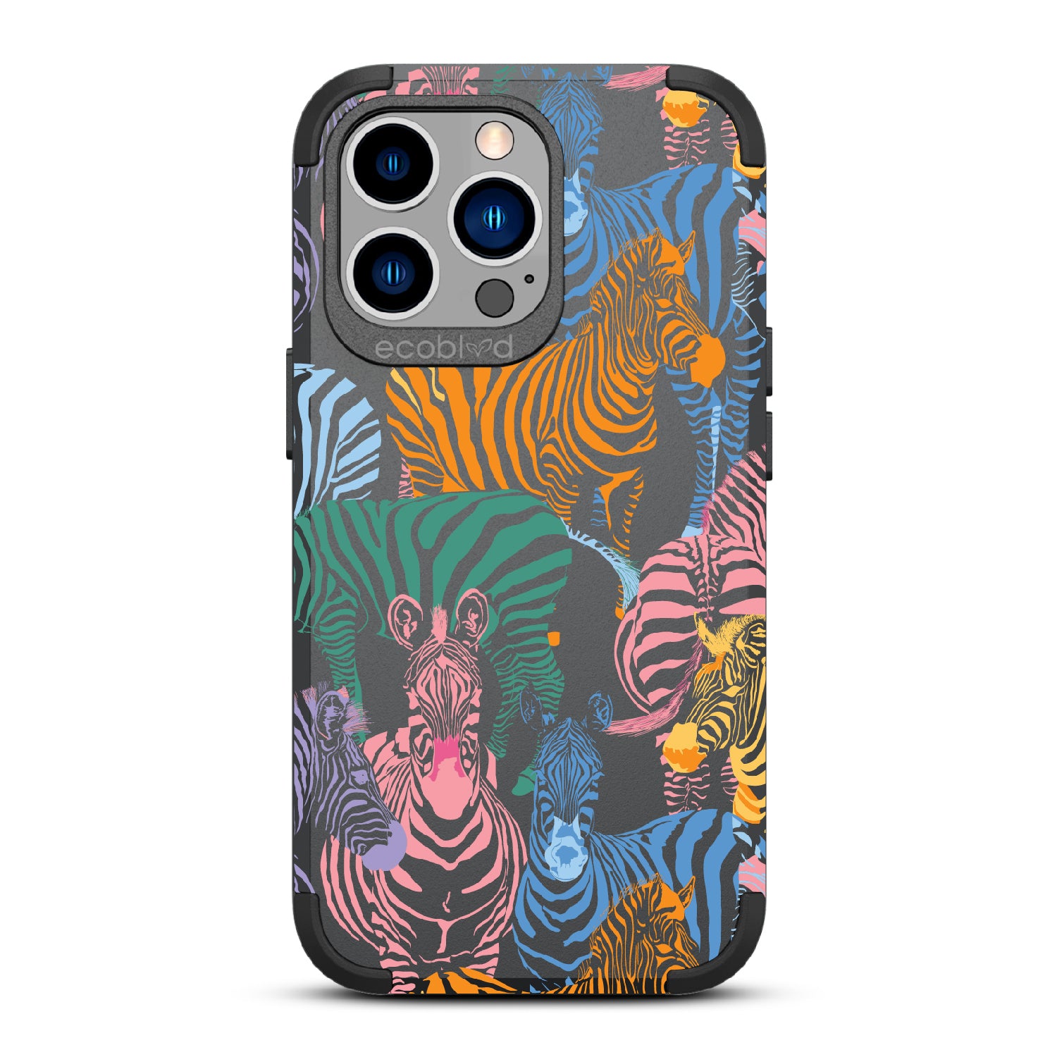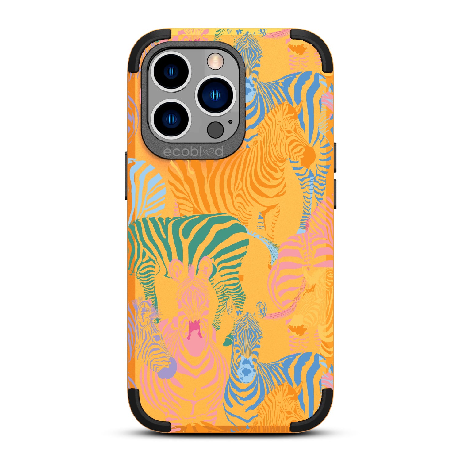 Unleash your inner zebra and join the Colorful Herd design on our Mojave rugged and compostable iPhone 13 Pro case. Embrace the vibrant beauty of zebras adorned in the colors of the rainbow as they become your style statement, radiating confidence, individuality, and a celebration of diversity while supporting ocean conservation efforts. Show off your true colors with the Colorful Herd phone case. This design is perfect for those who embrace their individuality and aren't afraid to stand out from the herd in five captivating colors: Midnight Black, Cascade Blue, Foliage Green, Illuminating Yellow, and Wildflower Pink. With this phone case, you carry with you a powerful reminder to stand out with pride, embracing the vibrant and untamed spirit within while celebrating the beauty of diversity and unity.