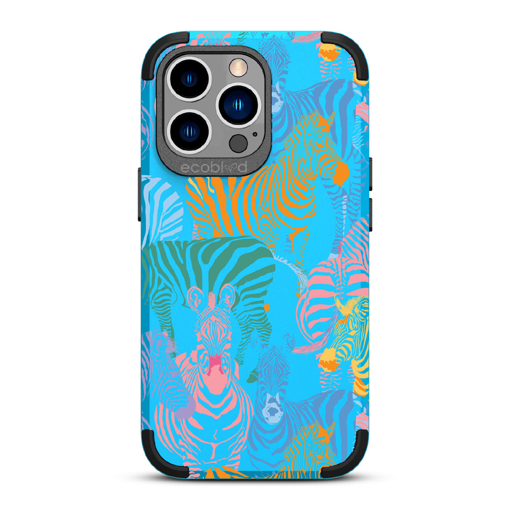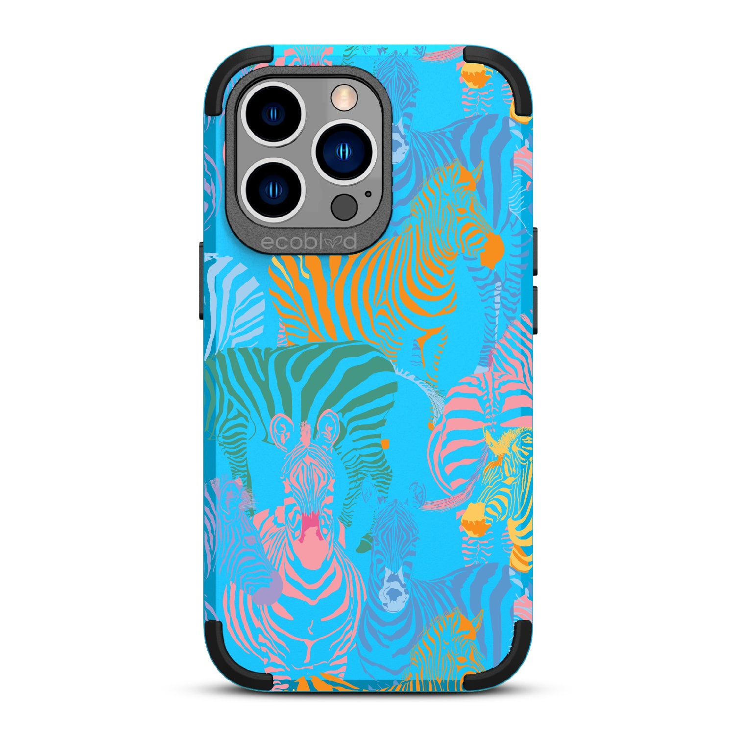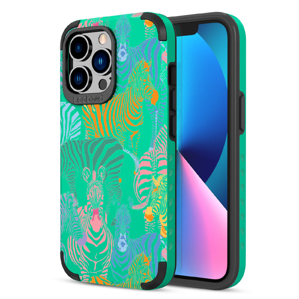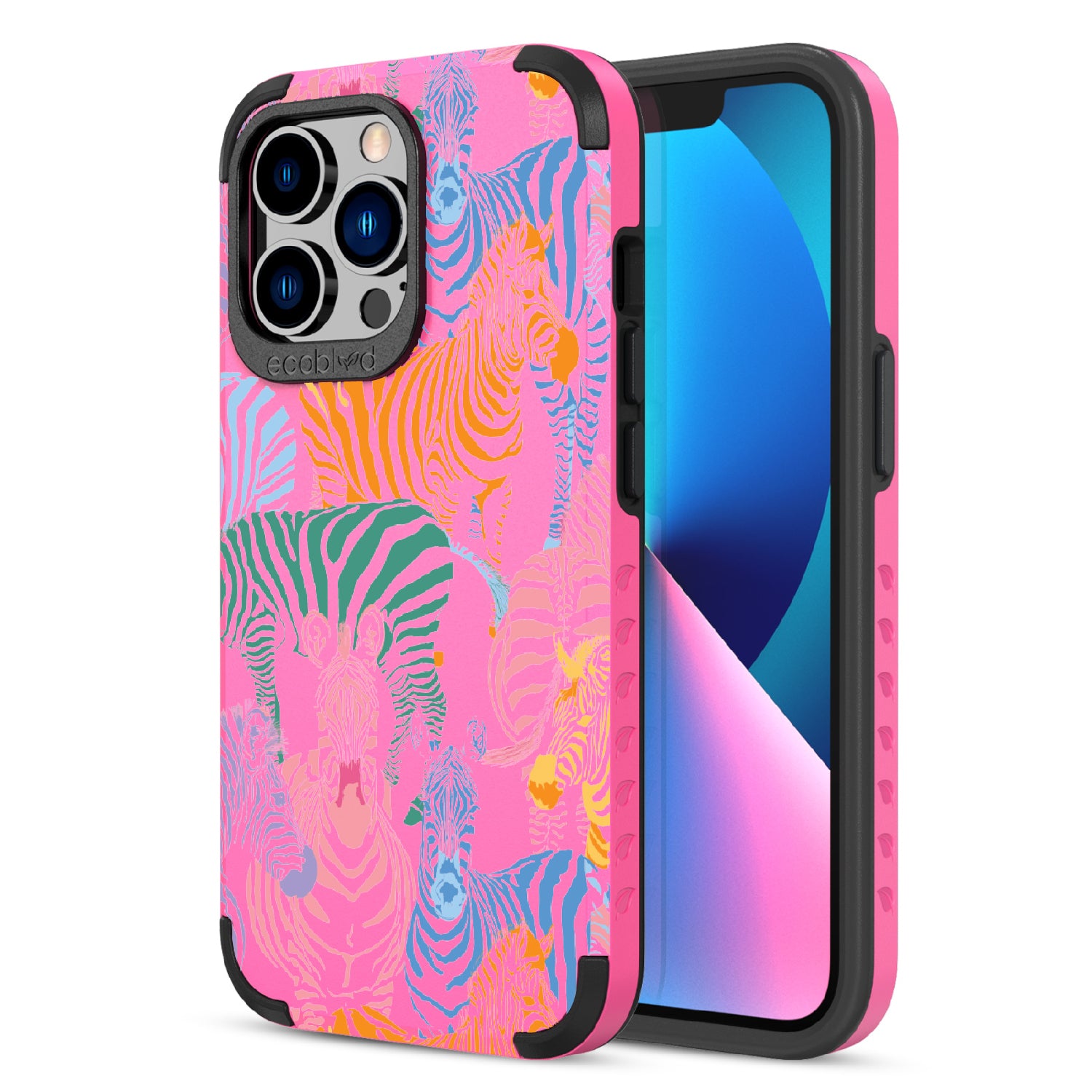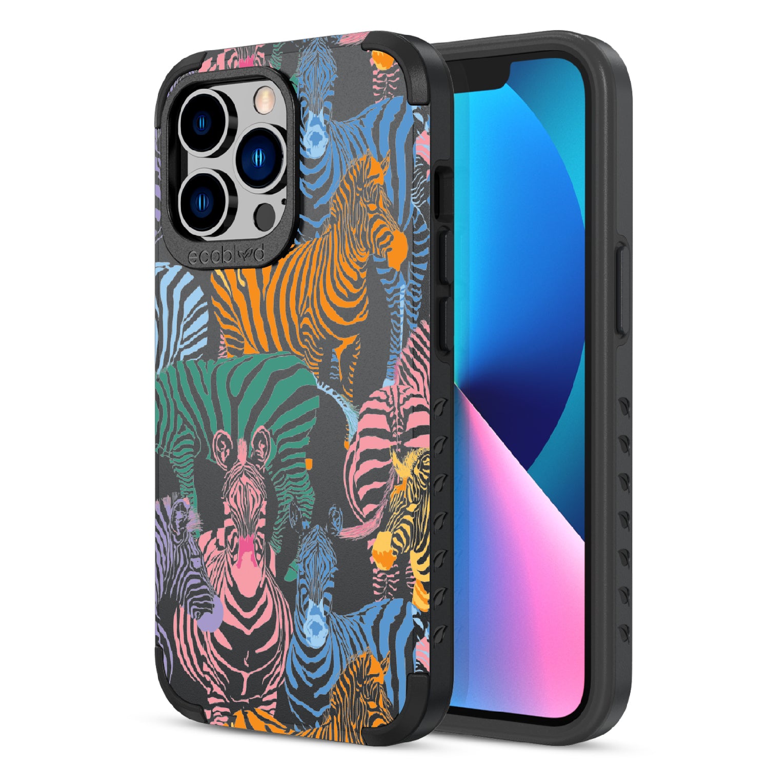 Unleash your inner zebra and join the Colorful Herd design on our Mojave rugged and compostable iPhone 13 Pro case. Embrace the vibrant beauty of zebras adorned in the colors of the rainbow as they become your style statement, radiating confidence, individuality, and a celebration of diversity while supporting ocean conservation efforts. Show off your true colors with the Colorful Herd phone case. This design is perfect for those who embrace their individuality and aren't afraid to stand out from the herd in five captivating colors: Midnight Black, Cascade Blue, Foliage Green, Illuminating Yellow, and Wildflower Pink. With this phone case, you carry with you a powerful reminder to stand out with pride, embracing the vibrant and untamed spirit within while celebrating the beauty of diversity and unity.