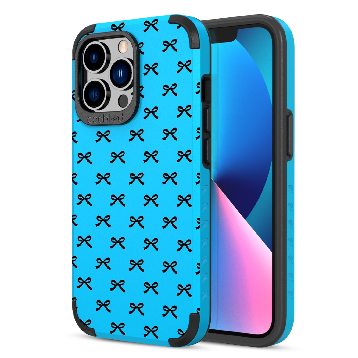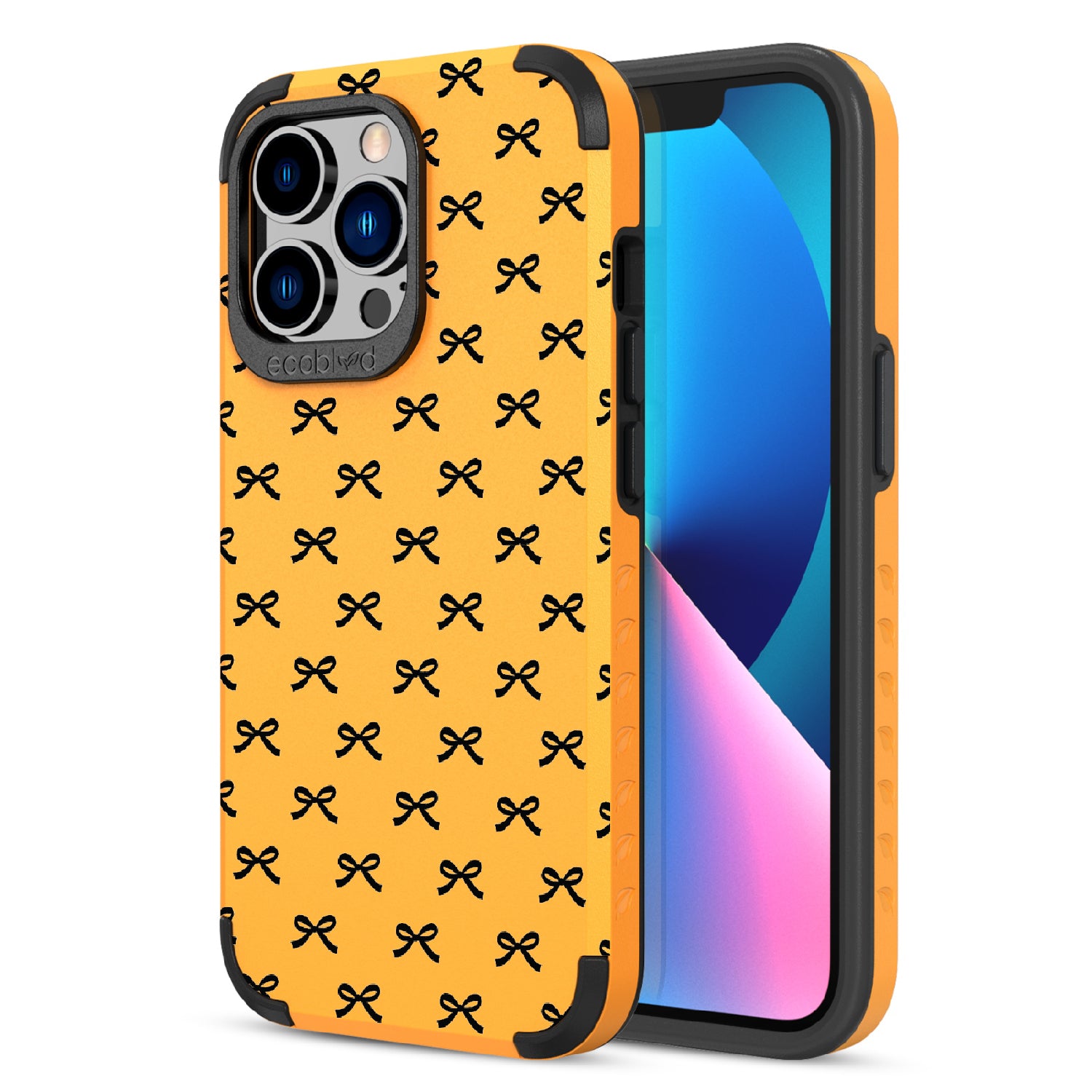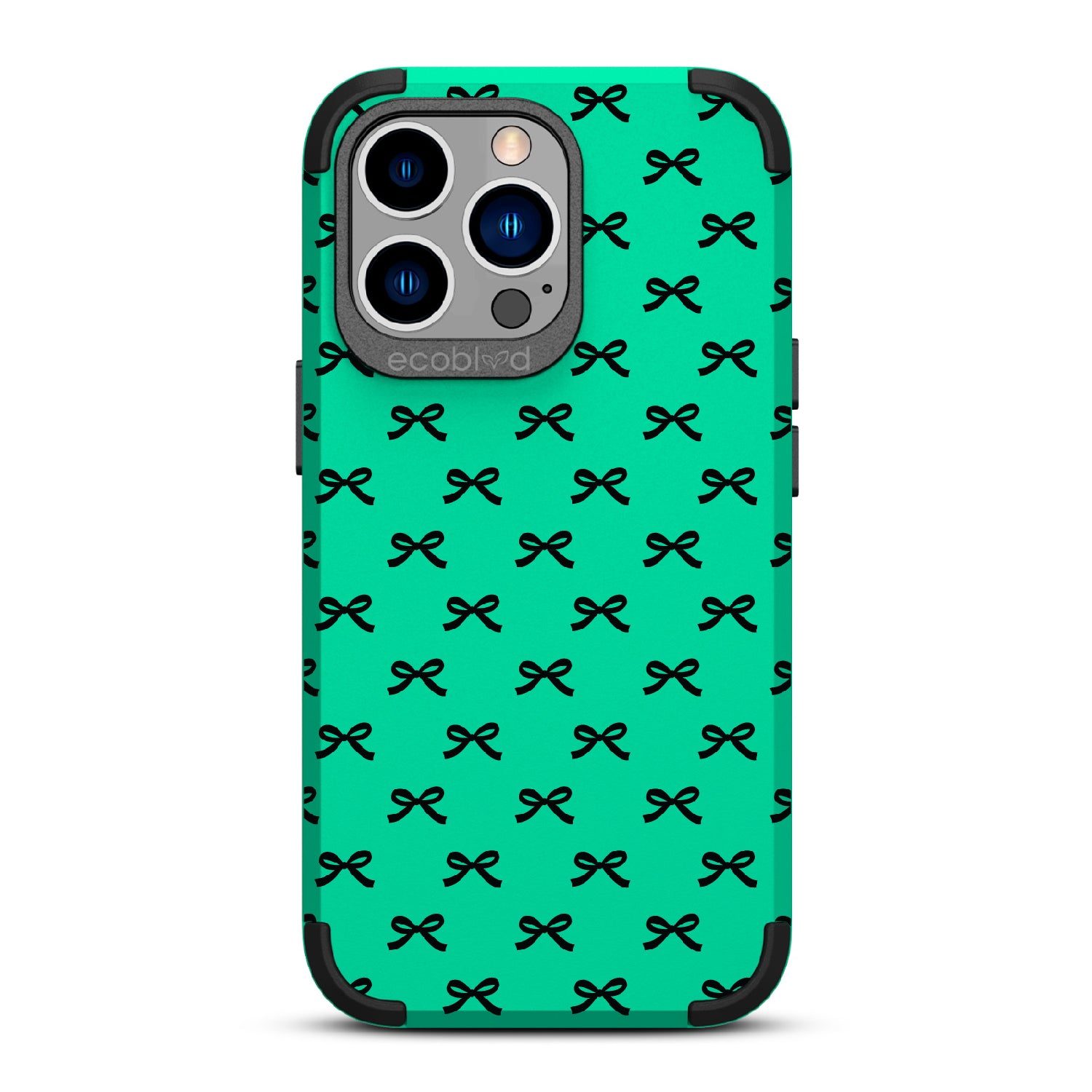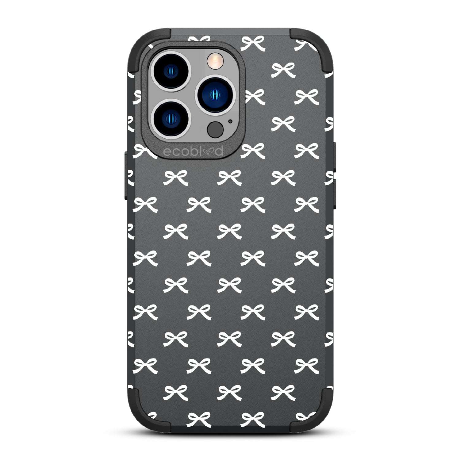 Get all dressed up to adorn and adore with the Coquette design on our Mojave rugged and compostable iPhone 13 Pro case. Let the cute black bows be the stars of the show, gracing your phone with their dainty presence. As you hold your device, you'll feel the subtle embrace of everlasting bonds formed by each dainty knot, creating a sense of feminine connection and girlhood that goes beyond mere aesthetics.