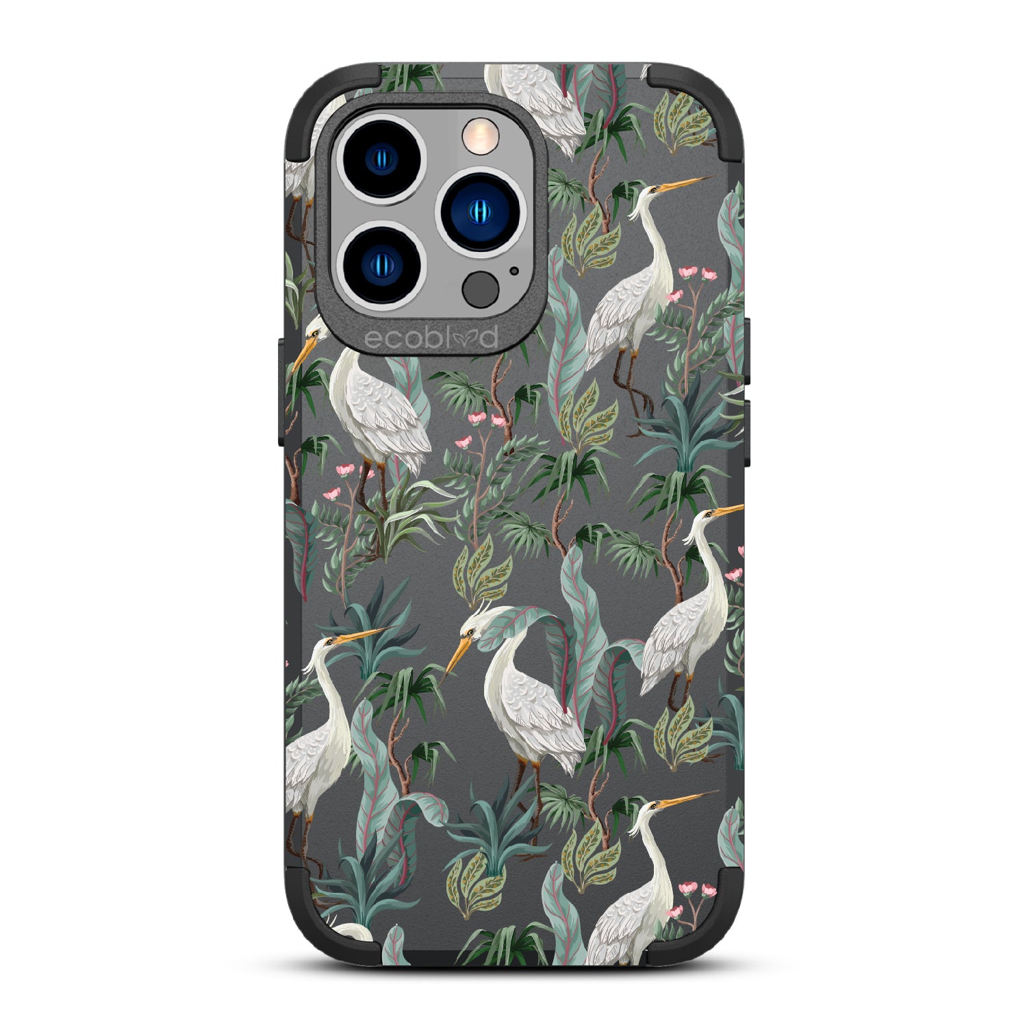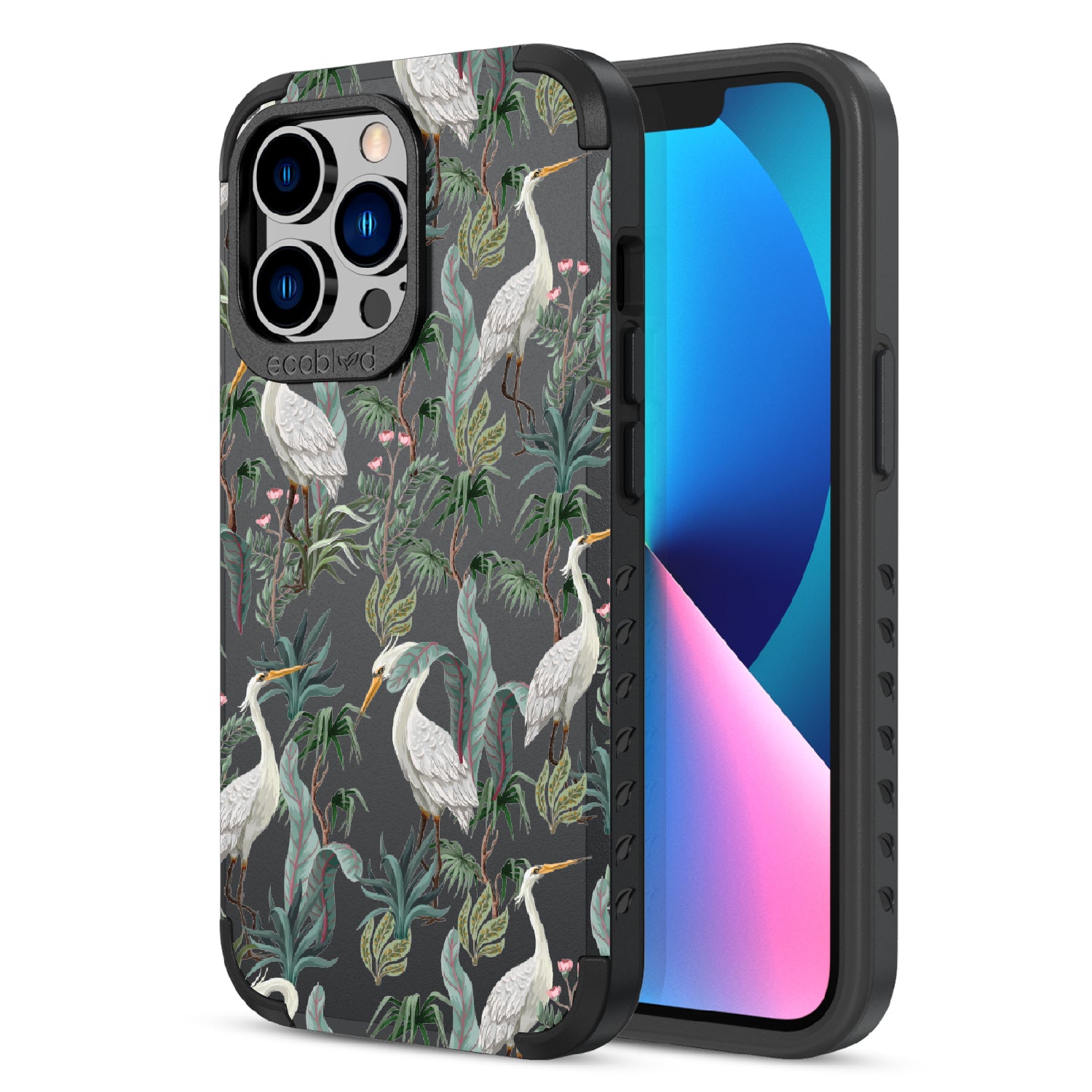 Embrace the strength and beauty of sticking together with Flock Together design on our Mojave rugged and compostable iPhone 13 Pro case. Immerse yourself in impeccable style and protection while supporting ocean conservation efforts, as elegant heron birds and intricate peonies come together in perfect harmony. Flock Together is more than just a name, it's a powerful message of togetherness and unity. Featuring elegant heron birds and intricate peonies, this design inspires us to embrace our connections and appreciate the beauty that comes with standing together on our Midnight Black colorway.