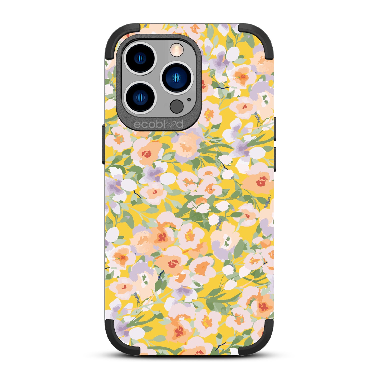 The sun paints with light, and flowers carry the glow. The Flourish & Shine design on our Mojave rugged and compostable iPhone 13 Pro case blends sweeping yellows, peachy petals, and airy greens in soft, expressive brushstrokes. A composition that radiates warmth, movement, and the quiet brilliance of nature’s palette.