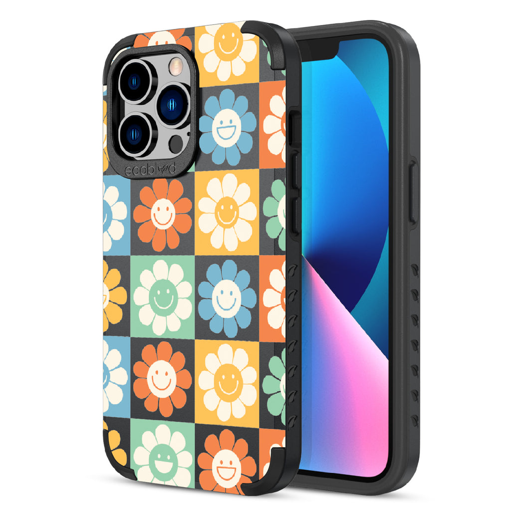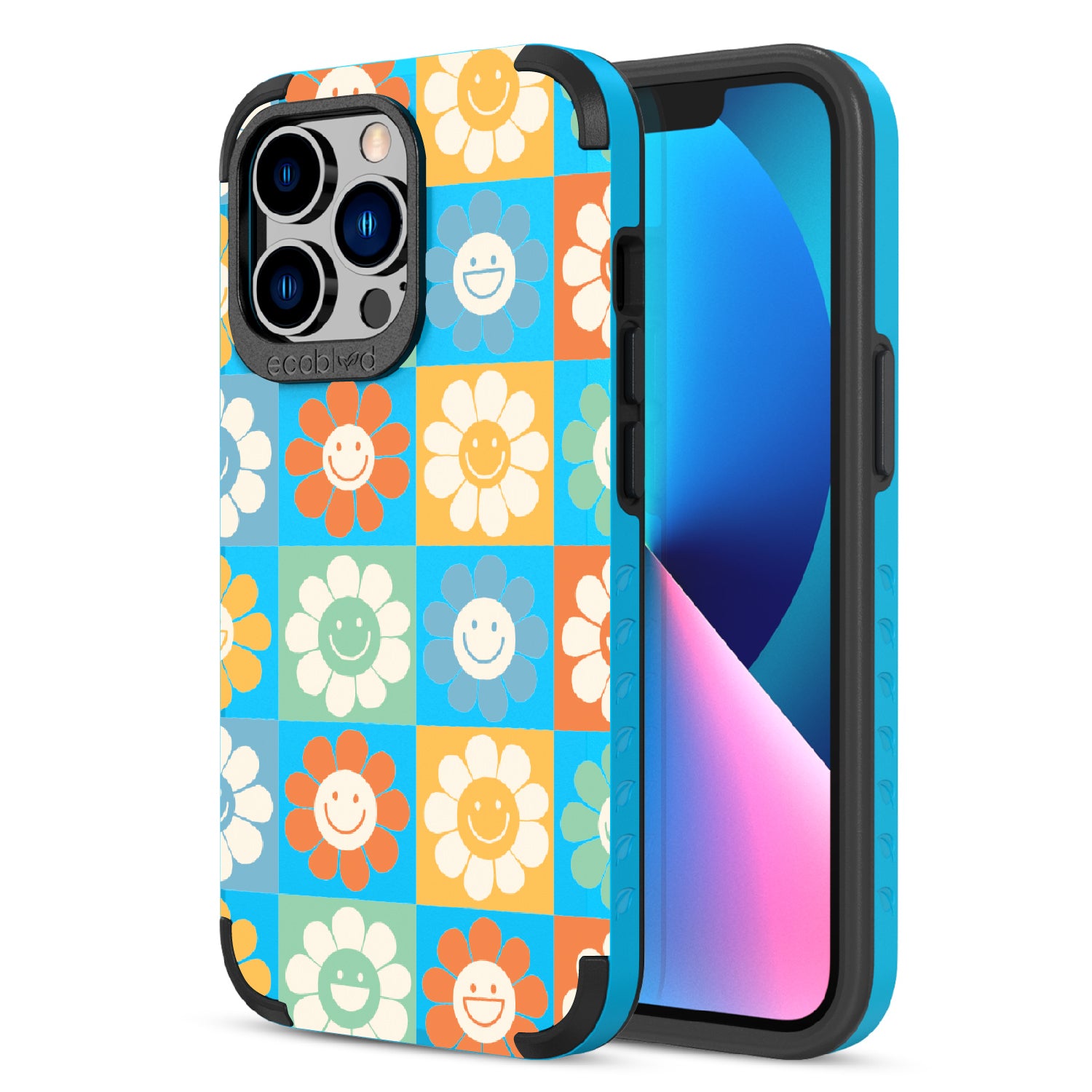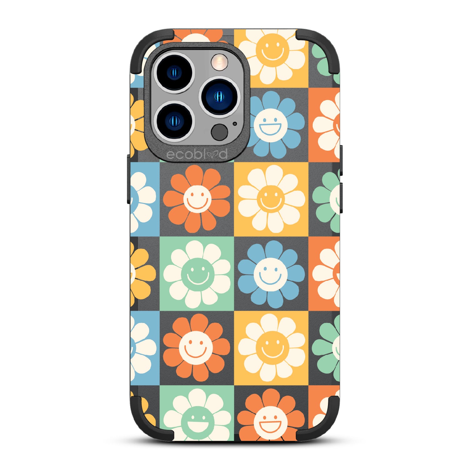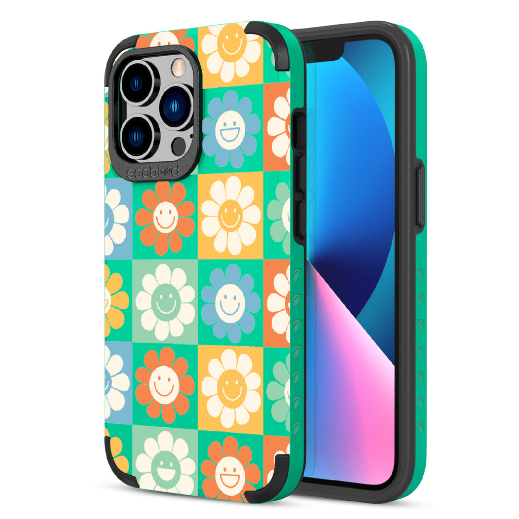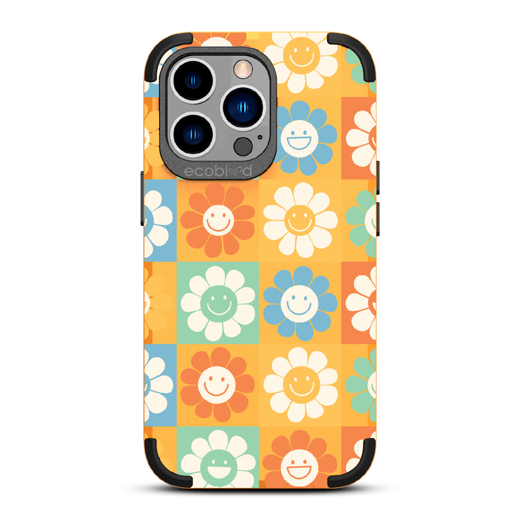 Let the Flower Power design on our Mojave rugged and compostable iPhone 13 Pro case be your symbol of hope and optimism, with its vibrant cartoon flowers and upbeat smiley faces that embody the spirit of the '70s and remind you to embrace the power of love and positivity in all aspects of your life. Available in four groovy colorways: Midnight Black, Cascade Blue, Foliage Green, and Illuminating Yellow.