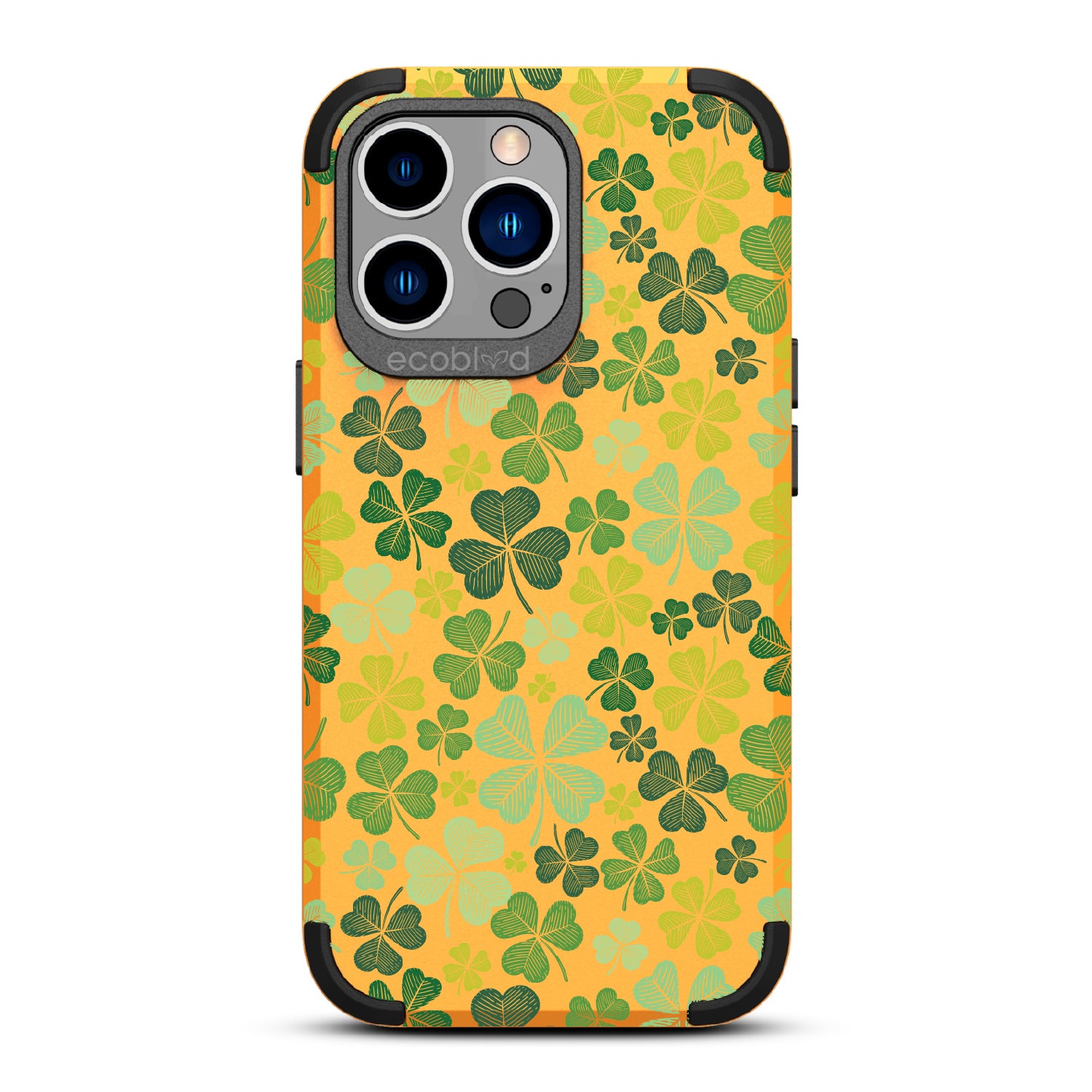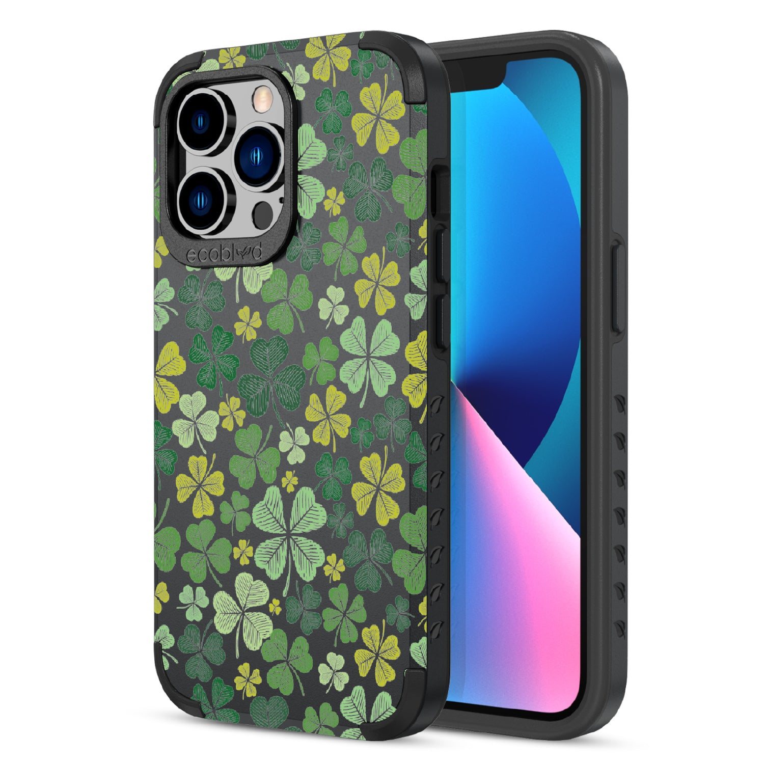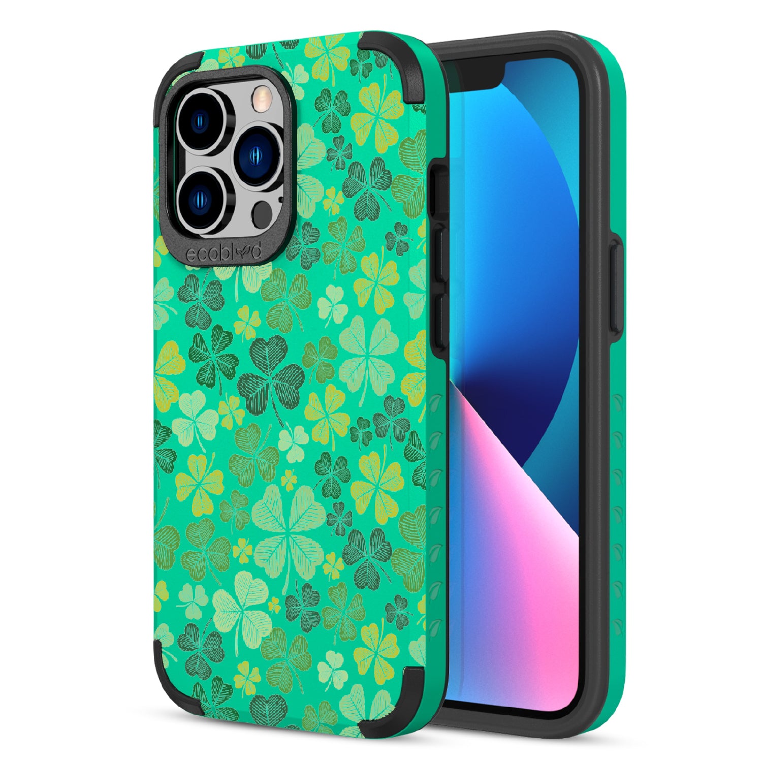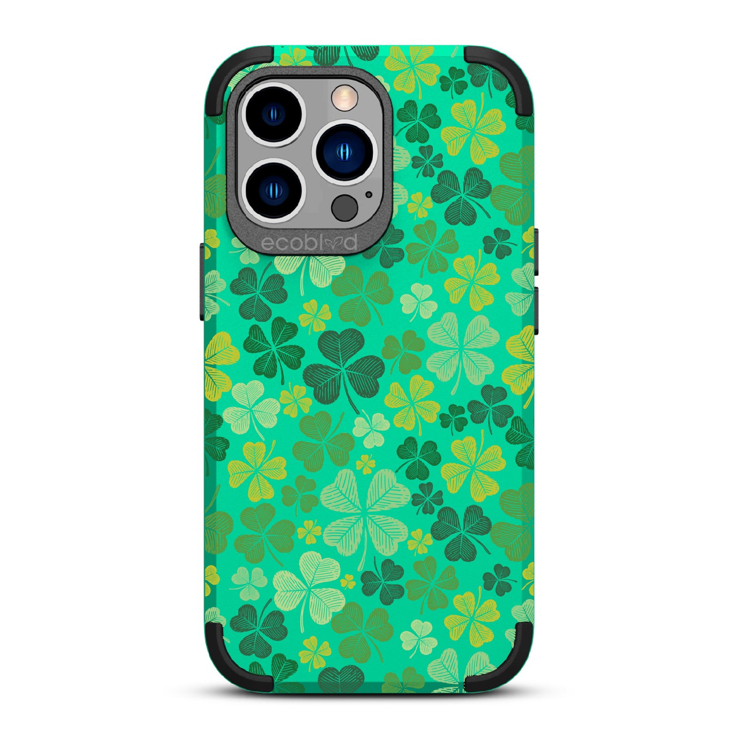 Turn your luck around with the vibrant Shamrock design on our Mojave rugged and compostable iPhone 13 Pro case, where every leaf whispers tales of fortune and fate. Adorned with a sea of green four-leaf clovers, this design is a true emblem of luck, designed to bring a touch of charm.