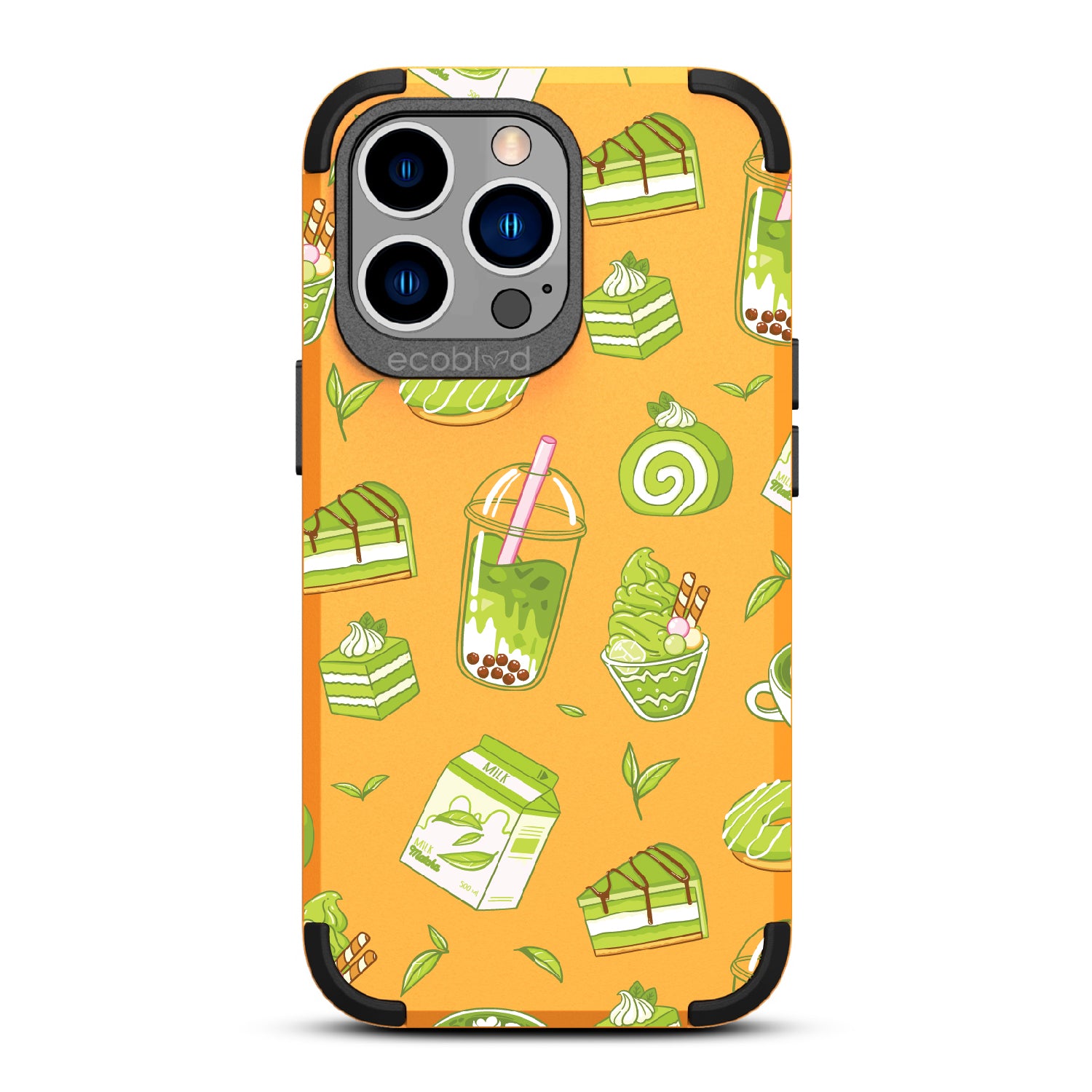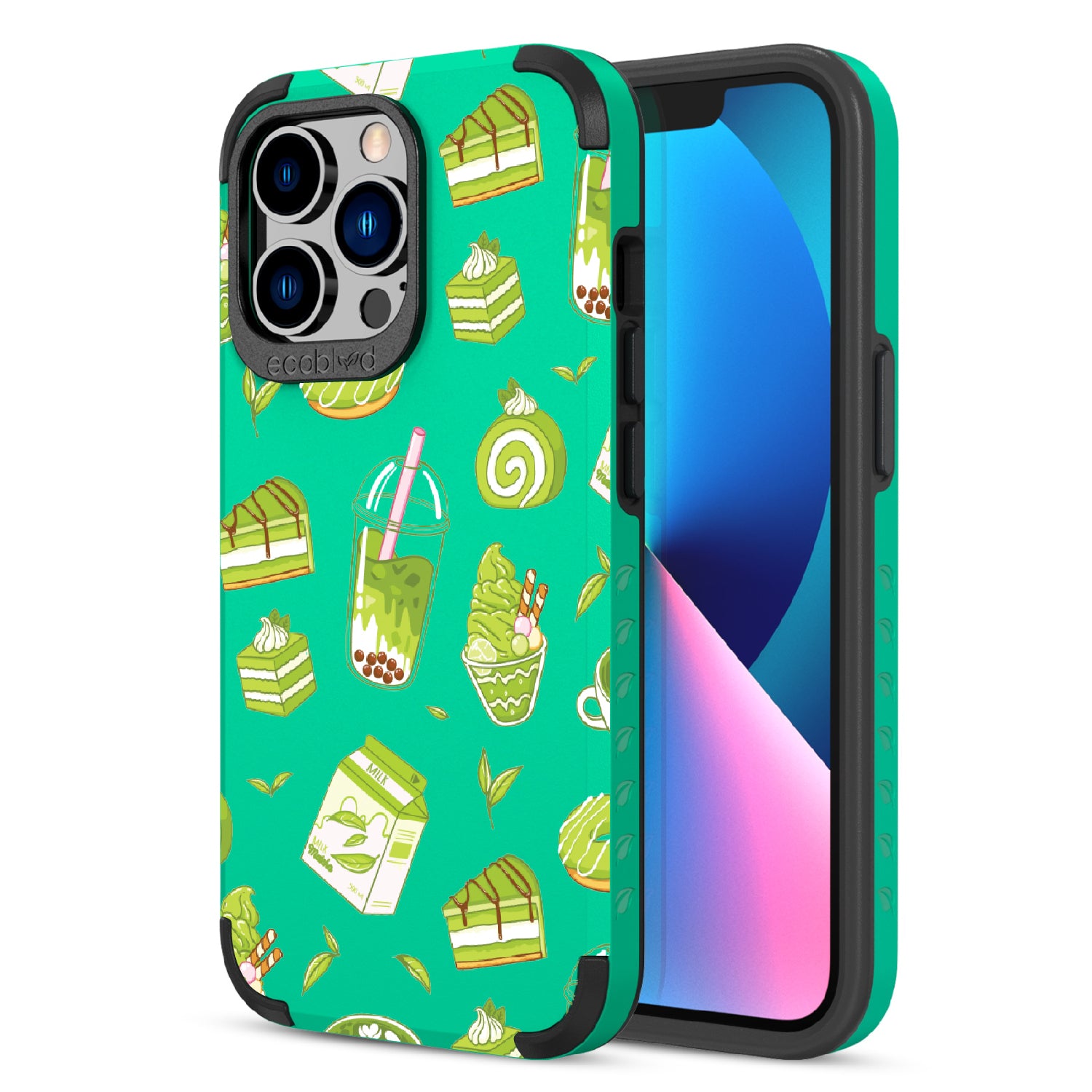 Ice cream and boba, cake, milk, and so matcha more! Overflowing with matcha flavor, this design on our Mojave rugged and compostable iPhone 13 Pro case! brings you a perfect blend of your favorite green treats. Because who ever said there was such a thing as too much matcha?