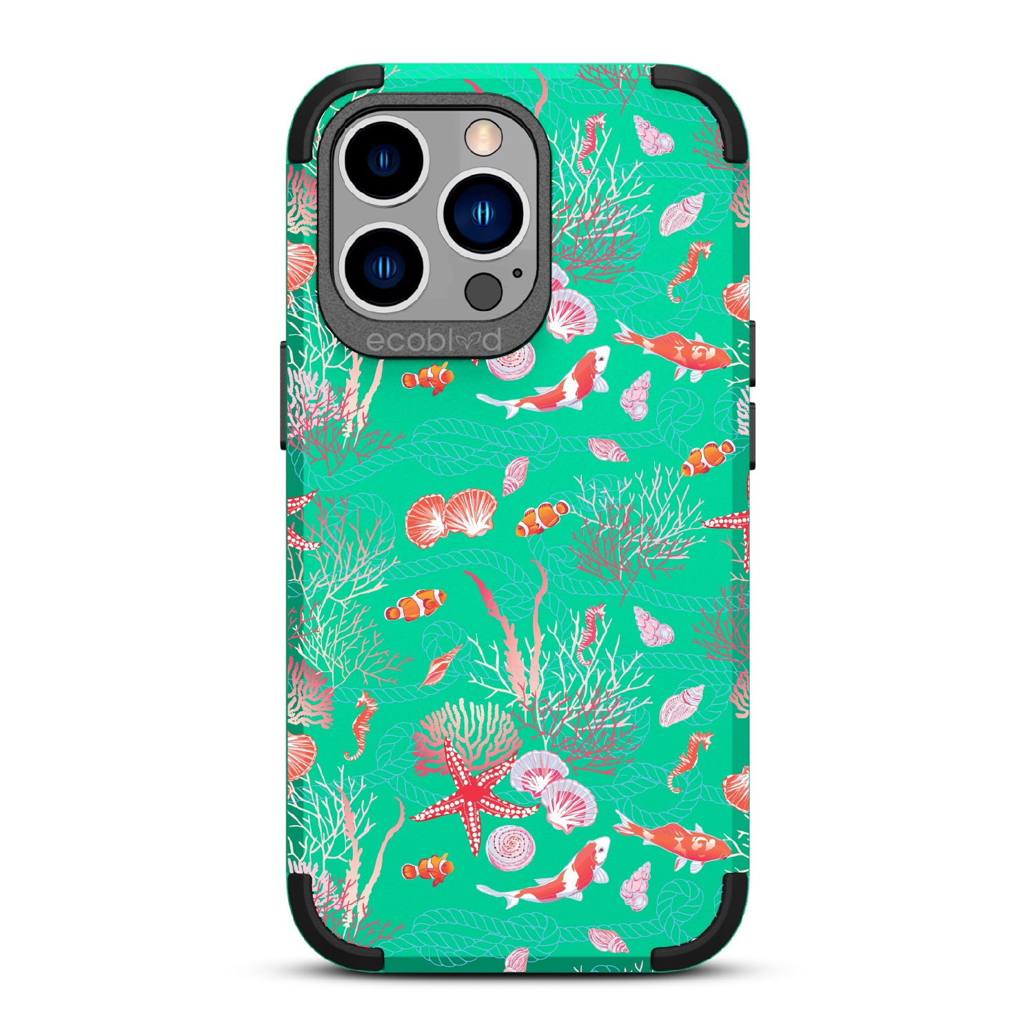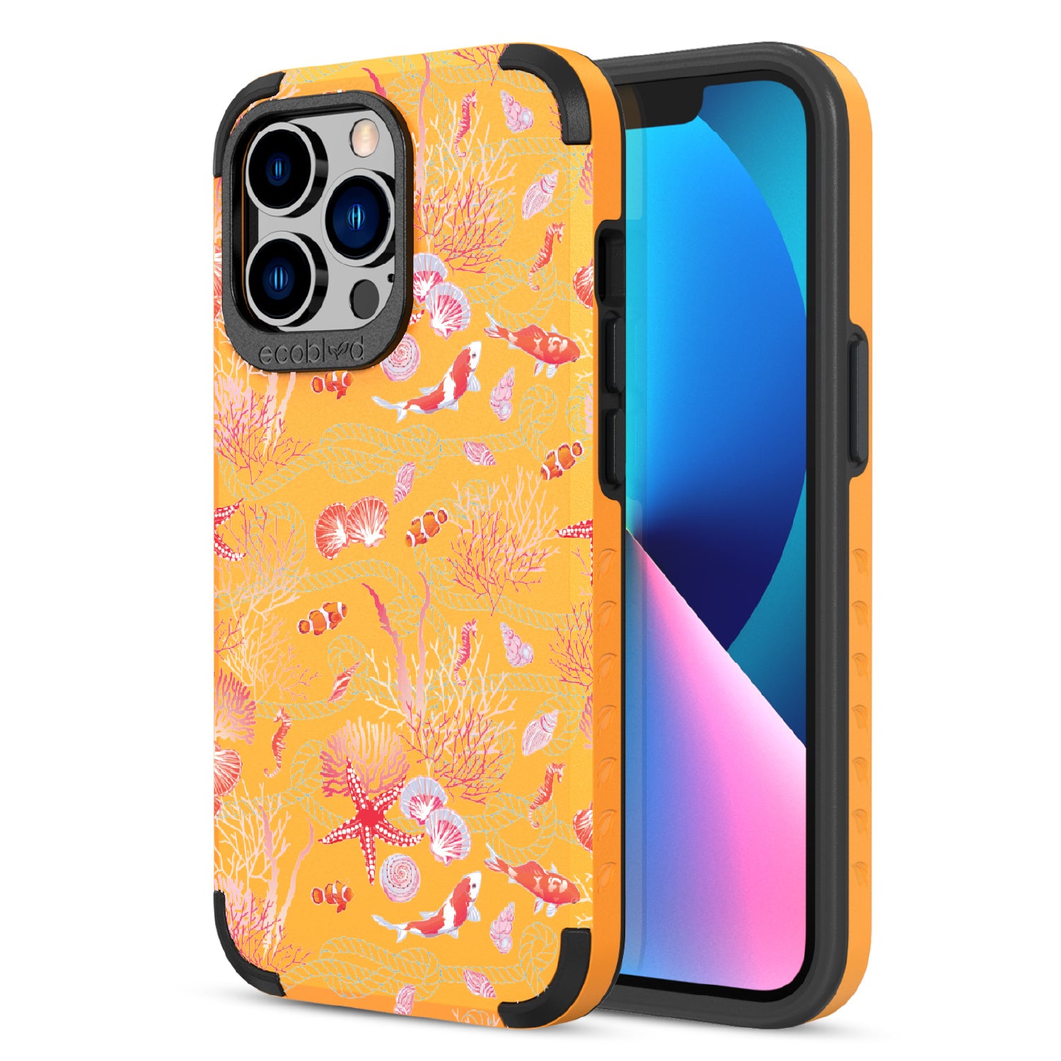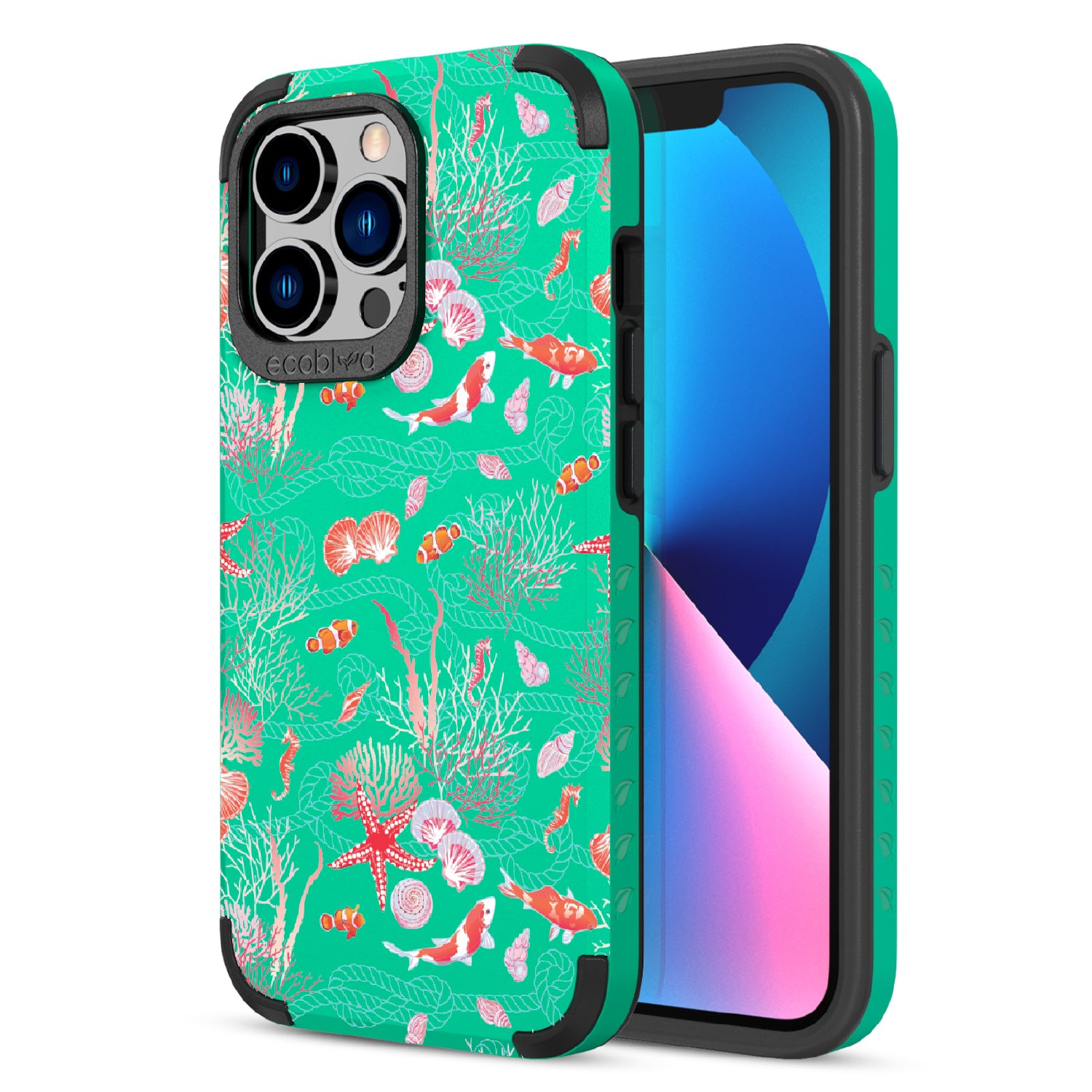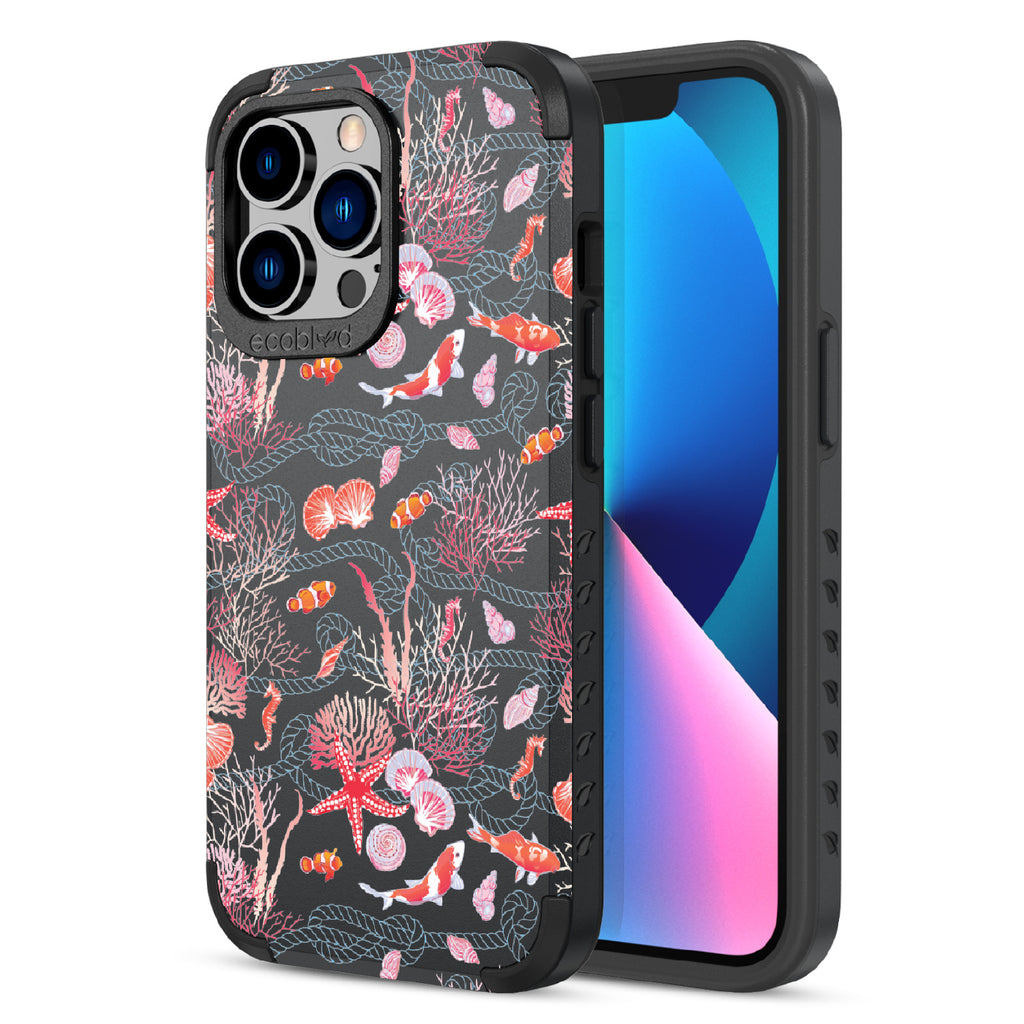 The coral is always brighter, Under the Sea! With this design our Mojave rugged and compostable iPhone 13 Pro phone case, you'll see, your phone’s full of glee, under the sea! Coral and critters, they all come together, swirling in hues, pinks, and blues, where life’s better wetter, take it from me! Your phone will be dancing, twirling, and prancing, carrying the magic of the ocean so fancy! So let your phone be, full of joy and glee, under the sea.