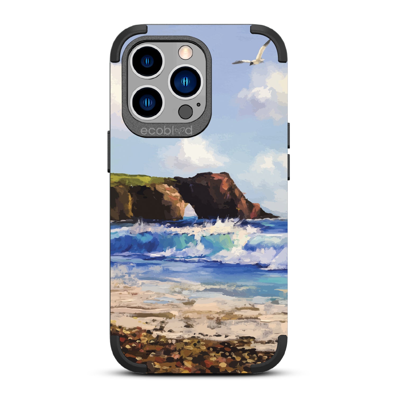 The calm before…. The Cliffhanger design on our Mojave rugged and compostable iPhone 13 Pro case holds a moment of painted suspense—brushed cliffs, churning tides, and a palette that builds to the brink. A story captured at its turning point.
