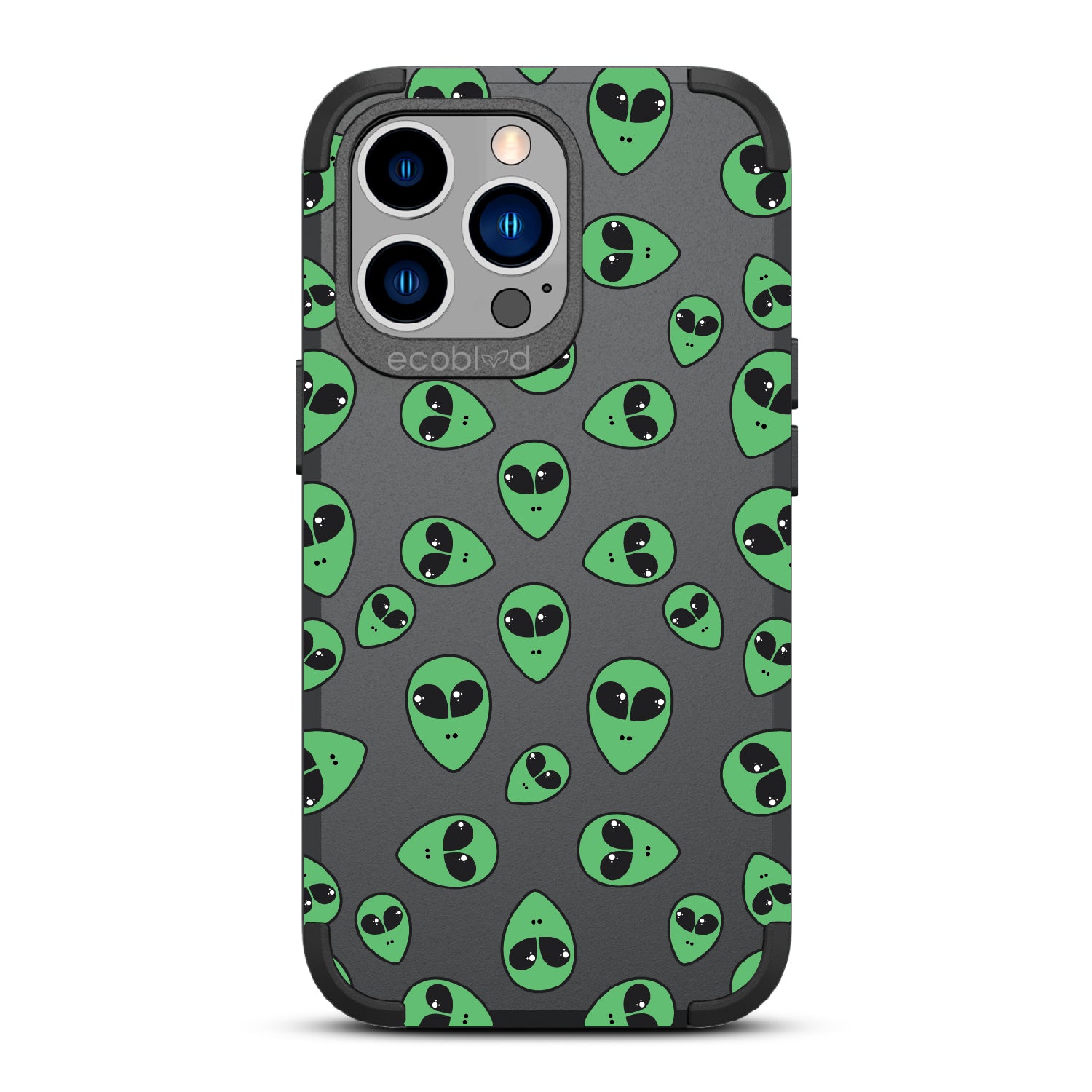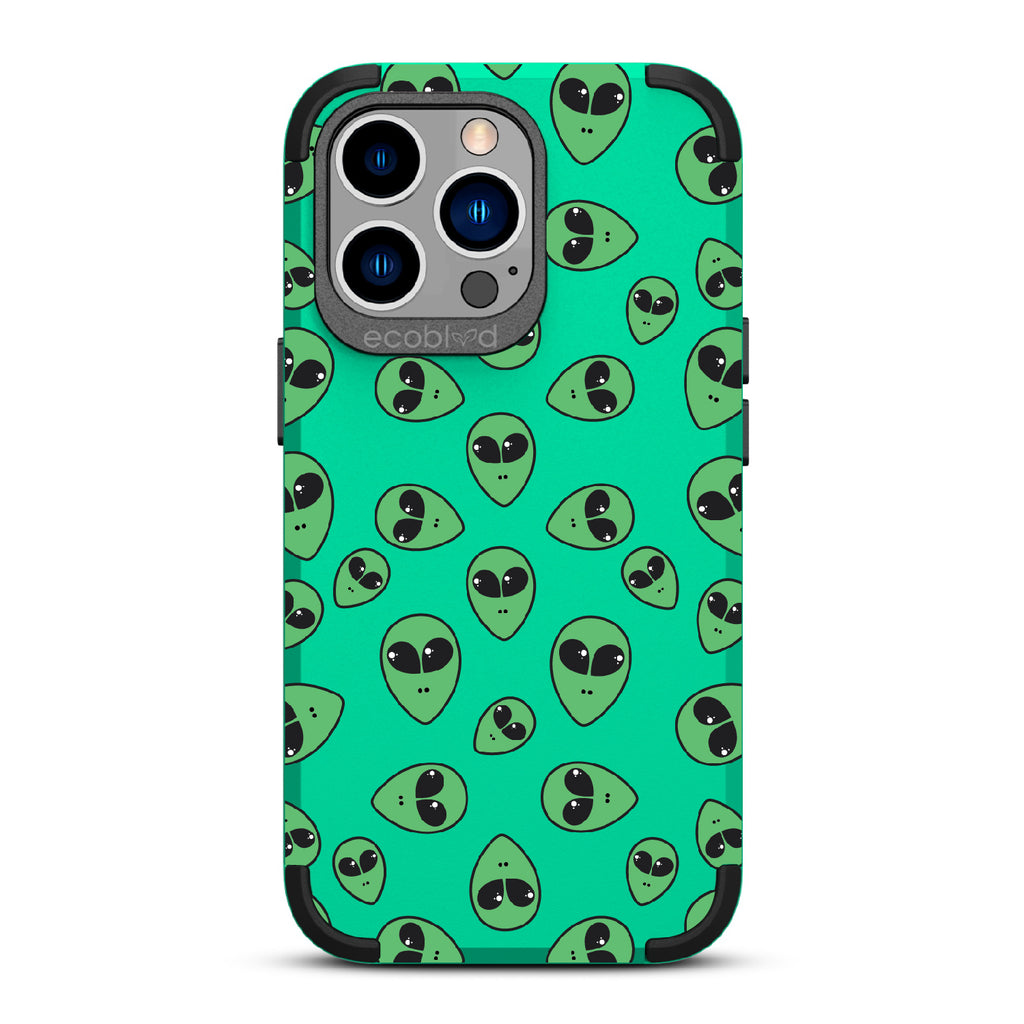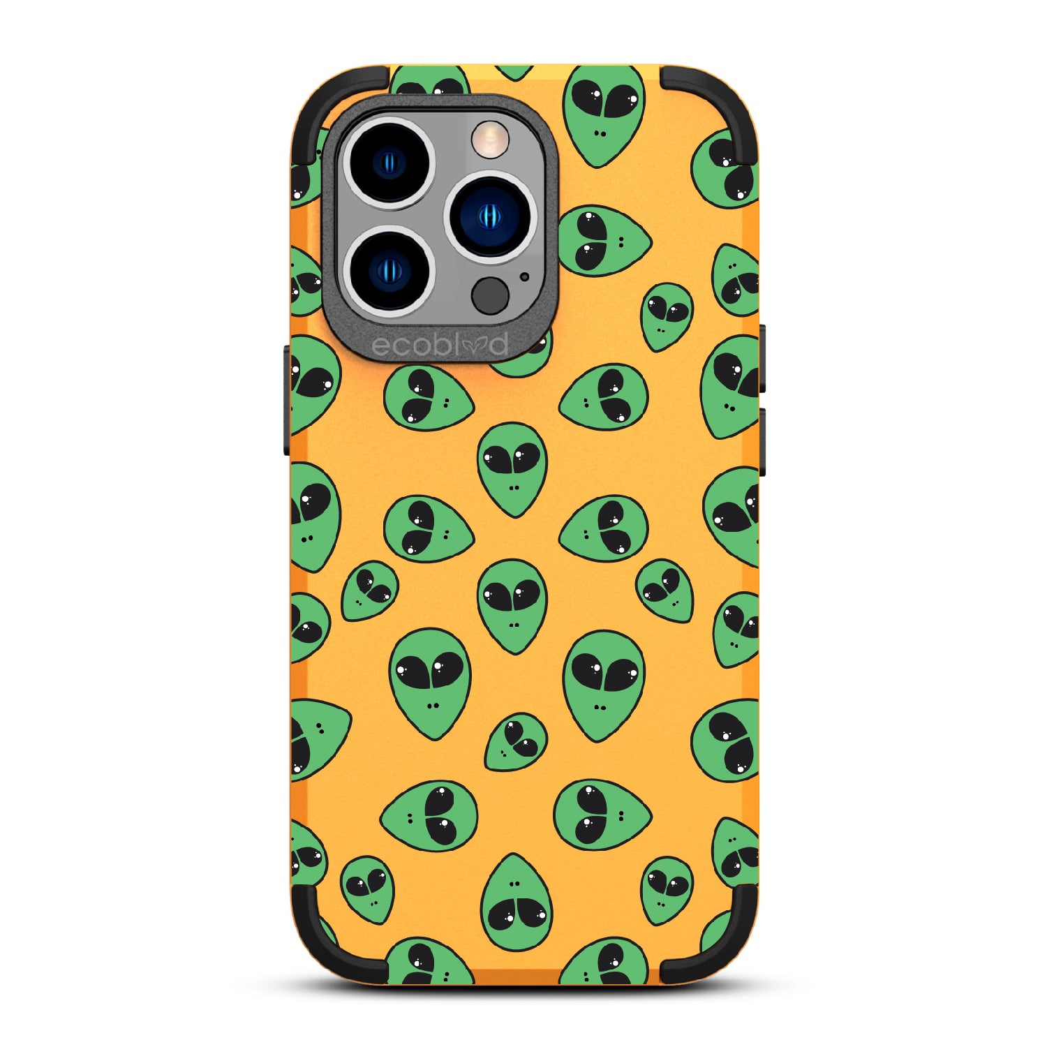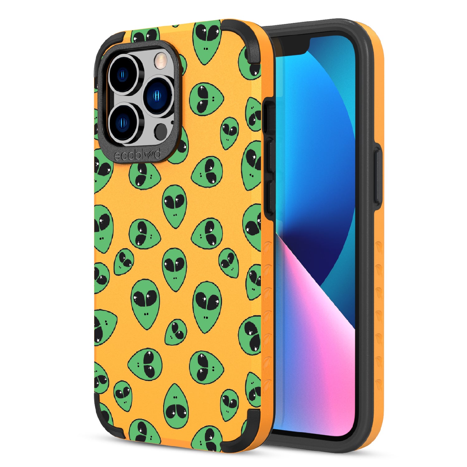 "We come in peace," the Aliens design on our Mojave rugged and compostable iPhone 12 Pro Max case & iPhone 13 Pro Max case announces as classic green extraterrestrial alien emojis decorate your phone's surface, offering an out-of-this-world look in all vibrant five colors: Midnight Black, Cascade Blue, Foliage Green, Illuminating Yellow, and Wildflower Pink.