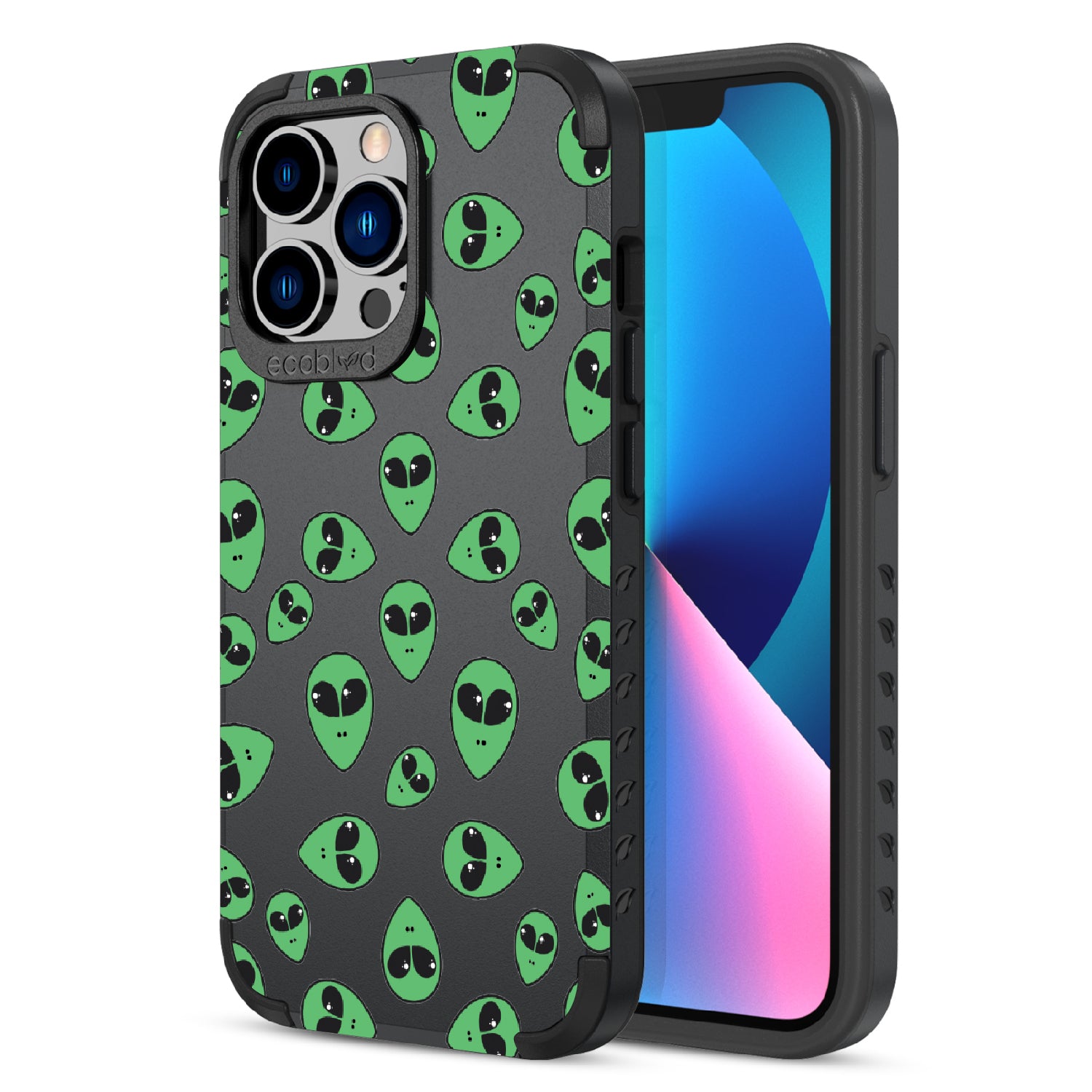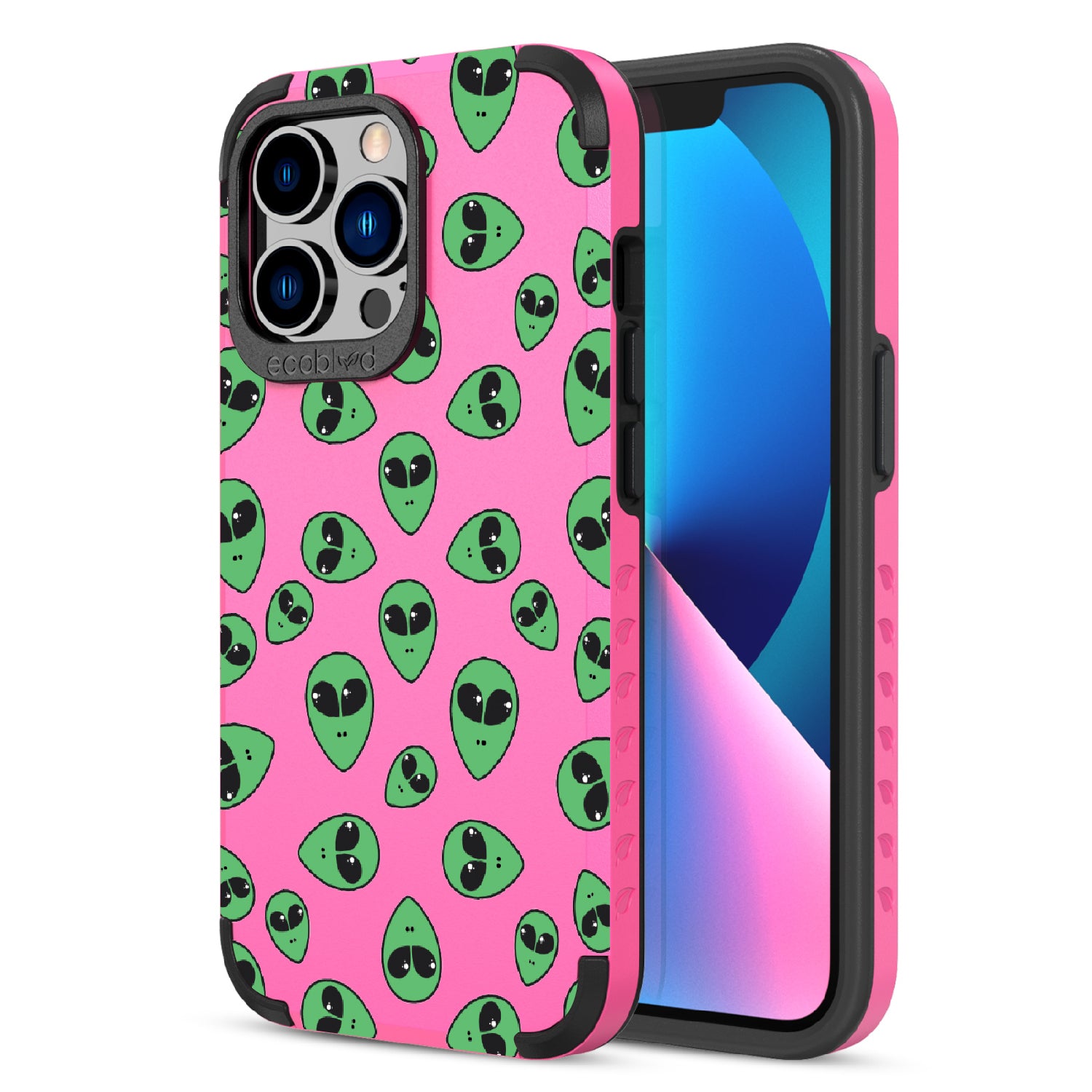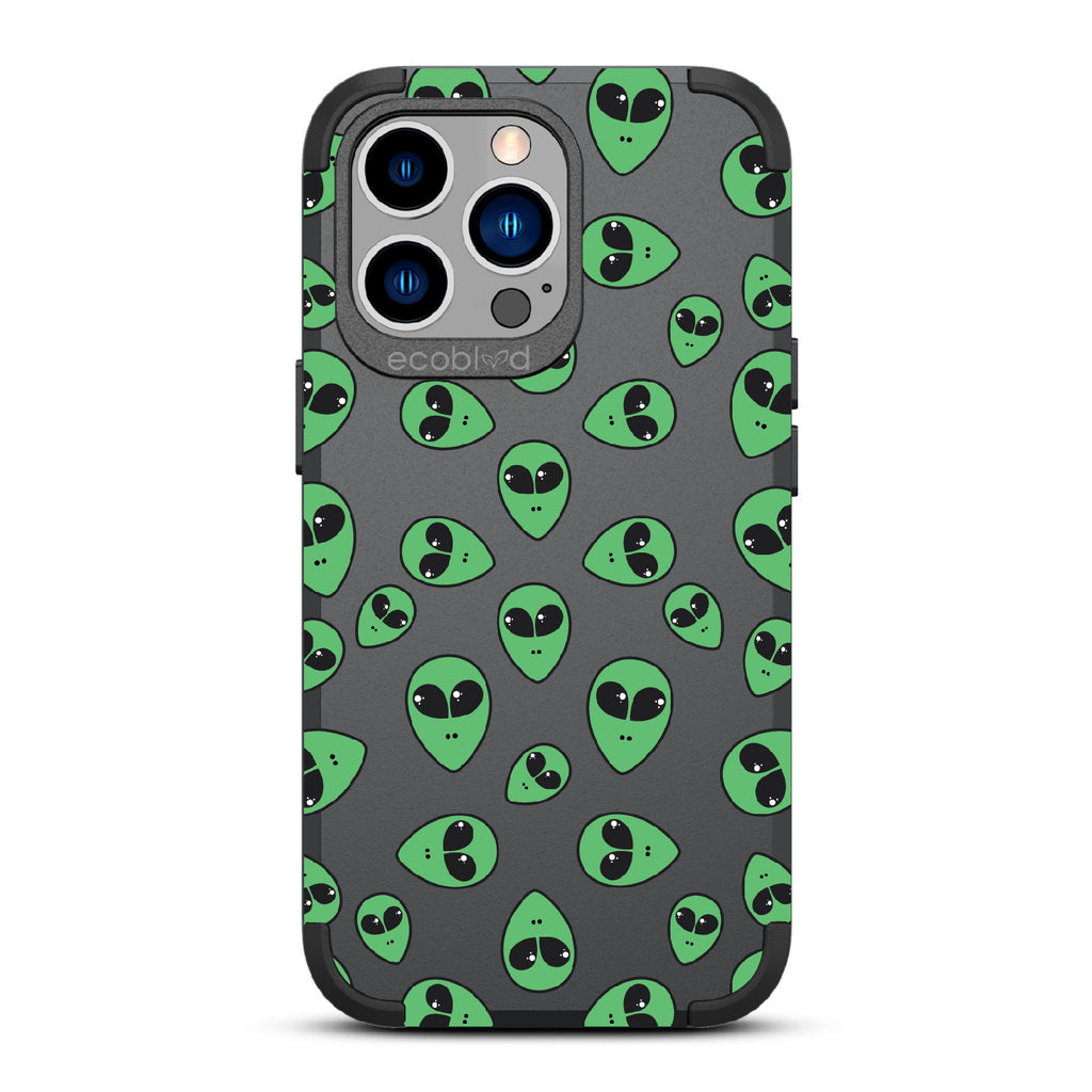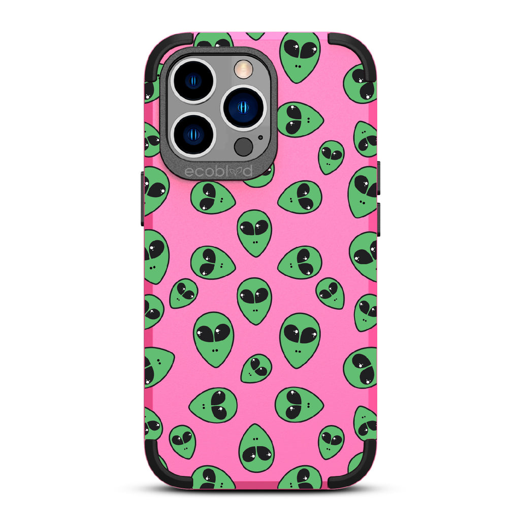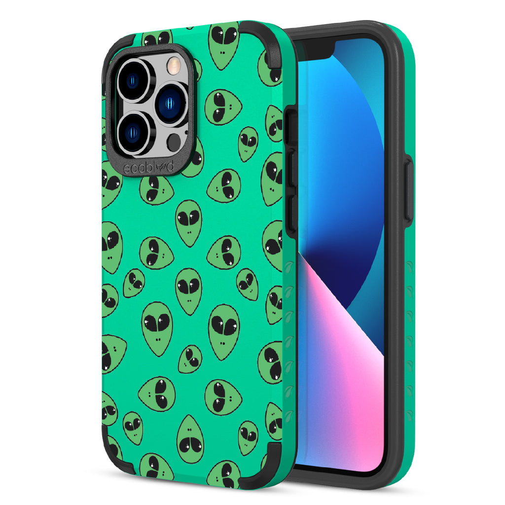 "We come in peace," the Aliens design on our Mojave rugged and compostable iPhone 12 Pro Max case & iPhone 13 Pro Max case announces as classic green extraterrestrial alien emojis decorate your phone's surface, offering an out-of-this-world look in all vibrant five colors: Midnight Black, Cascade Blue, Foliage Green, Illuminating Yellow, and Wildflower Pink.