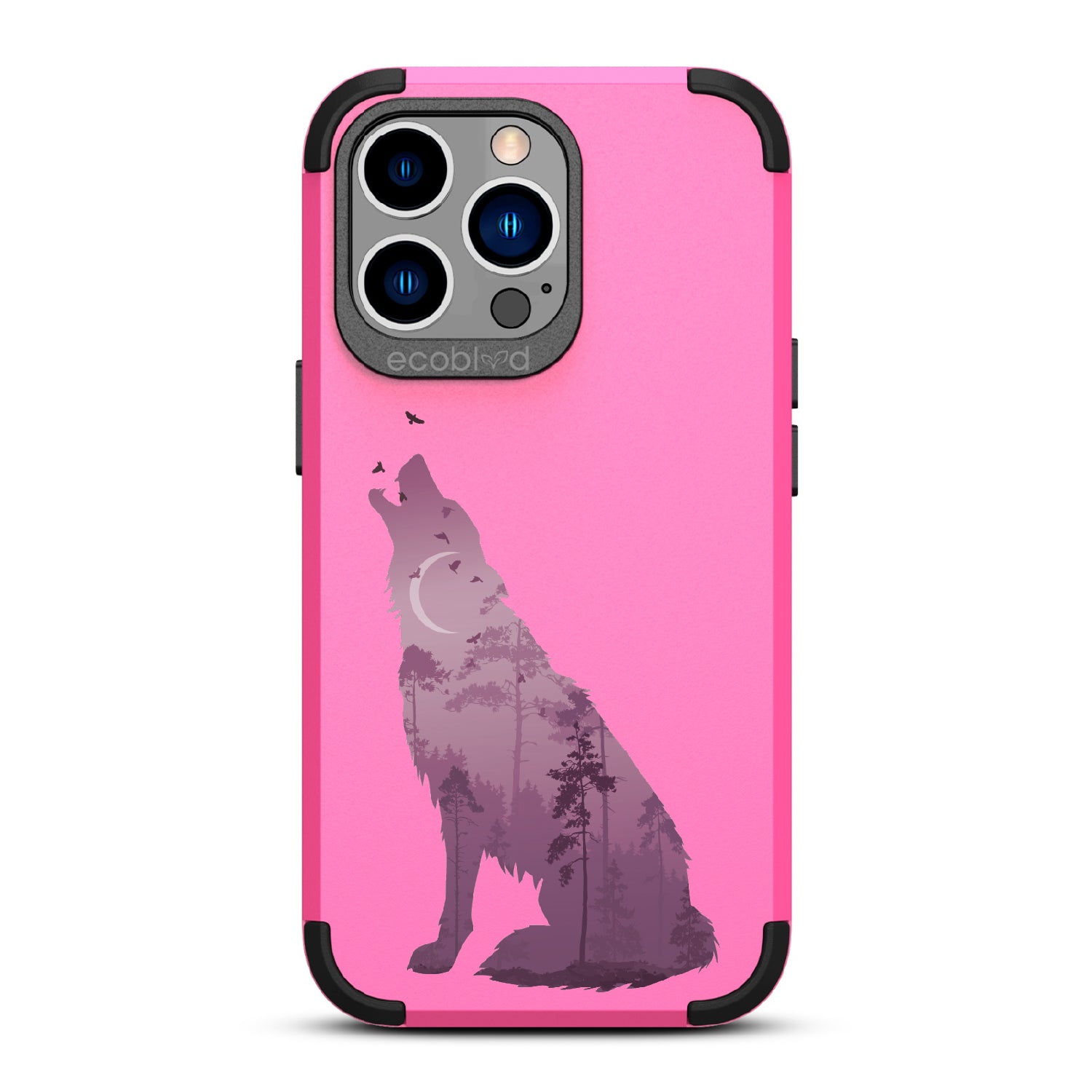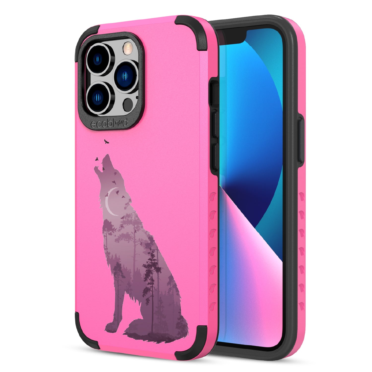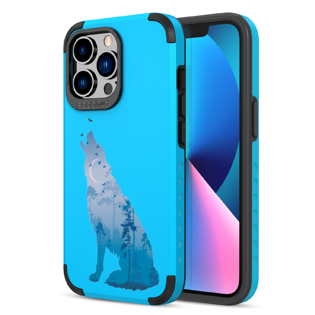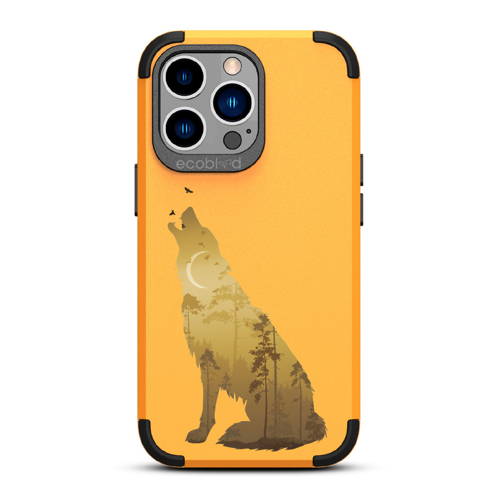 Embrace your wild side as the Howl At The Moon design on our Mojave rugged and compostable iPhone 12 Pro Max phone case & iPhone 13 Pro Max phone case transforms your iPhone into an enchanting moonlit woodland with a howling wolf prowling through the darkness. Choose from five vibrant color options: Midnight Black, Cascade Blue, Foliage Green, Illuminating Yellow, and Wildflower Pink.
