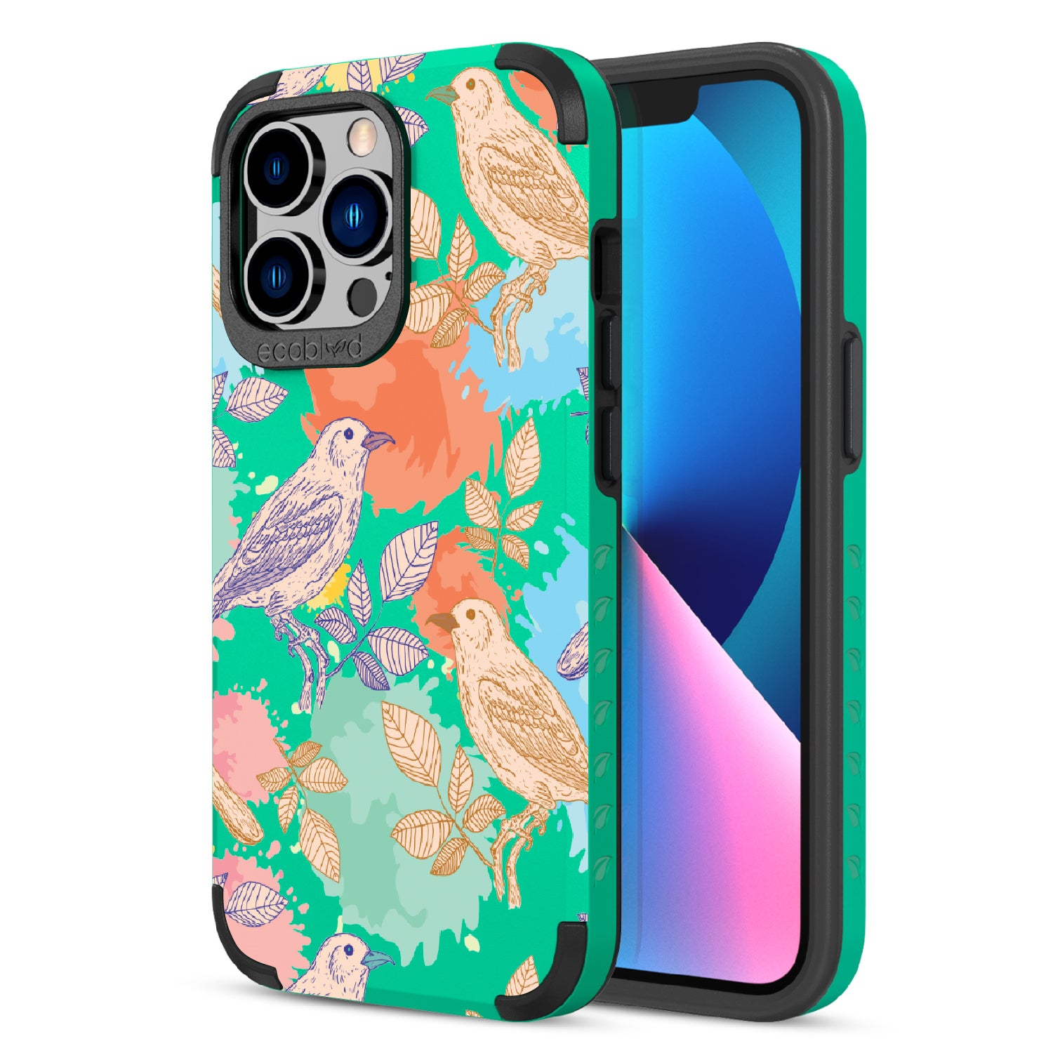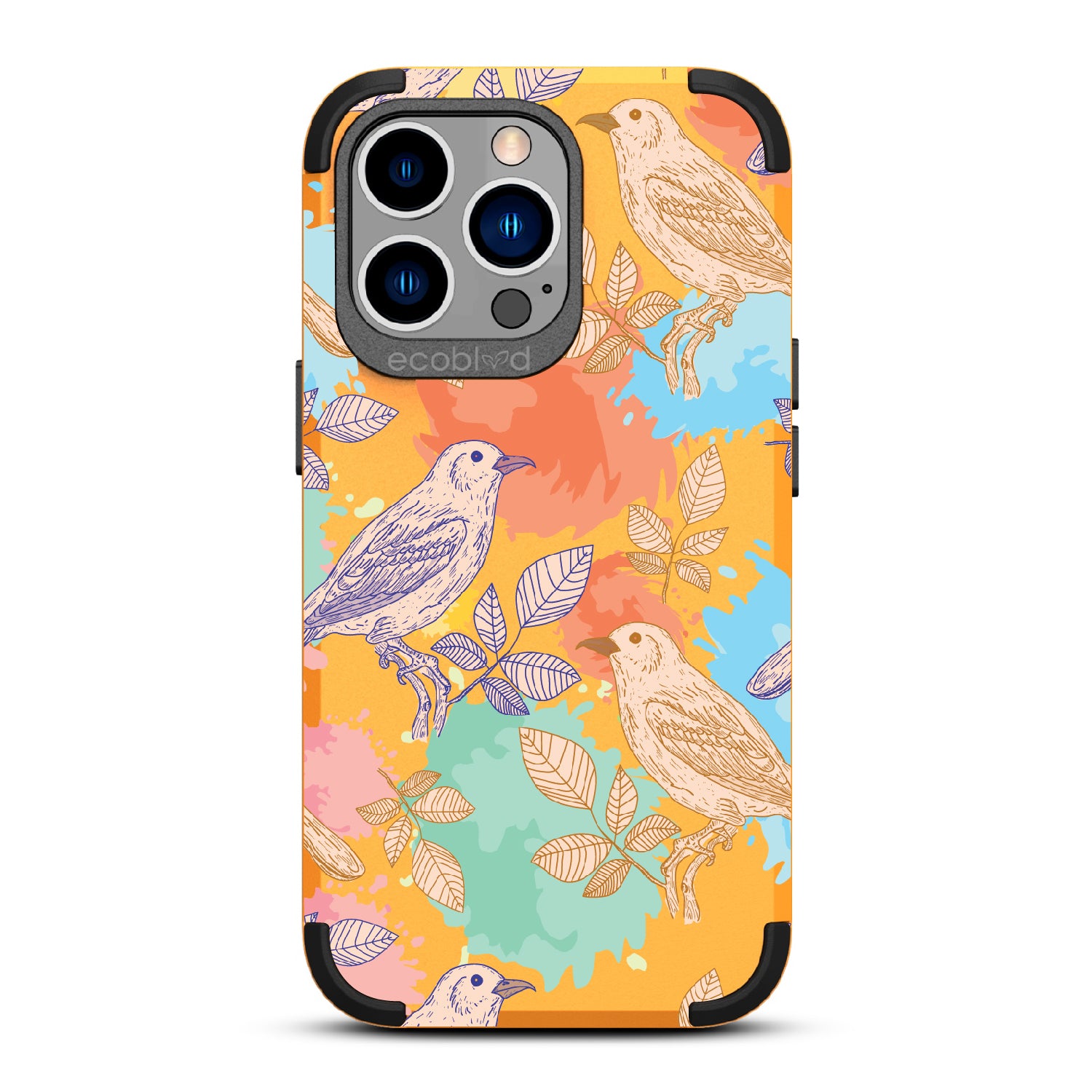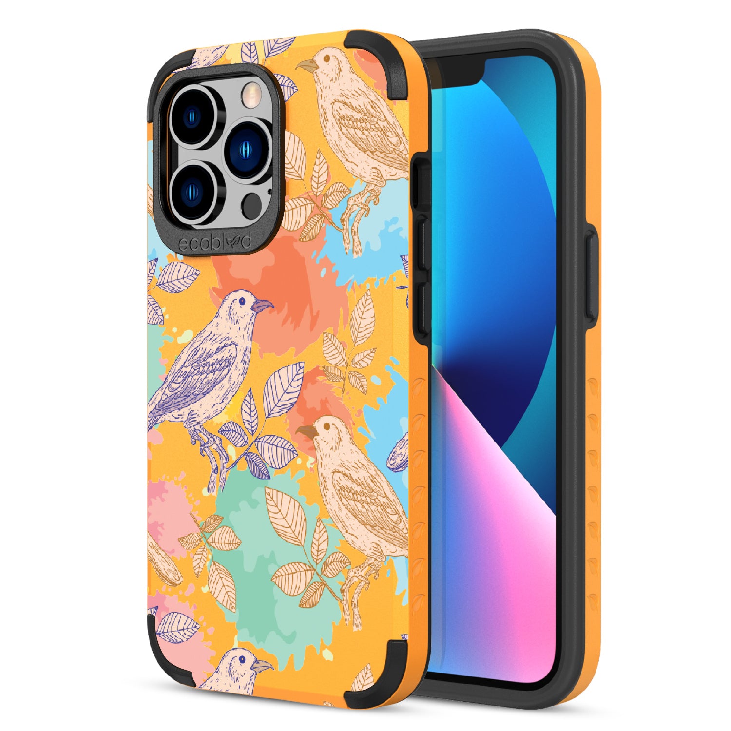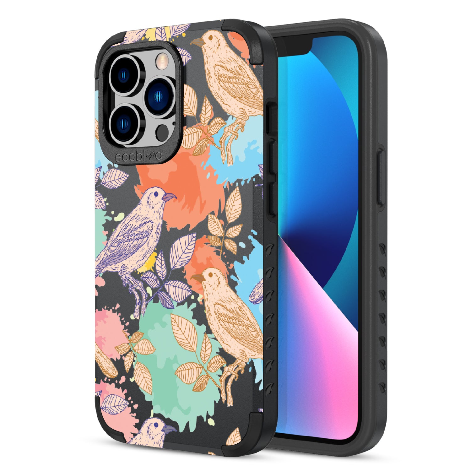 Get ready to soar to new heights with the Perch Perfectdesign on our Mojave rugged and compostable iPhone 12 Pro Max case or iPhone 13 Pro Max case. This feathered symphony will have you tweeting in delight as colorful birds perch on branches, creating a harmonious composition that hits all the right notes. The Perch Perfect design is like a symphony for your phone, hitting all the right notes with its playful bursts of color and intricate line art birds perched on a branch. Each bird adds its own unique melody to the song, creating a harmonious design that captures the essence of feeling wild and free. Let your phone be the conductor of this beautiful masterpiece with Perch Perfect in five captivating colors: Midnight Black, Cascade Blue, Foliage Green, Illuminating Yellow, and Wildflower Pink.