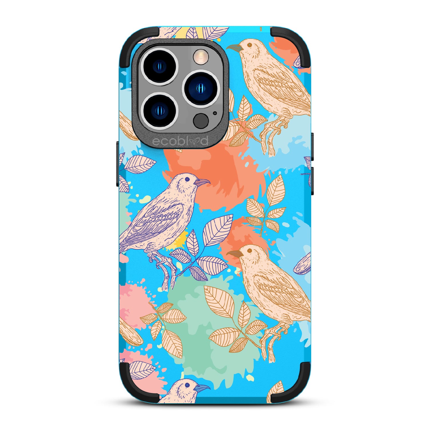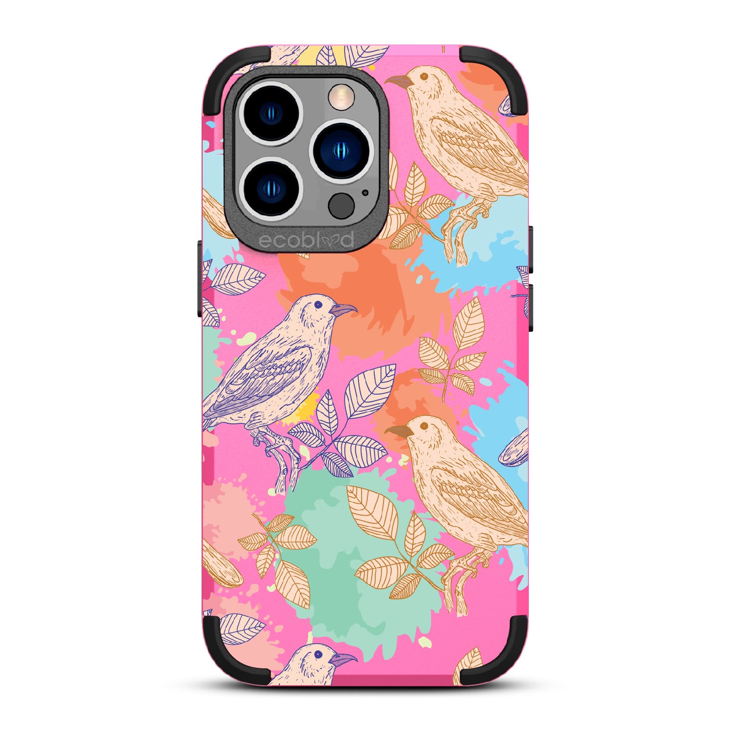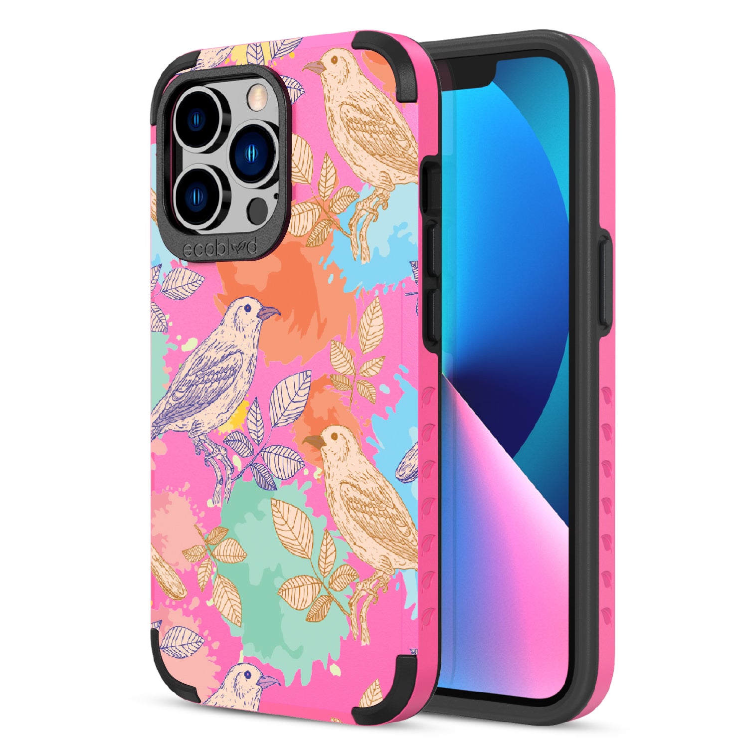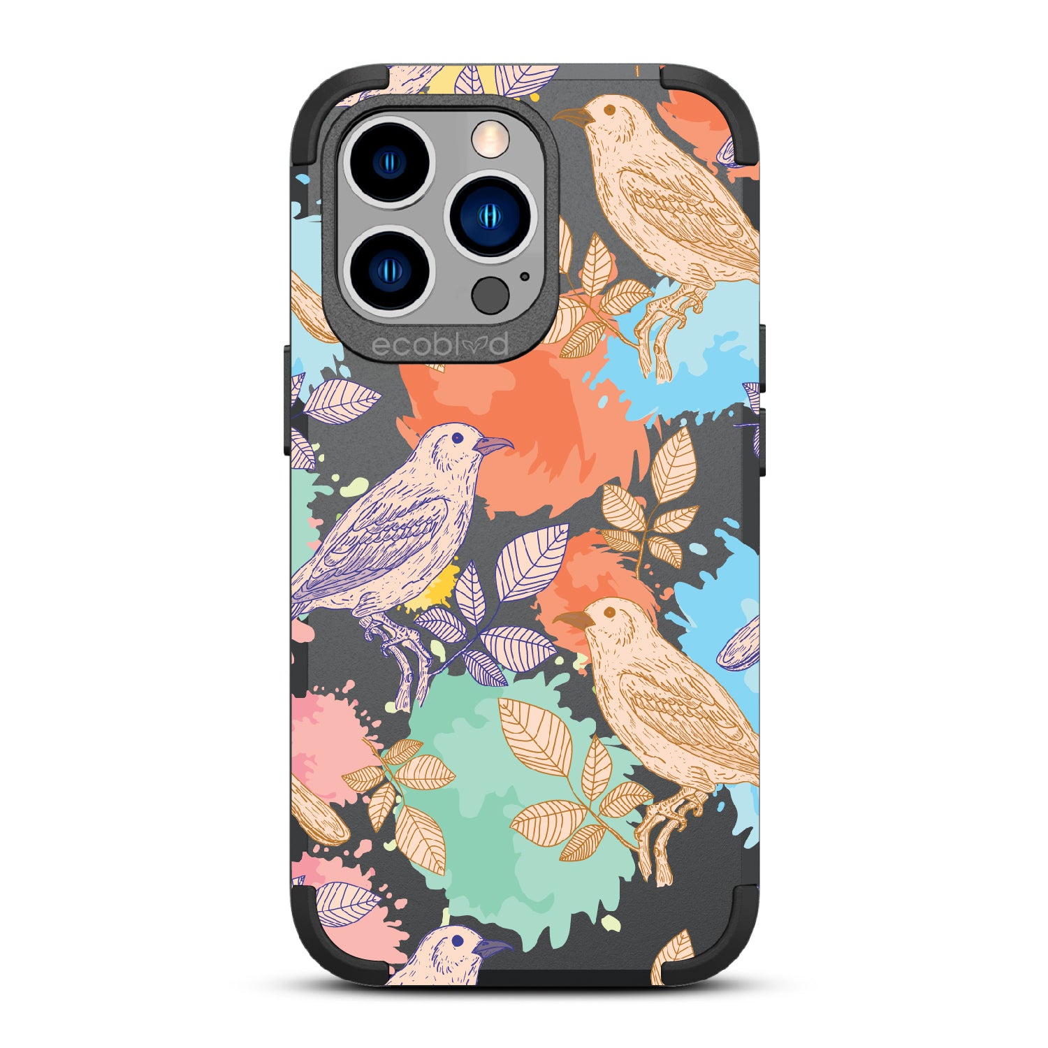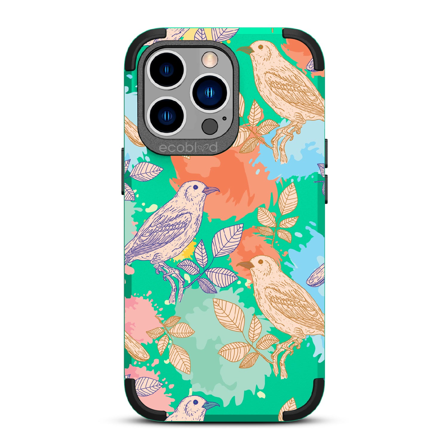 Get ready to soar to new heights with the Perch Perfectdesign on our Mojave rugged and compostable iPhone 12 Pro Max case or iPhone 13 Pro Max case. This feathered symphony will have you tweeting in delight as colorful birds perch on branches, creating a harmonious composition that hits all the right notes. The Perch Perfect design is like a symphony for your phone, hitting all the right notes with its playful bursts of color and intricate line art birds perched on a branch. Each bird adds its own unique melody to the song, creating a harmonious design that captures the essence of feeling wild and free. Let your phone be the conductor of this beautiful masterpiece with Perch Perfect in five captivating colors: Midnight Black, Cascade Blue, Foliage Green, Illuminating Yellow, and Wildflower Pink.