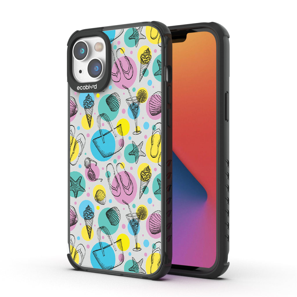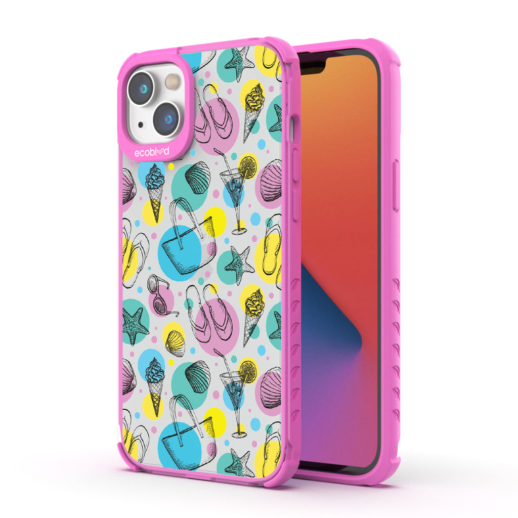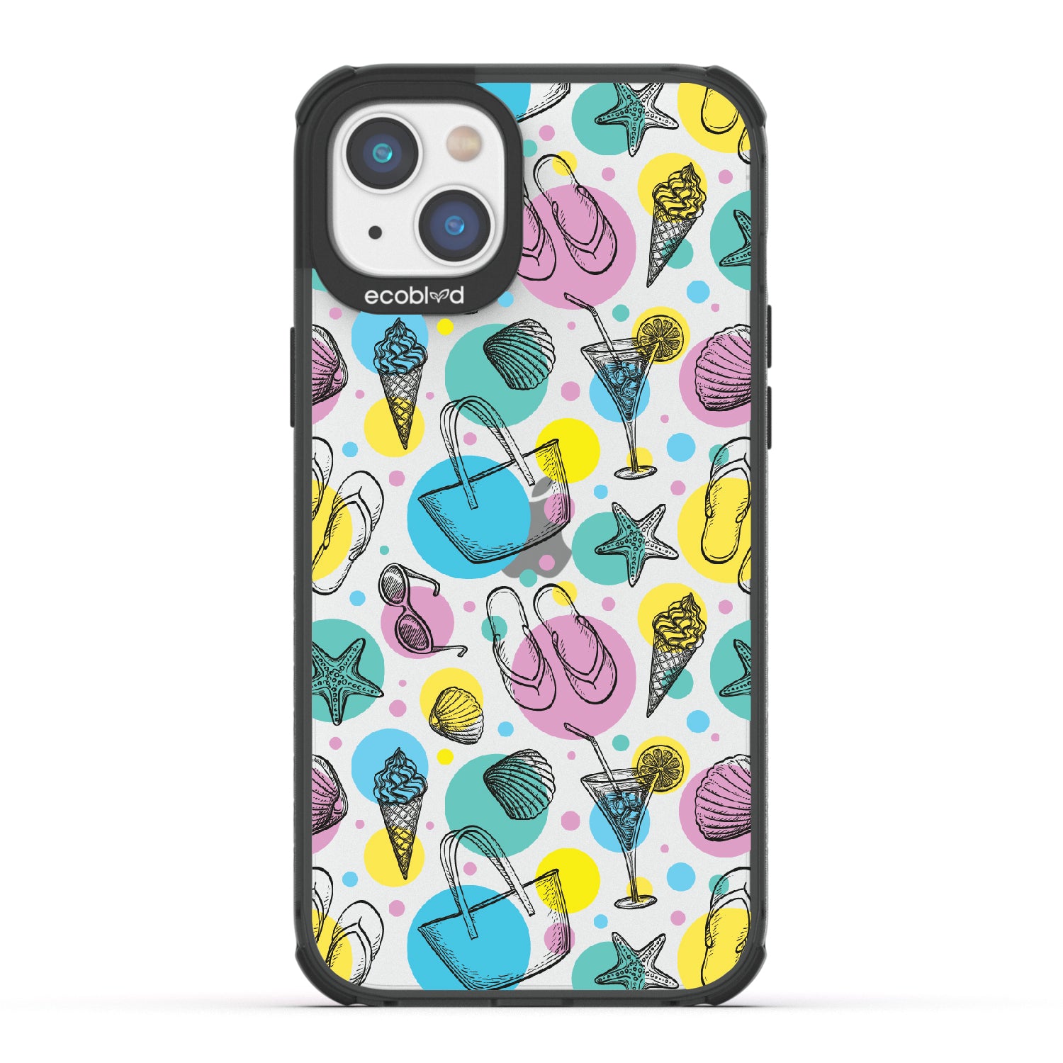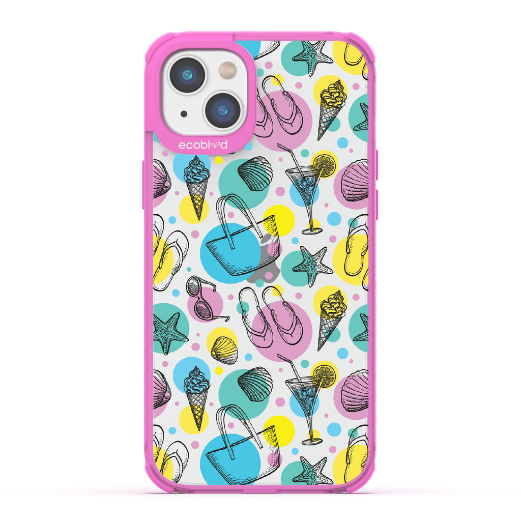 Beach Please, it's time to turn up the heat and bring your summer swagger to the forefront with this beach-ready design on our Laguna clear iPhone 14 Plus case. This phone case design is a bold fusion of beach essentials, featuring a trendy beach tote that holds your Beach Please-ure, a cocktail glass brimming with tropical vibes and a hint of cheekiness, seashells that carry the whispers of unforgettable beach moments, sunglasses that say "I'm too fabulous for the shade," mouthwatering ice cream that satisfies your sweet and sassy cravings, starfish ready to be your beachside companions, and flip flops that strut with an attitude that demands attention.