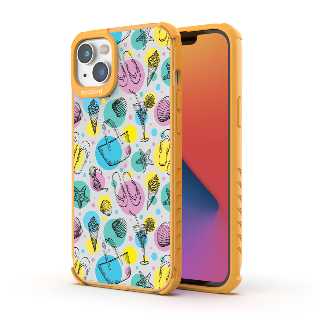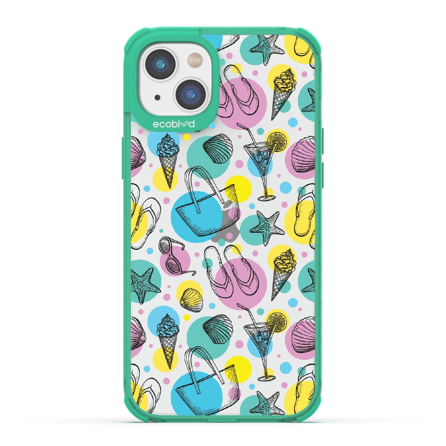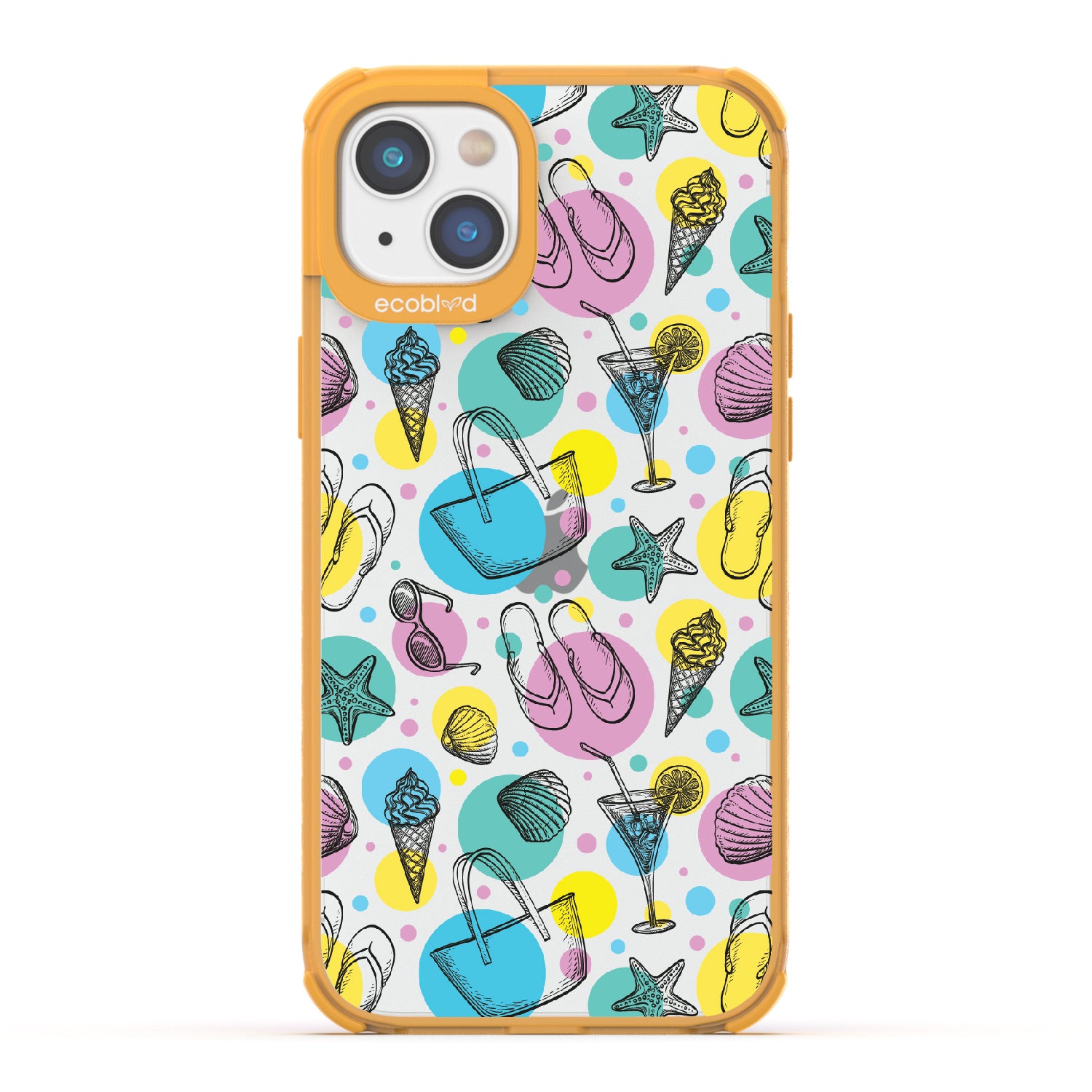 Beach Please, it's time to turn up the heat and bring your summer swagger to the forefront with this beach-ready design on our Laguna clear iPhone 14 Plus case. This phone case design is a bold fusion of beach essentials, featuring a trendy beach tote that holds your Beach Please-ure, a cocktail glass brimming with tropical vibes and a hint of cheekiness, seashells that carry the whispers of unforgettable beach moments, sunglasses that say "I'm too fabulous for the shade," mouthwatering ice cream that satisfies your sweet and sassy cravings, starfish ready to be your beachside companions, and flip flops that strut with an attitude that demands attention.