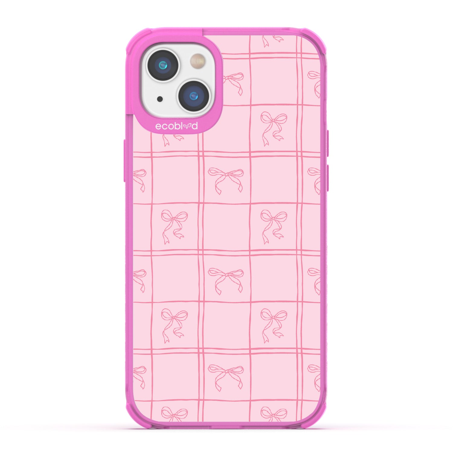 Little Bow Peep has lost her sheep, but she's found a case that’s just as sweet. Rows of pink bows in a dreamy array, make your phone charming and ready to play. With a touch of girly grace, this design on our Laguna clear iPhone 14 Plus phone case is your phone’s perfect place.