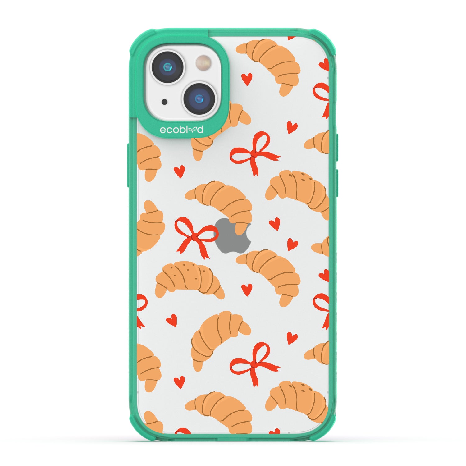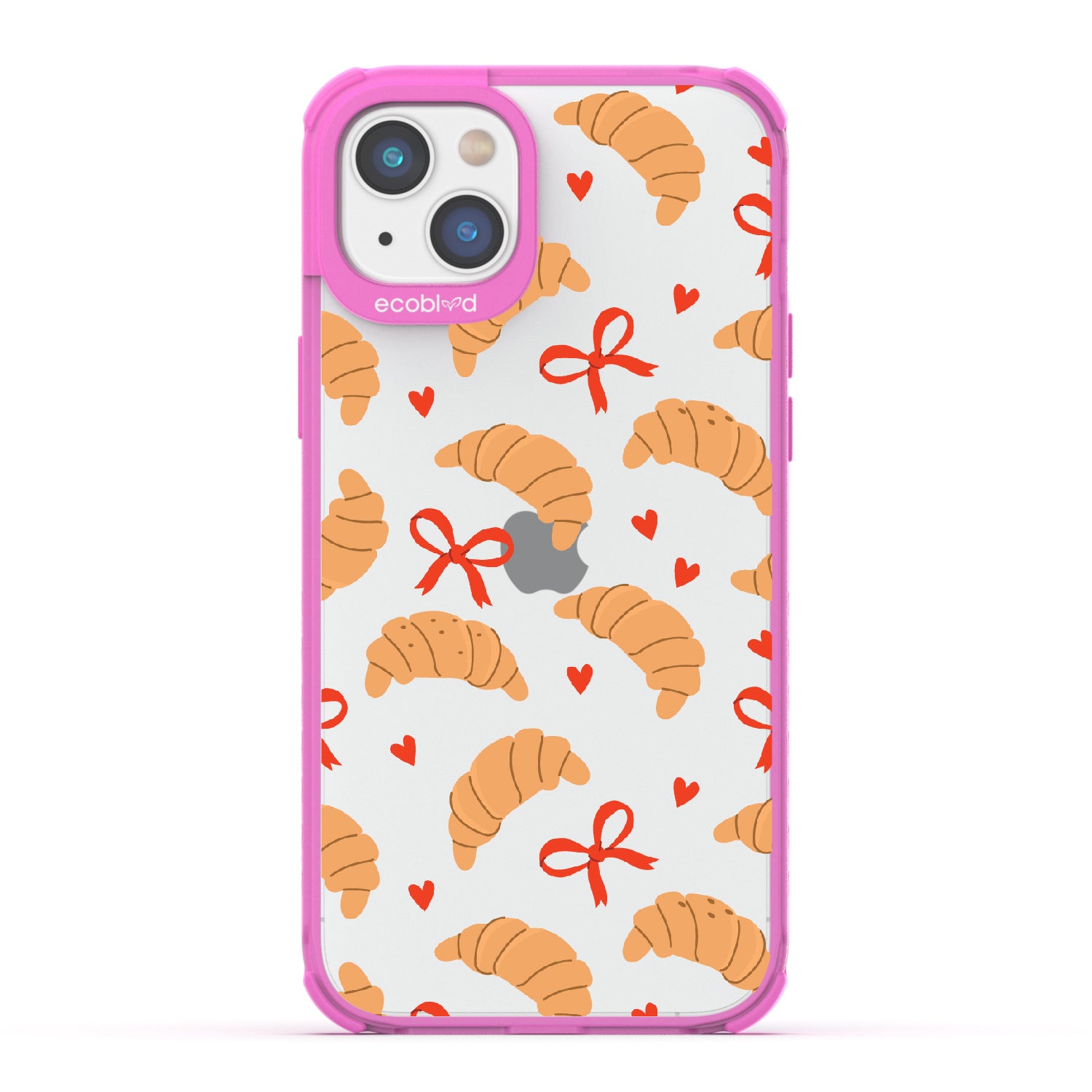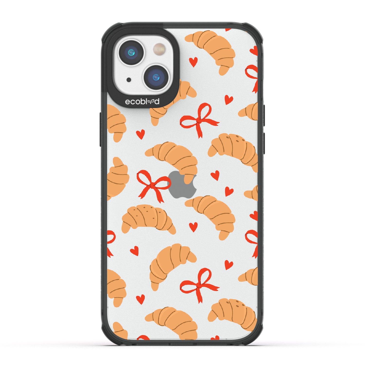 Good taste deserves the perfect recipe like the Croissant Couture design on our Laguna clear iPhone 14 Plus case! Softly folded croissants, tied with dainty red bows and sprinkled with sweet hearts, evoke the lightness and care of a true delicacy.