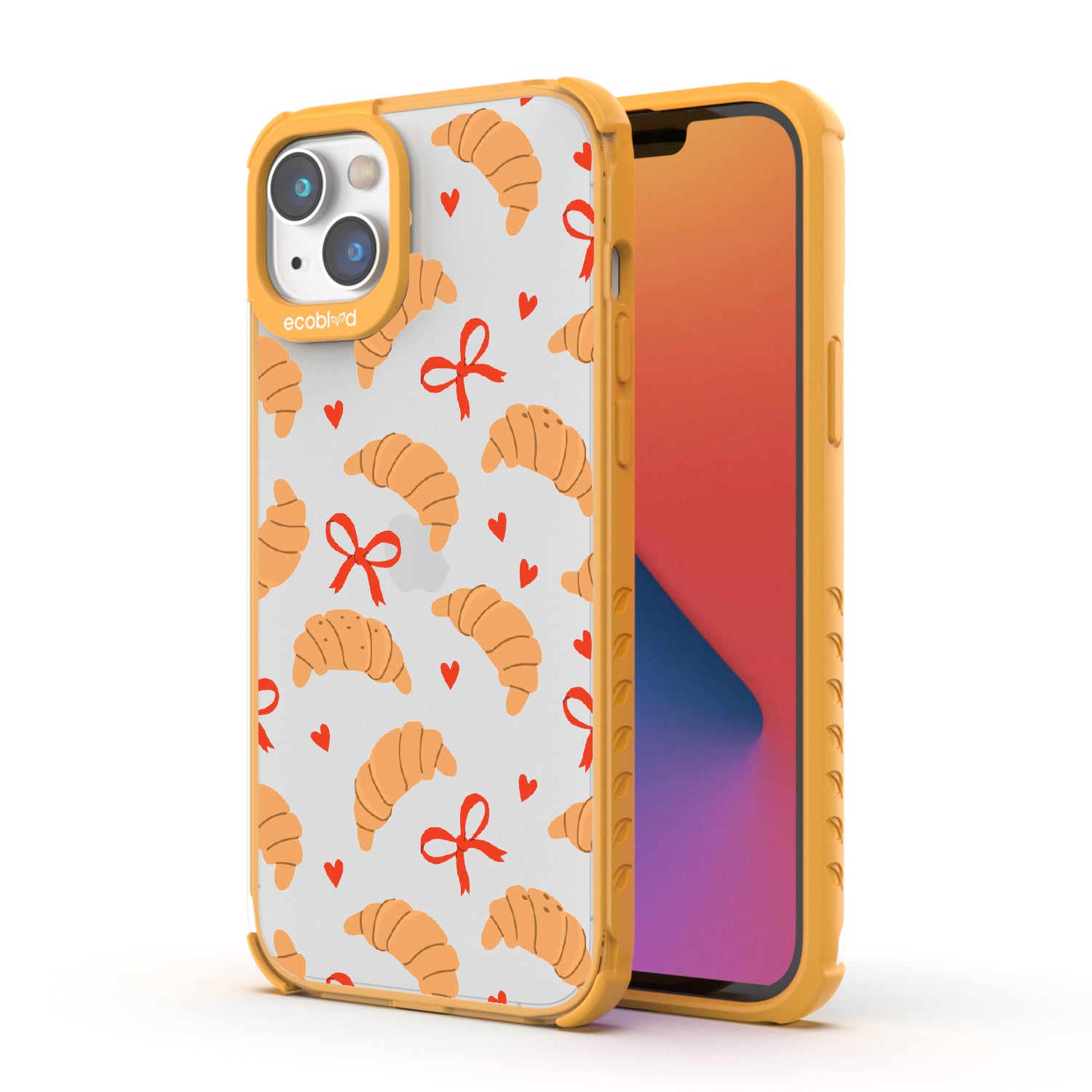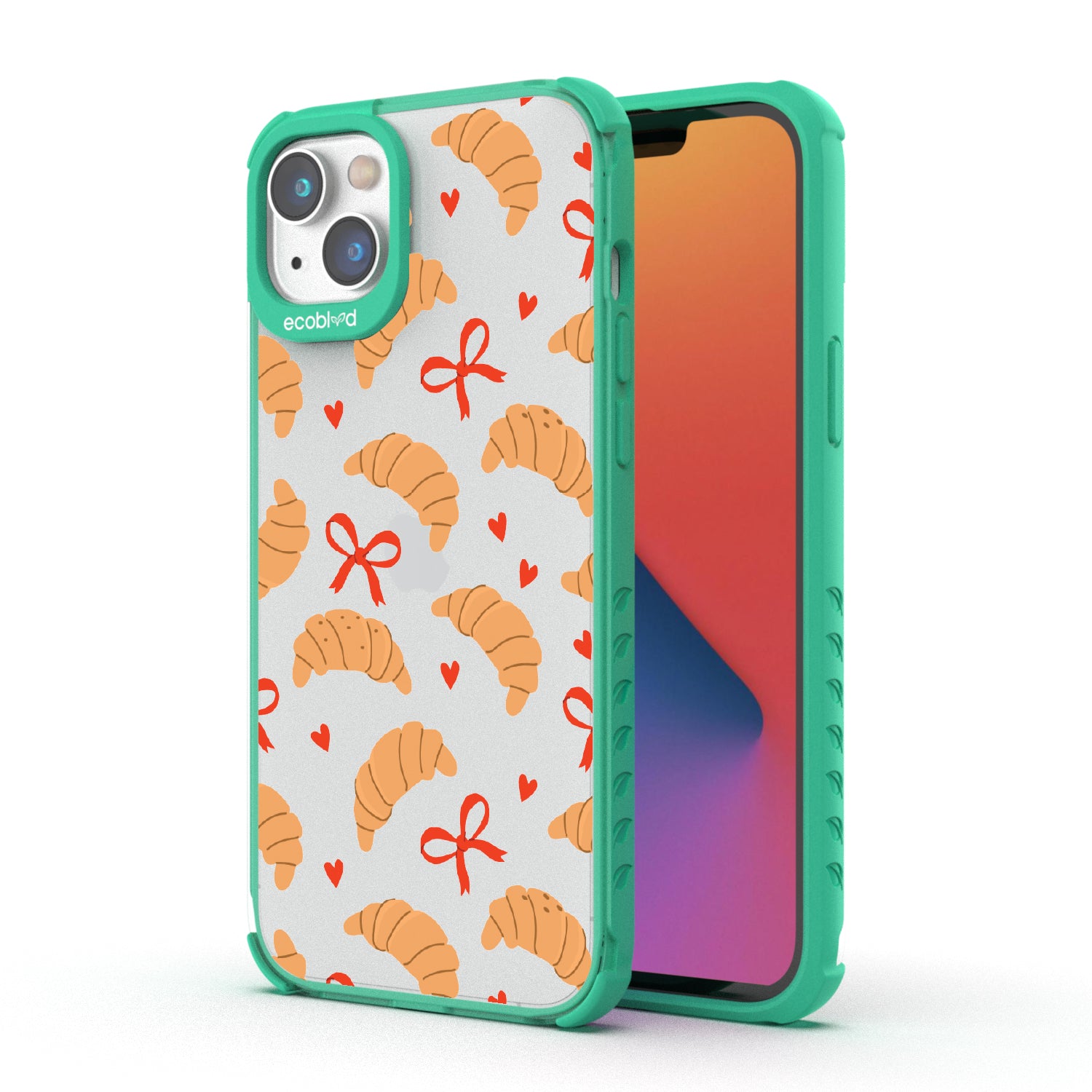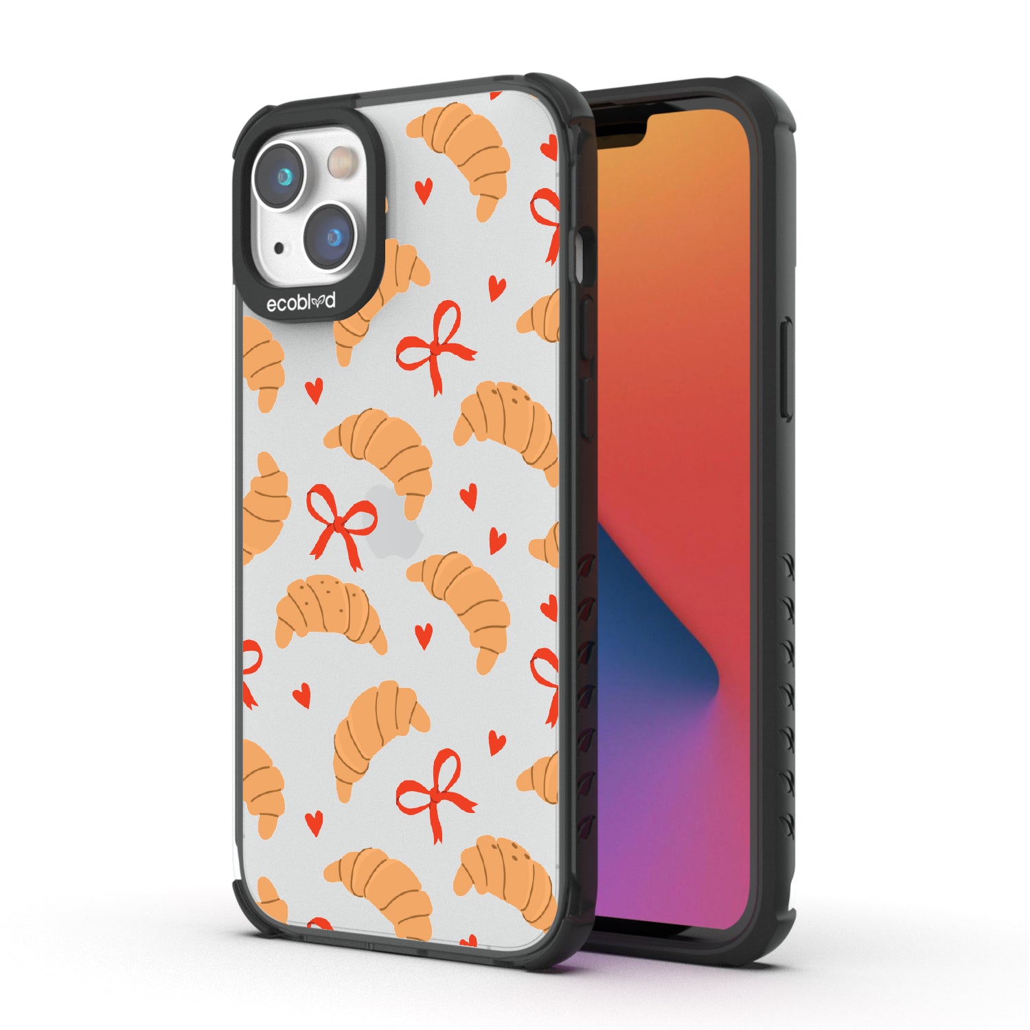 Good taste deserves the perfect recipe like the Croissant Couture design on our Laguna clear iPhone 14 Plus case! Softly folded croissants, tied with dainty red bows and sprinkled with sweet hearts, evoke the lightness and care of a true delicacy.