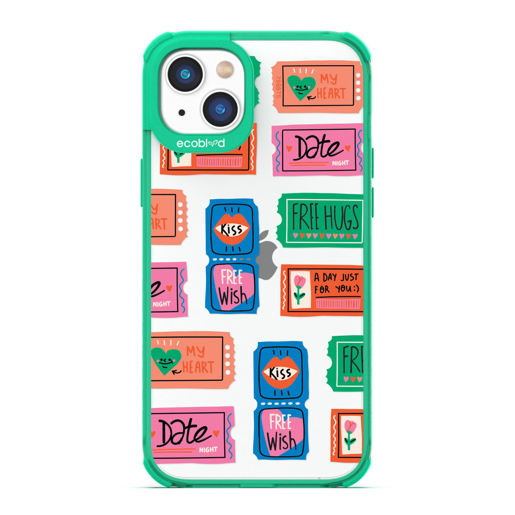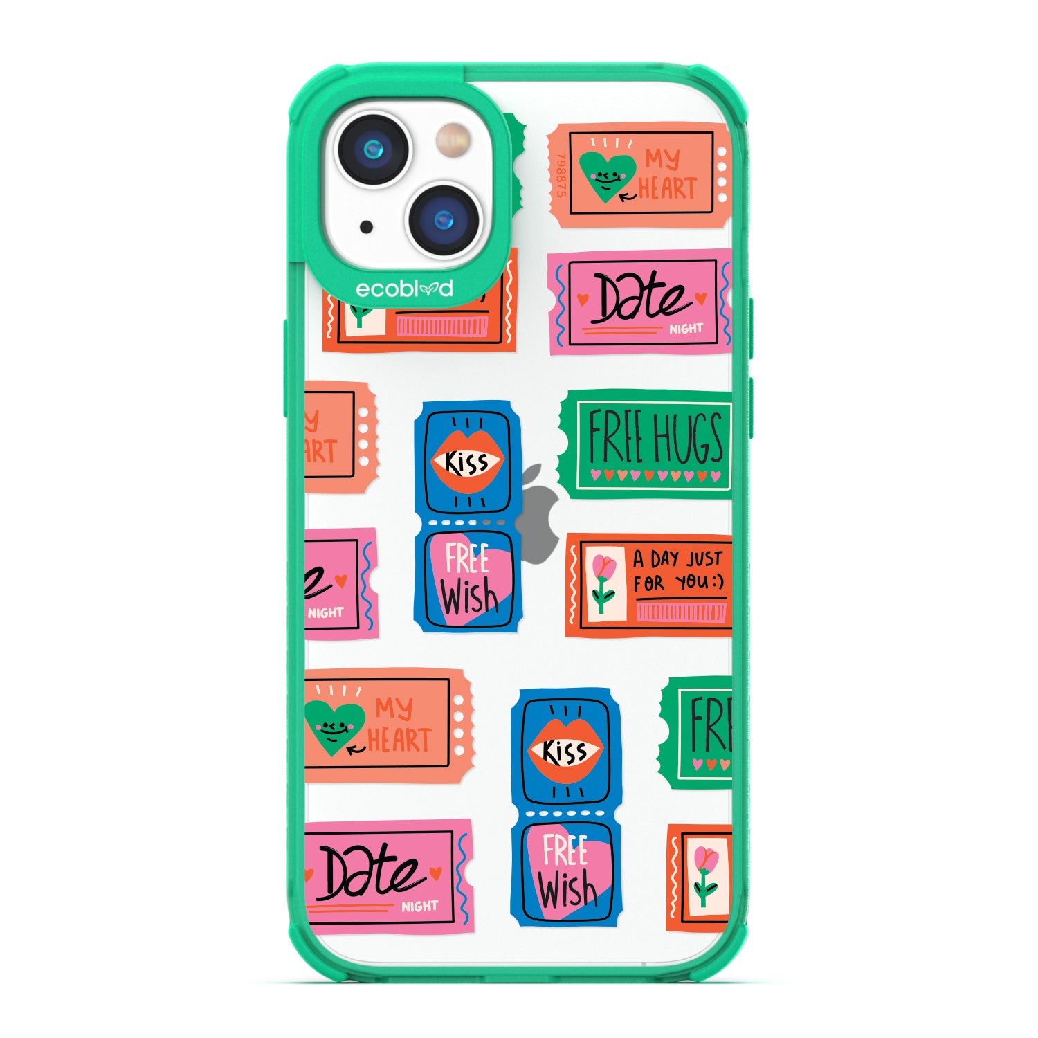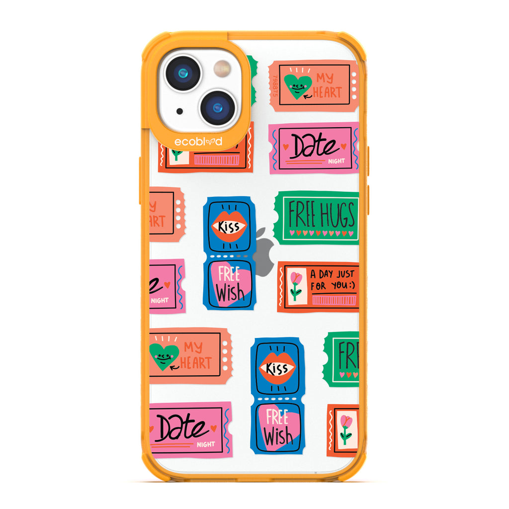 The Love Coupons design on our Laguna clear iPhone 14 Plus phone case will make every day feel like a celebration with its playful vouchers that you can use for free hugs, date nights, kisses, and wishes from your special someone wherever and whenever you want and in five fun colorways: Midnight Black, Cascade Blue, Foliage Green, Illuminating Yellow, and Wildflower Pink.