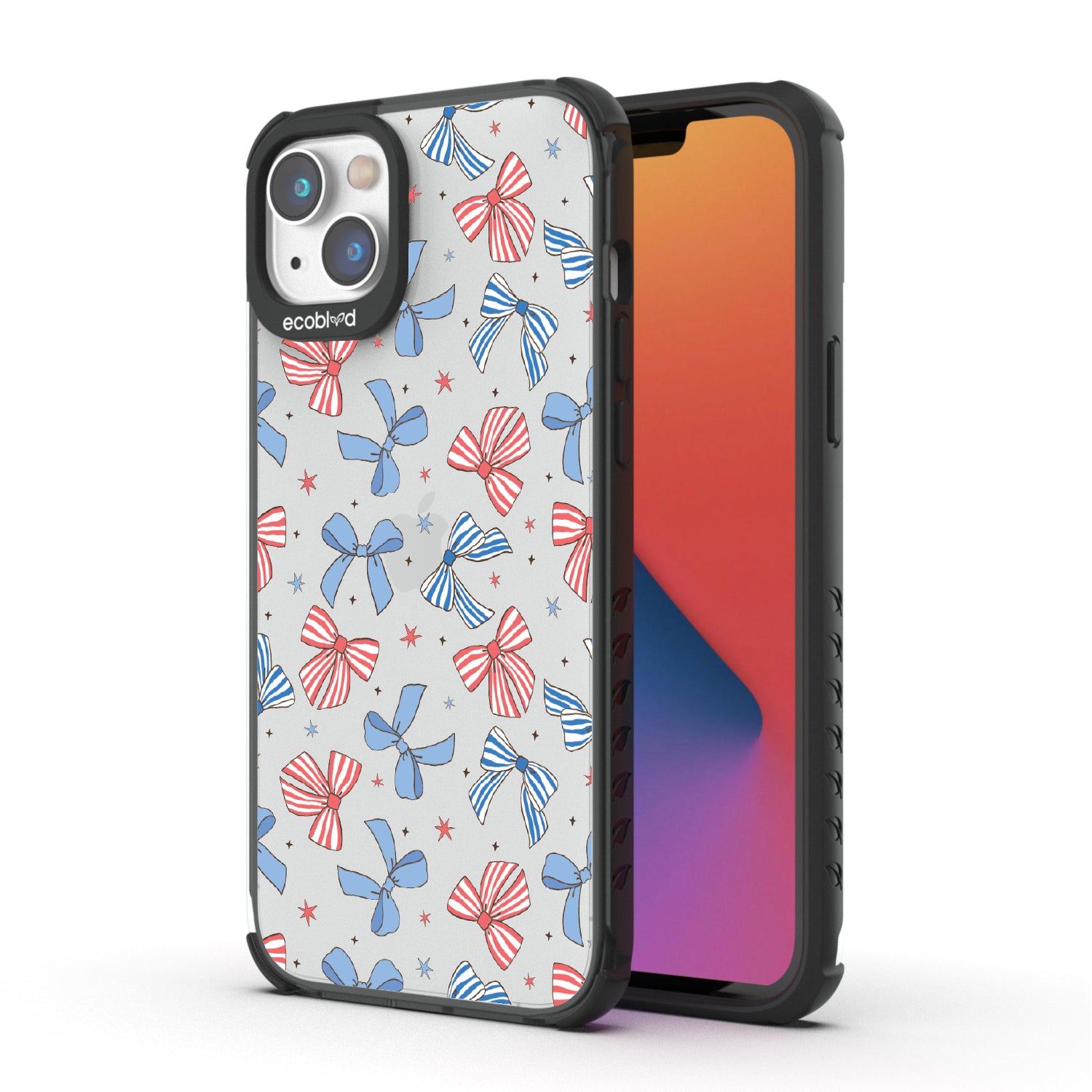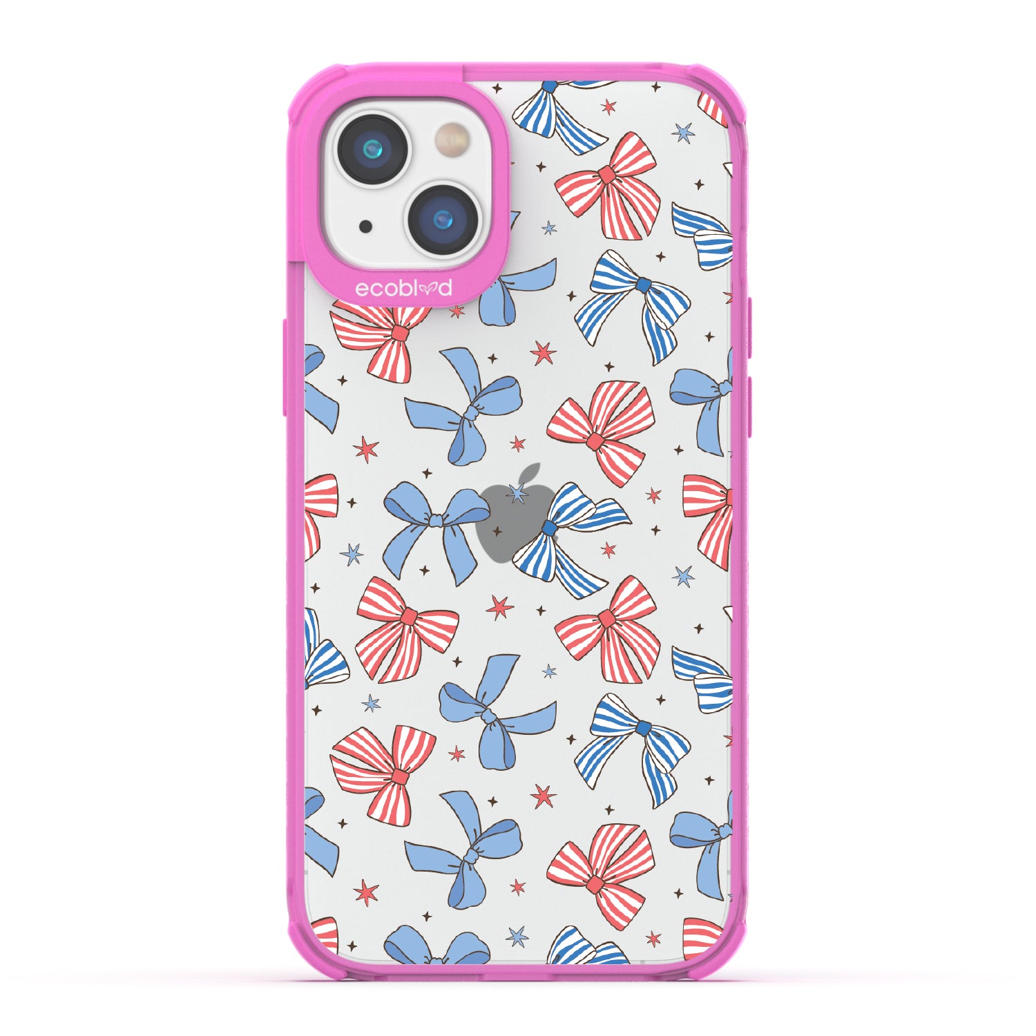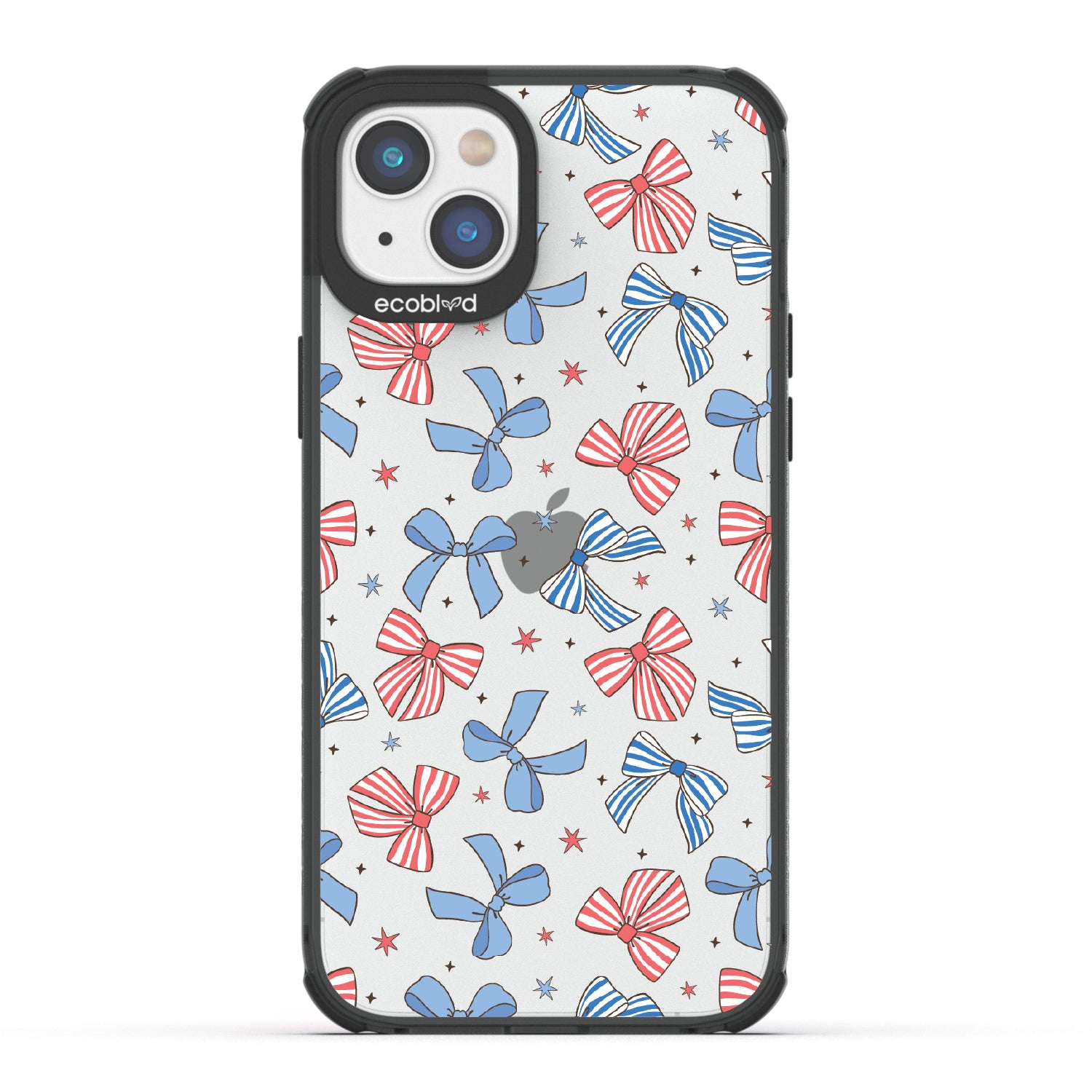 America the bow-tiful! The Miss Americana design on our Laguna clear iPhone 14 Plus phone case crowns your phone with patriotic flair. With red, white, and blue bows, this coquette phone case design turns your phone into the belle of the Americana ball.