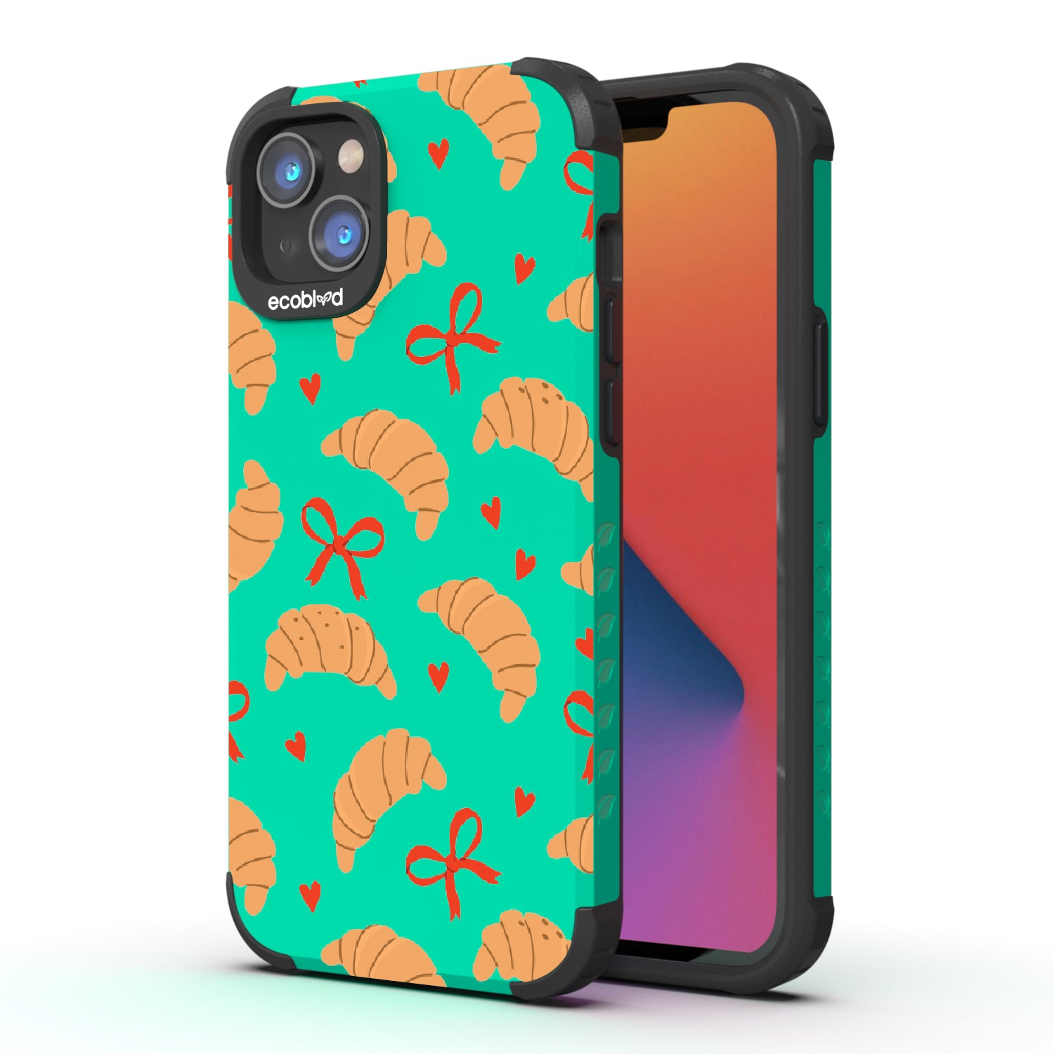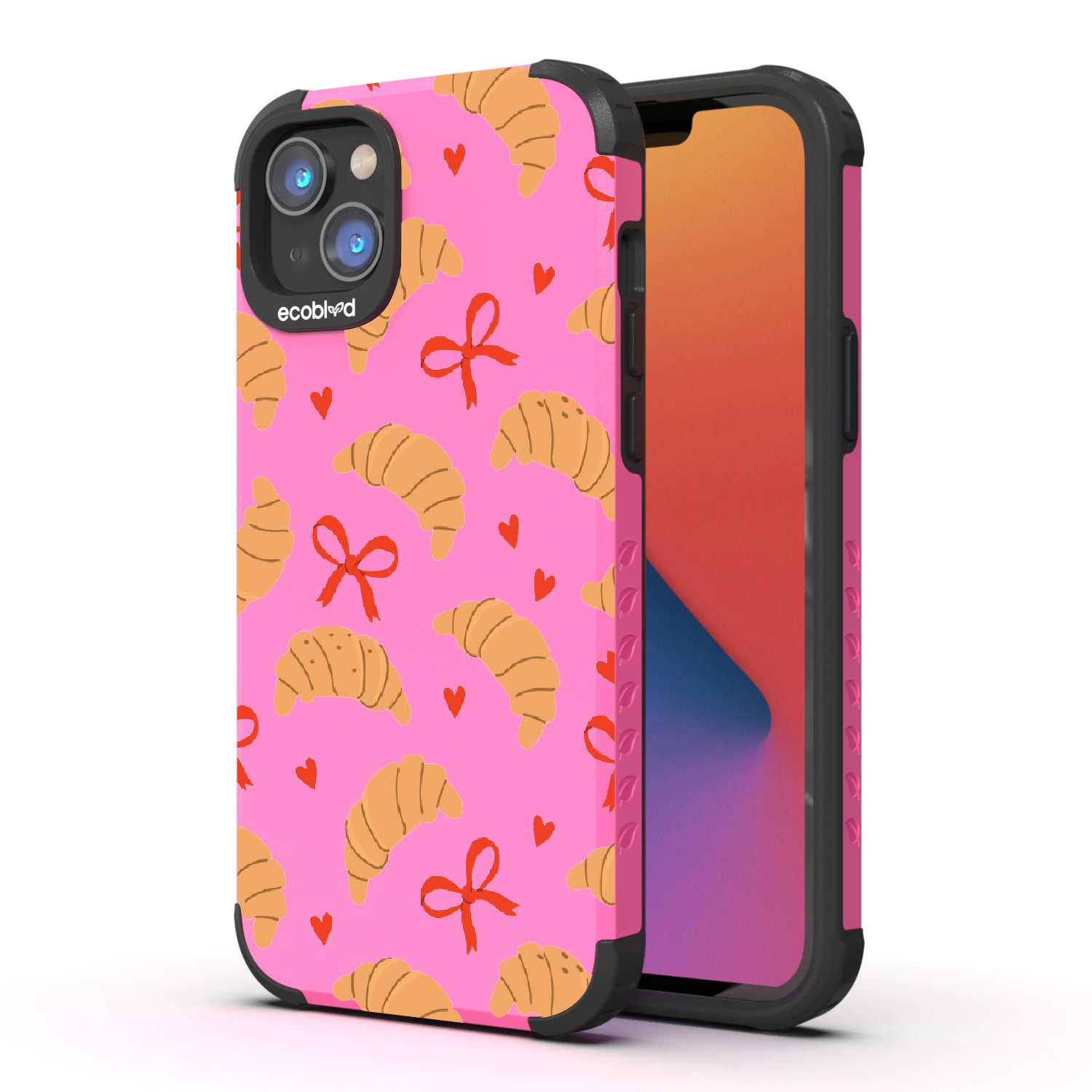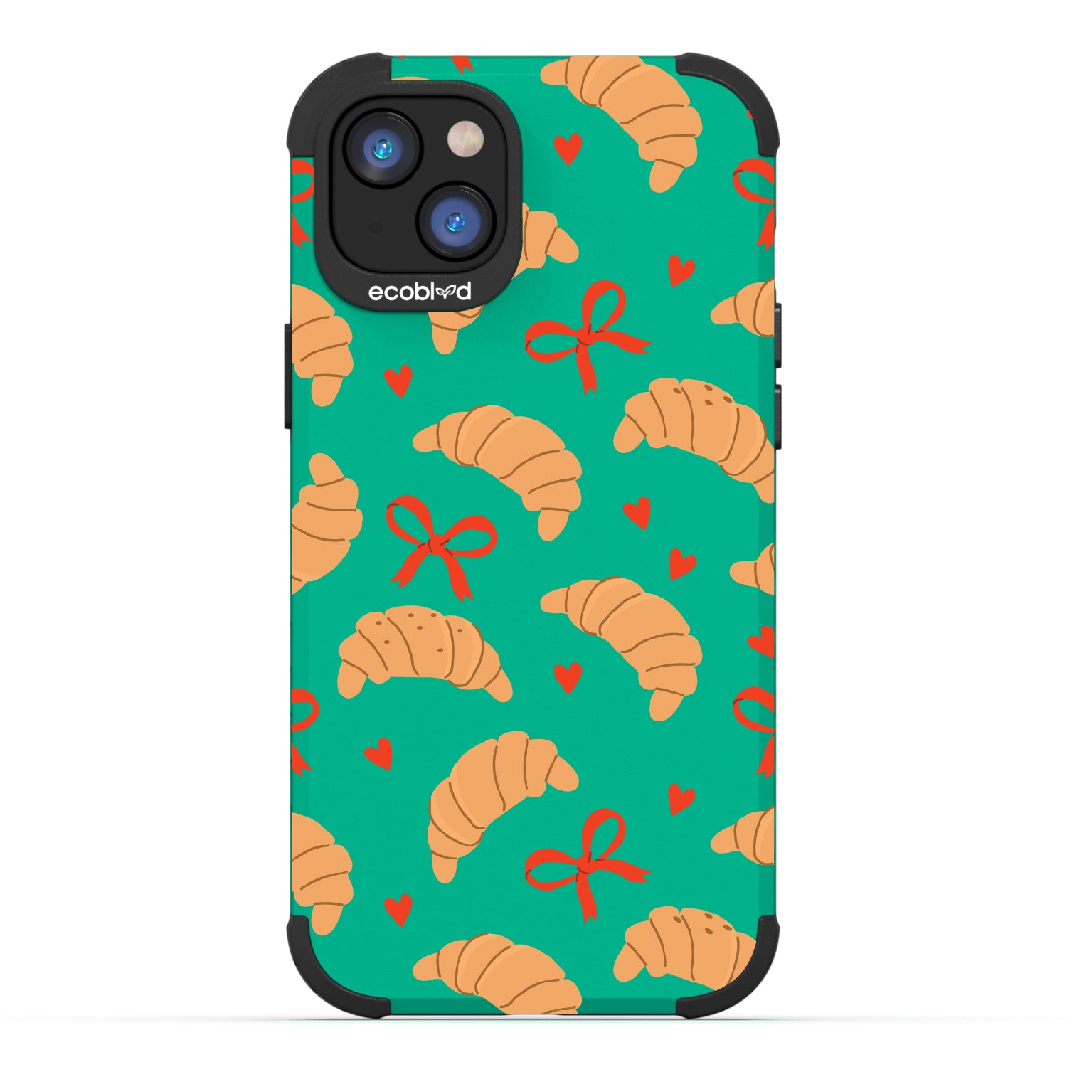Good taste deserves the perfect recipe like the Croissant Couture design on our Mojave rugged and compostable iPhone 14 Plus case! Softly folded croissants, tied with dainty red bows and sprinkled with sweet hearts, evoke the lightness and care of a true delicacy.