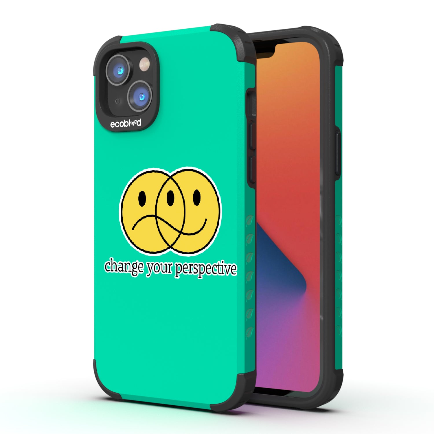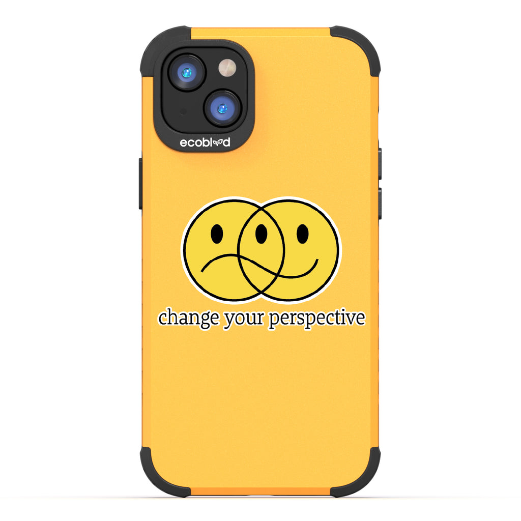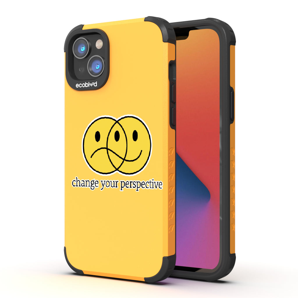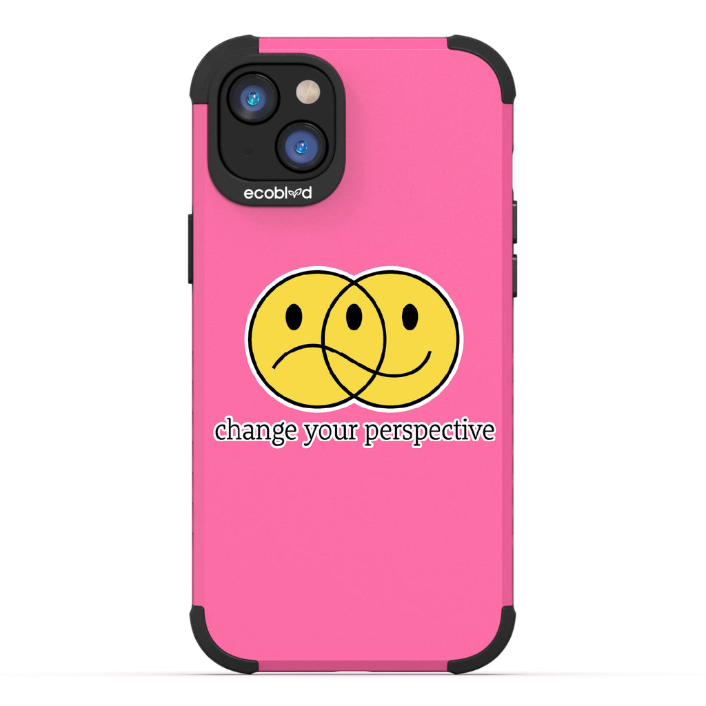 All of us interpret things differently, so the Perspective design on our Mojave rugged and compostable iPhone 14 Plus case gives you a new mantra: "Change your perspective," just as its ’smiley' face changes moods depending on how you look at it. Choose from five vibrant colorways: Midnight Black, Cascade Blue, Foliage Green, Illuminating Yellow, and Wildflower Pink.