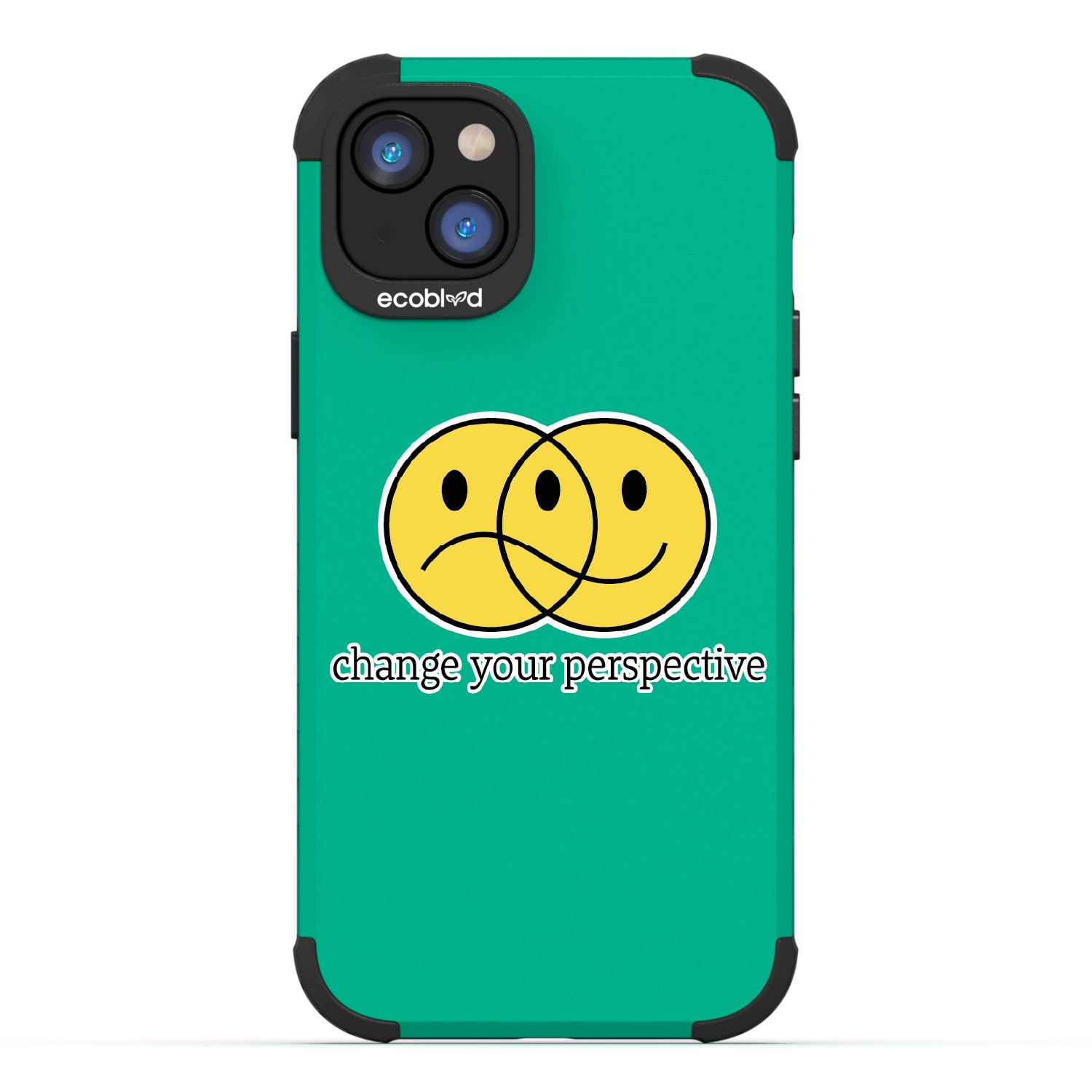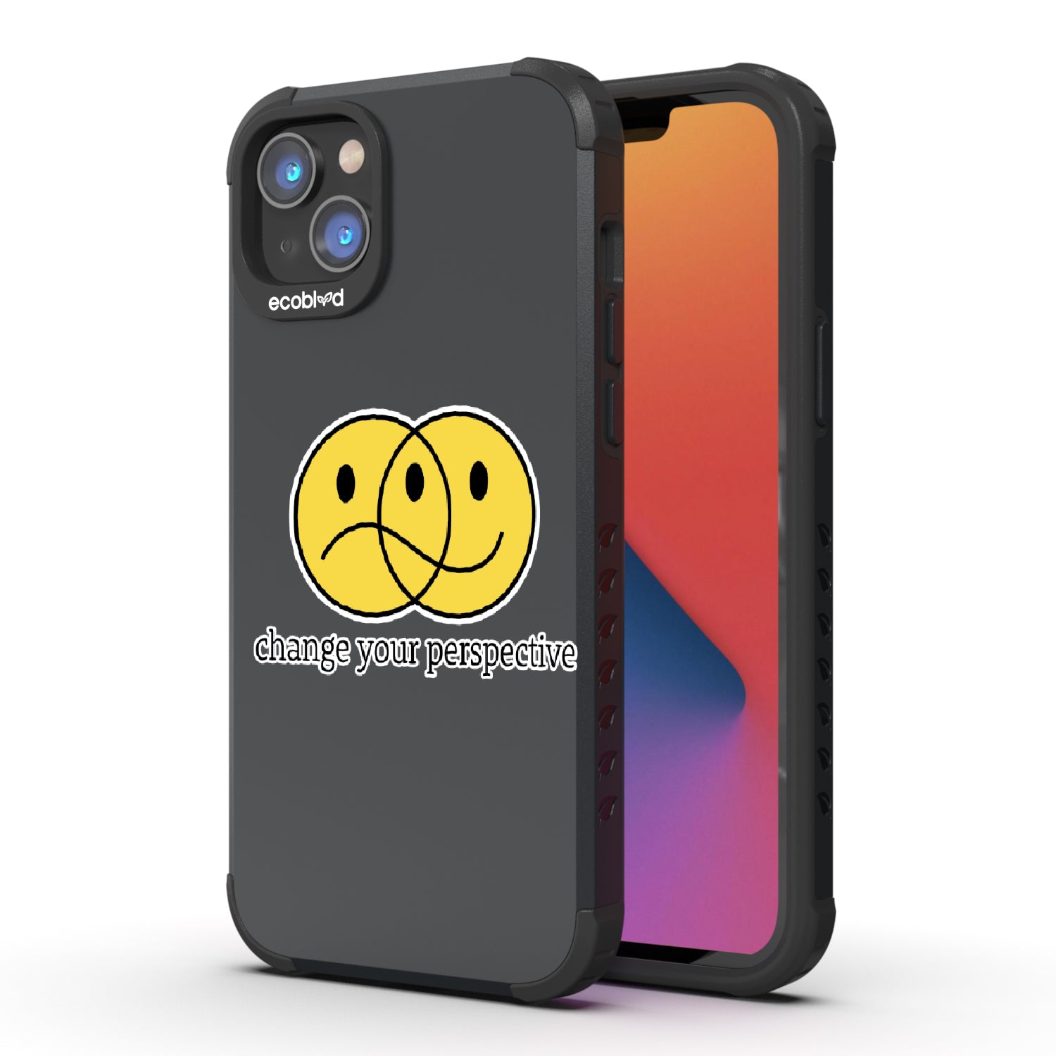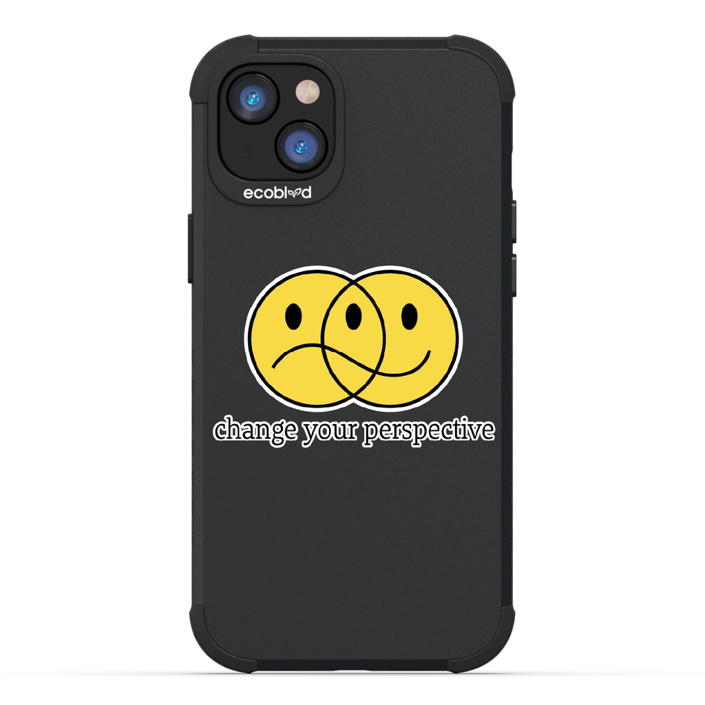 All of us interpret things differently, so the Perspective design on our Mojave rugged and compostable iPhone 14 Plus case gives you a new mantra: "Change your perspective," just as its ’smiley' face changes moods depending on how you look at it. Choose from five vibrant colorways: Midnight Black, Cascade Blue, Foliage Green, Illuminating Yellow, and Wildflower Pink.