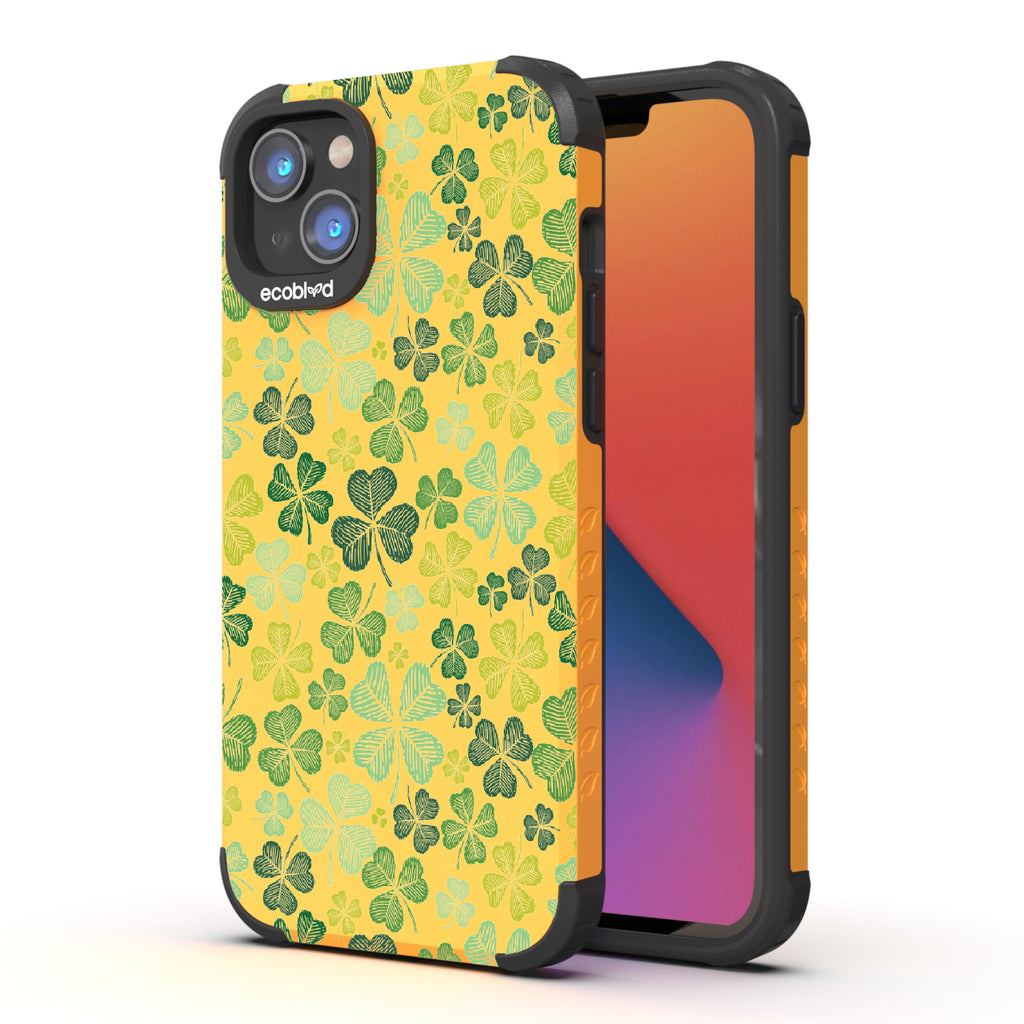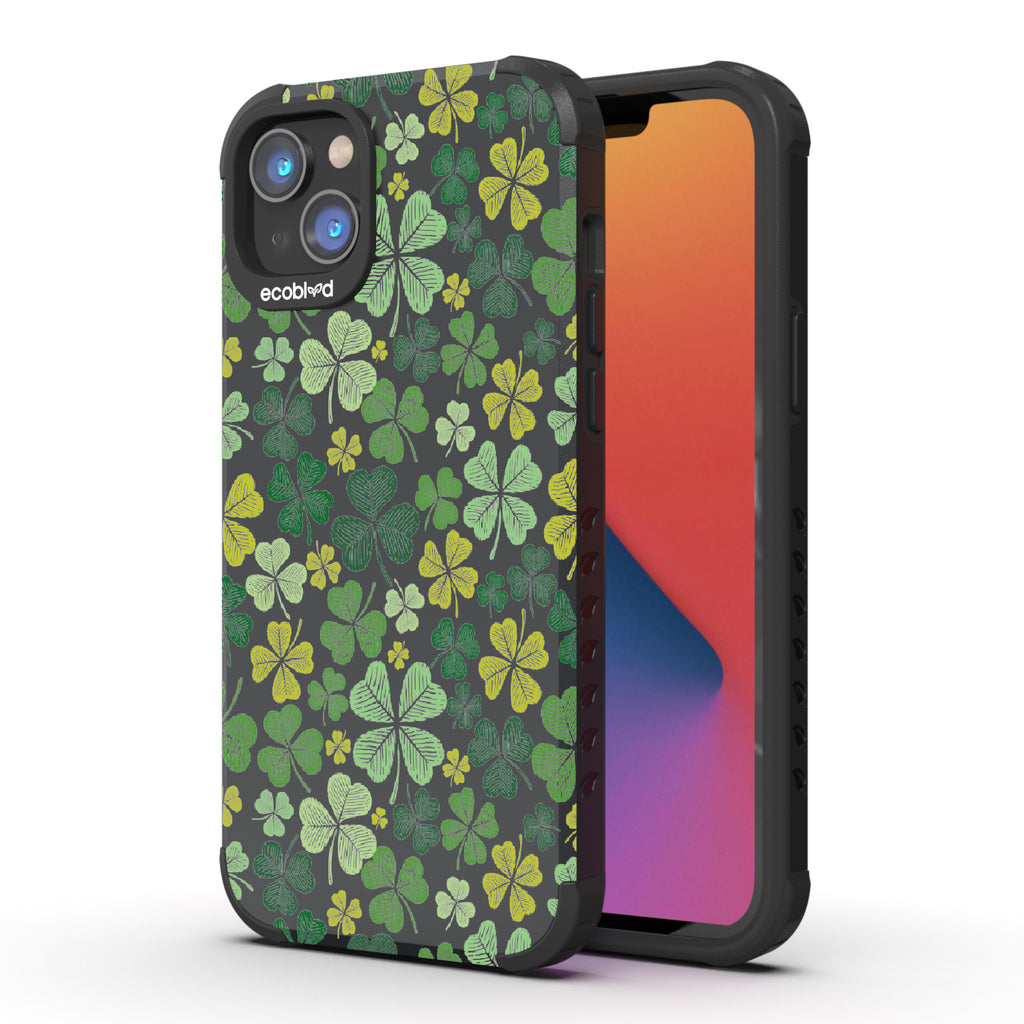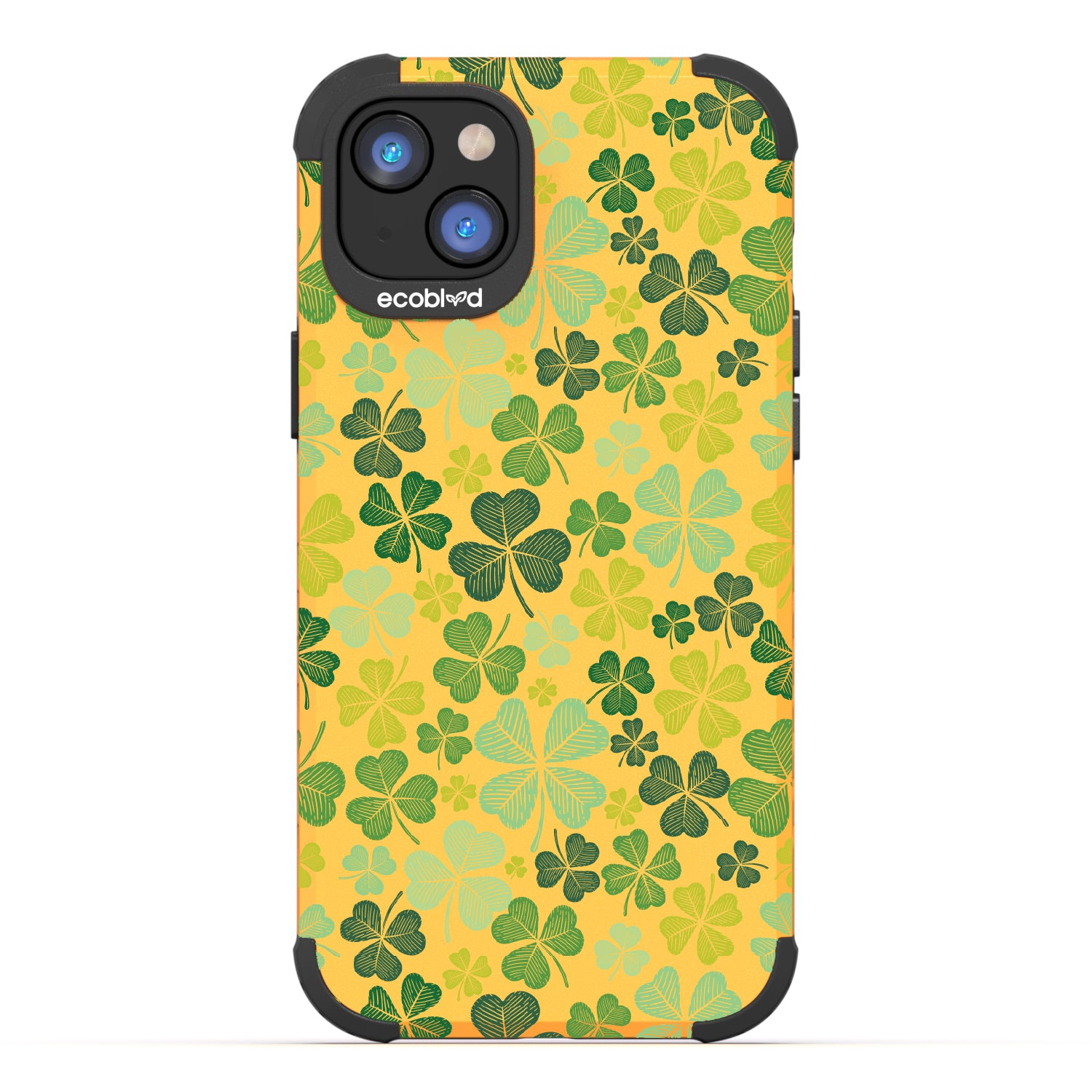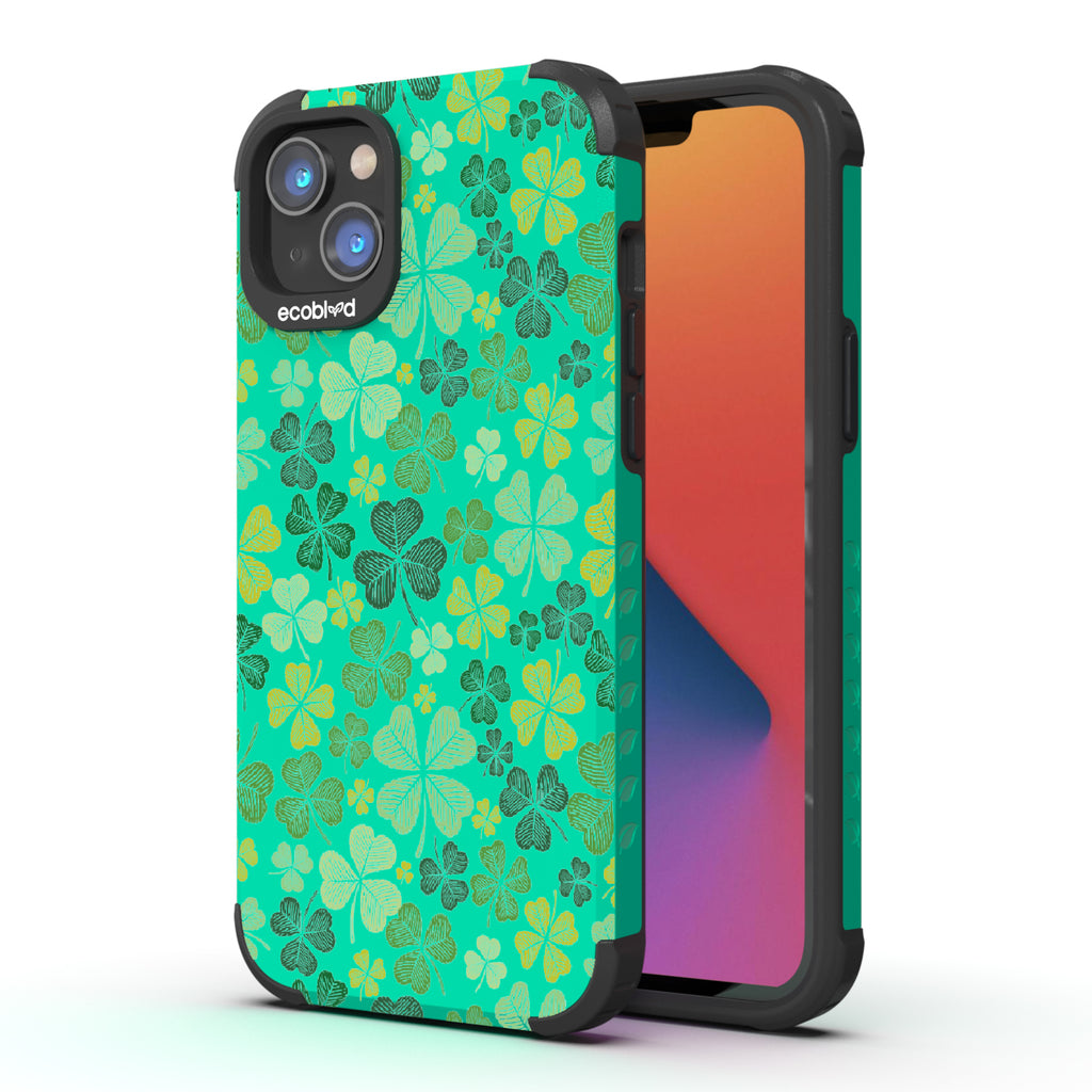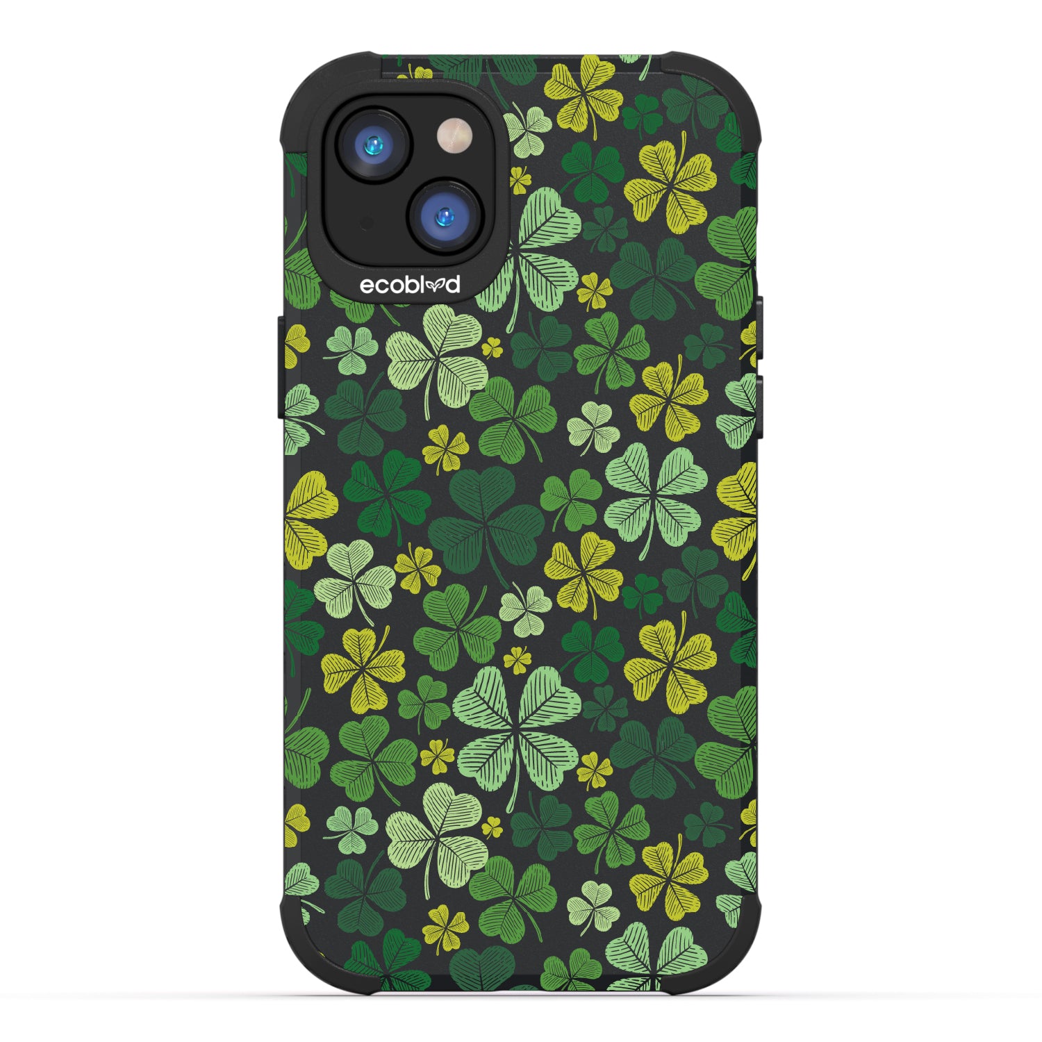Turn your luck around with the vibrant Shamrock design on our Mojave rugged and compostable iPhone 14 Plus case, where every leaf whispers tales of fortune and fate. Adorned with a sea of green four-leaf clovers, this design is a true emblem of luck, designed to bring a touch of charm.