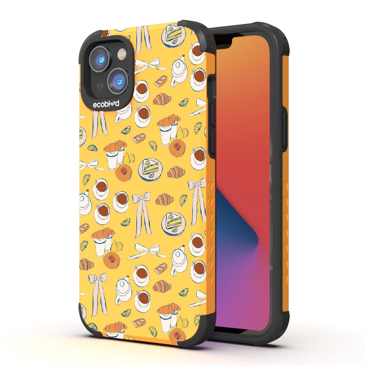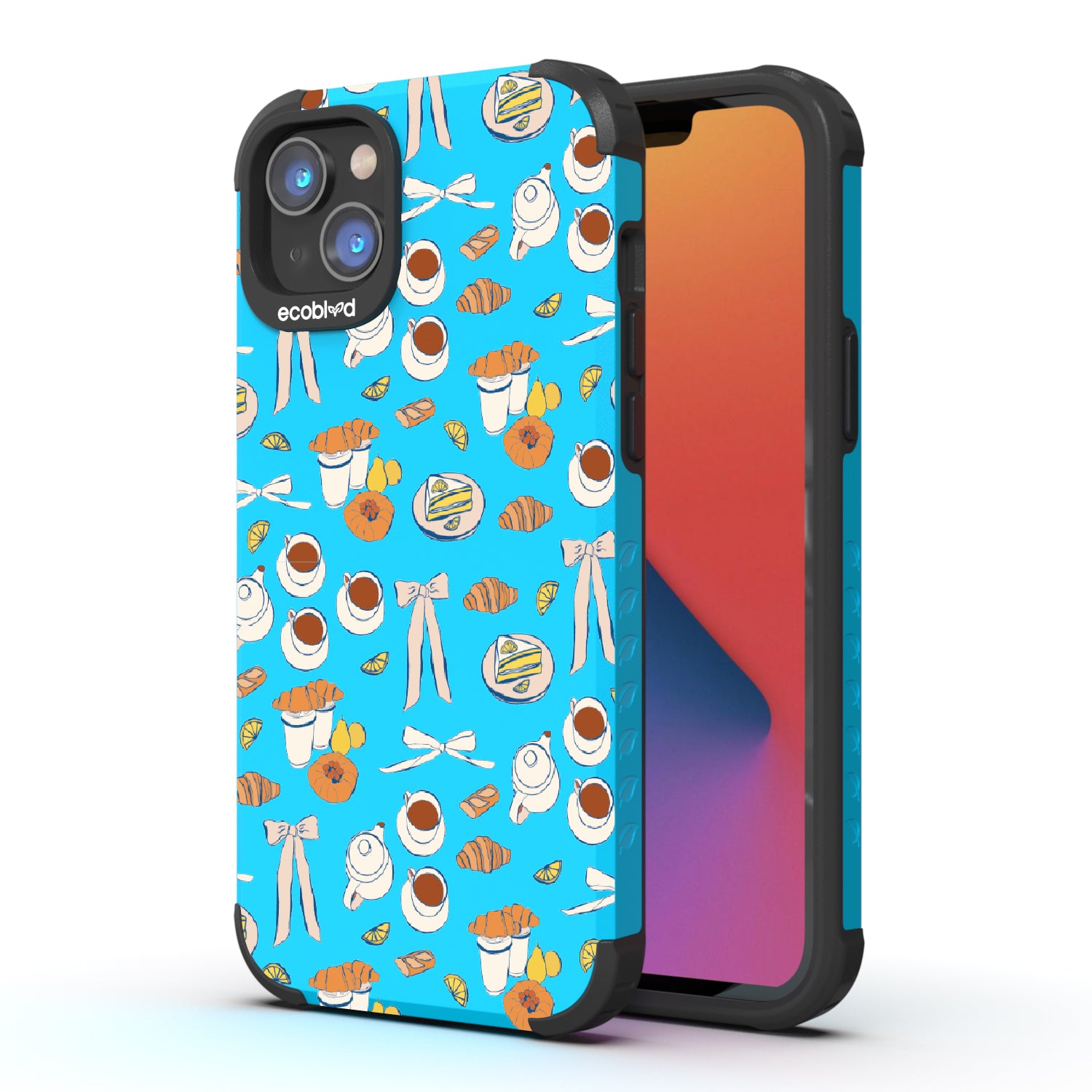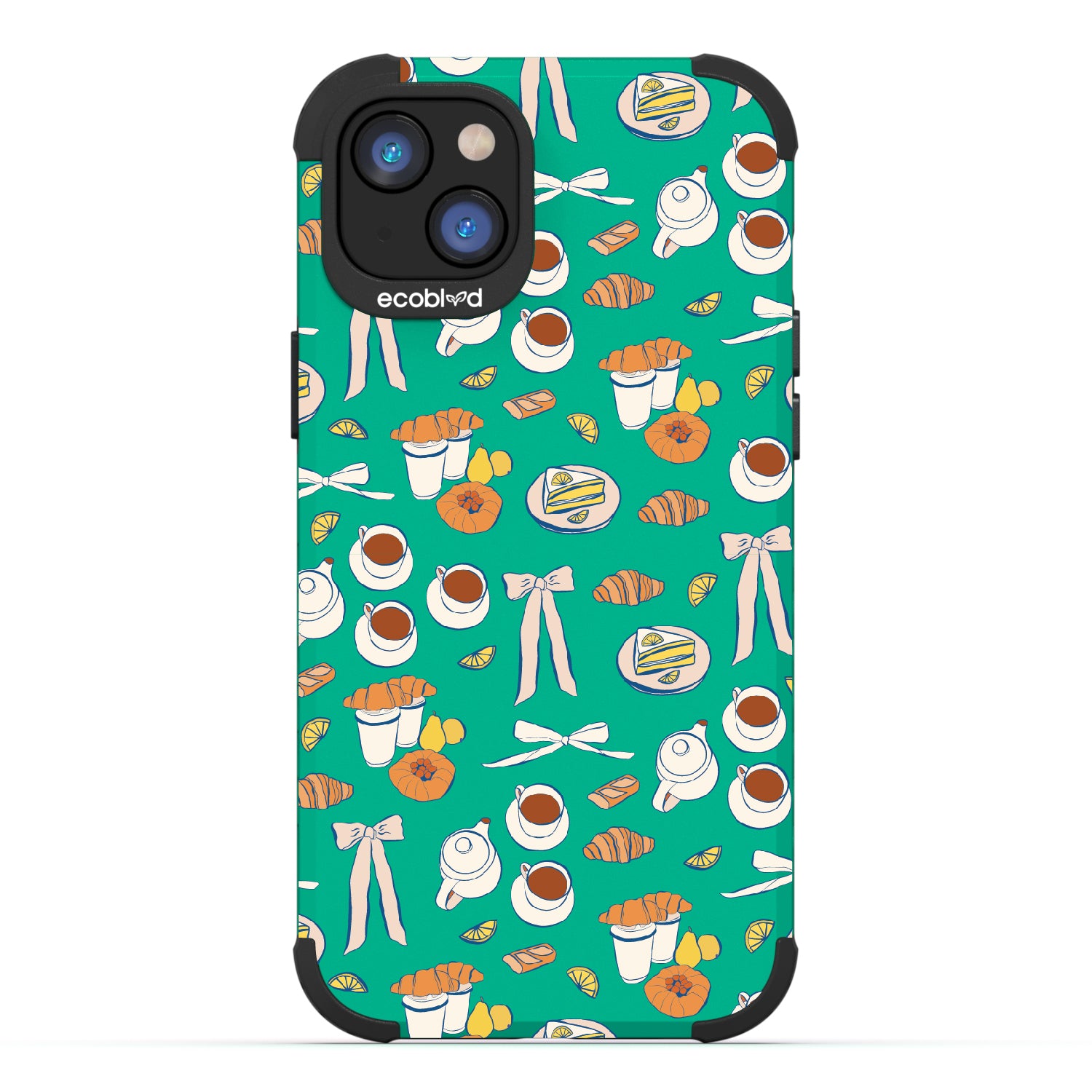 Tea time is the new happy hour. This design on our Mojave rugged and compostable iPhone 14 Plus case combines whimsical teacups, dainty bows, and sweet pastel pastries in style as delightful as a perfect afternoon break. A tribute to making time for yourself with a touch of elegance.