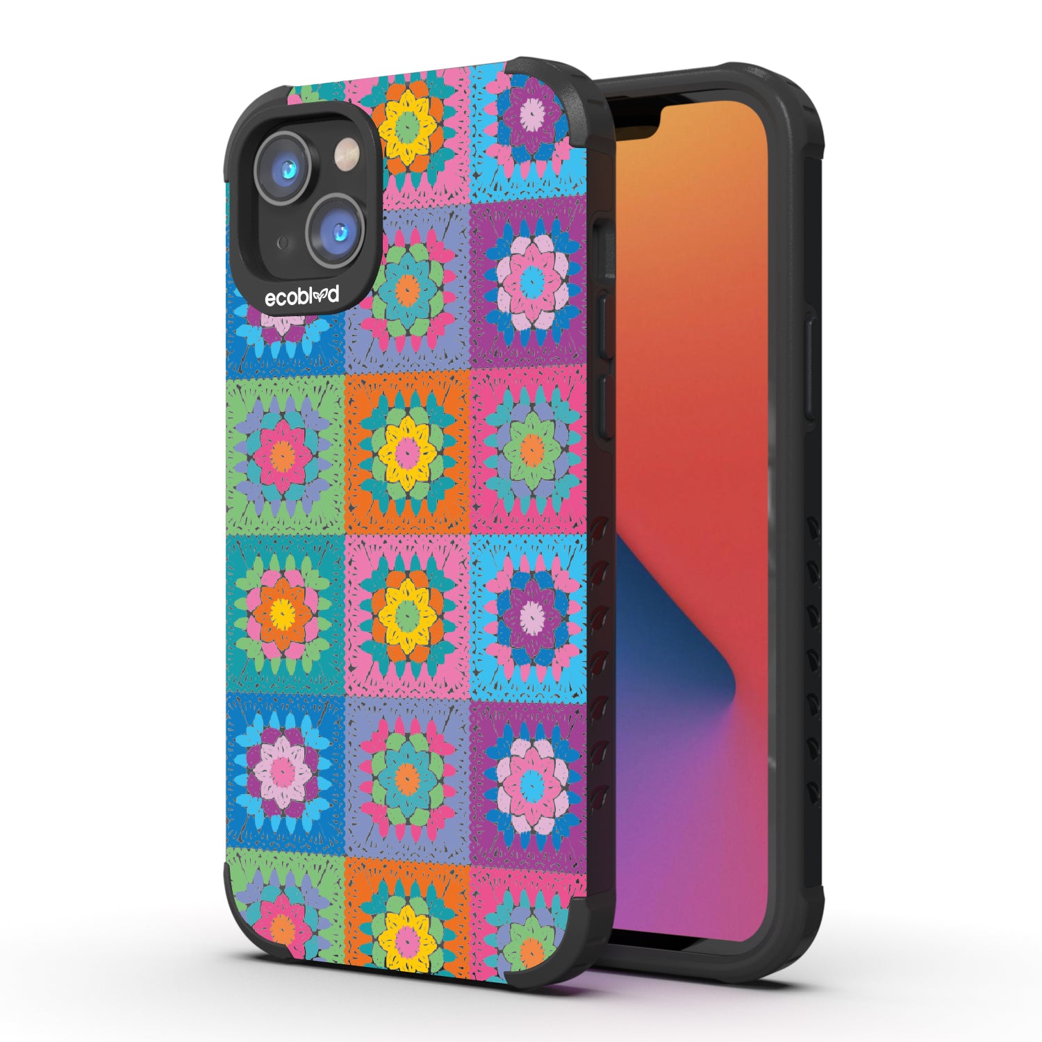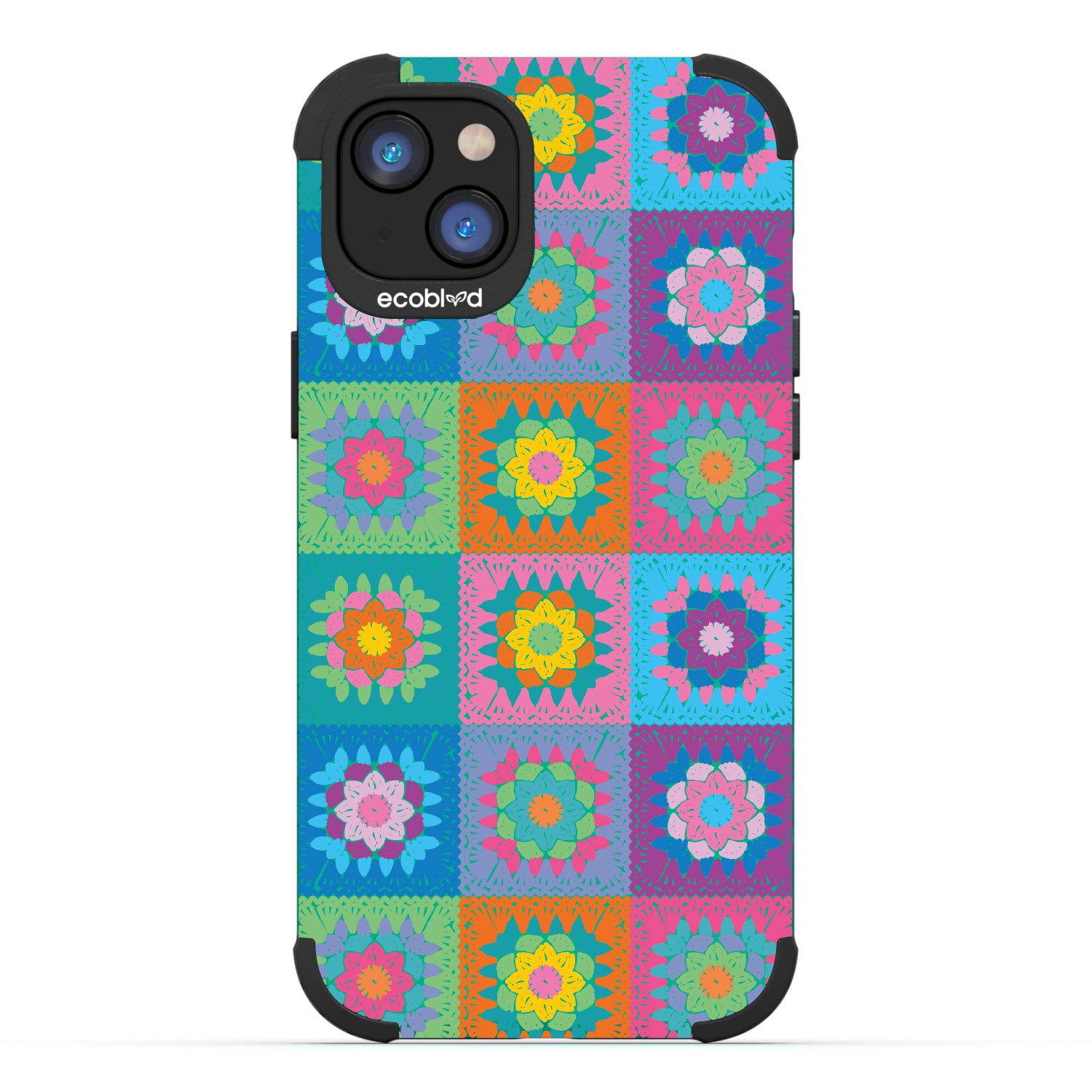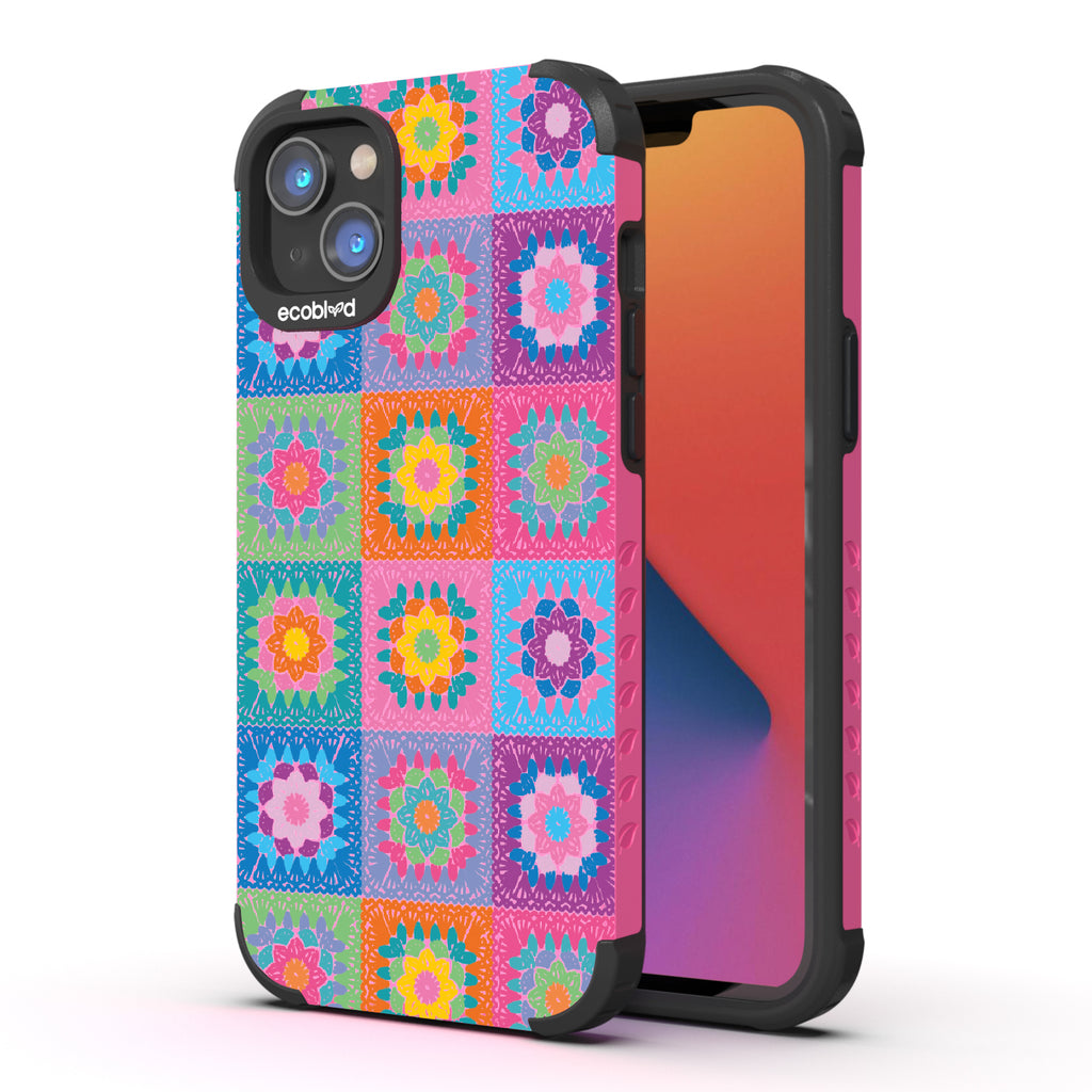 Let the All Squared Away design on our Mojave rugged and compostable iPhone 14 Plus case be your constant companion for Spring Break, music fests, or all year round, giving you a warm and inviting look with its quilt-like design of vintage granny squares and intricate flowers in five bright colorways: Midnight Black, Cascade Blue, Foliage Green, Illuminating Yellow, and Wildflower Pink.