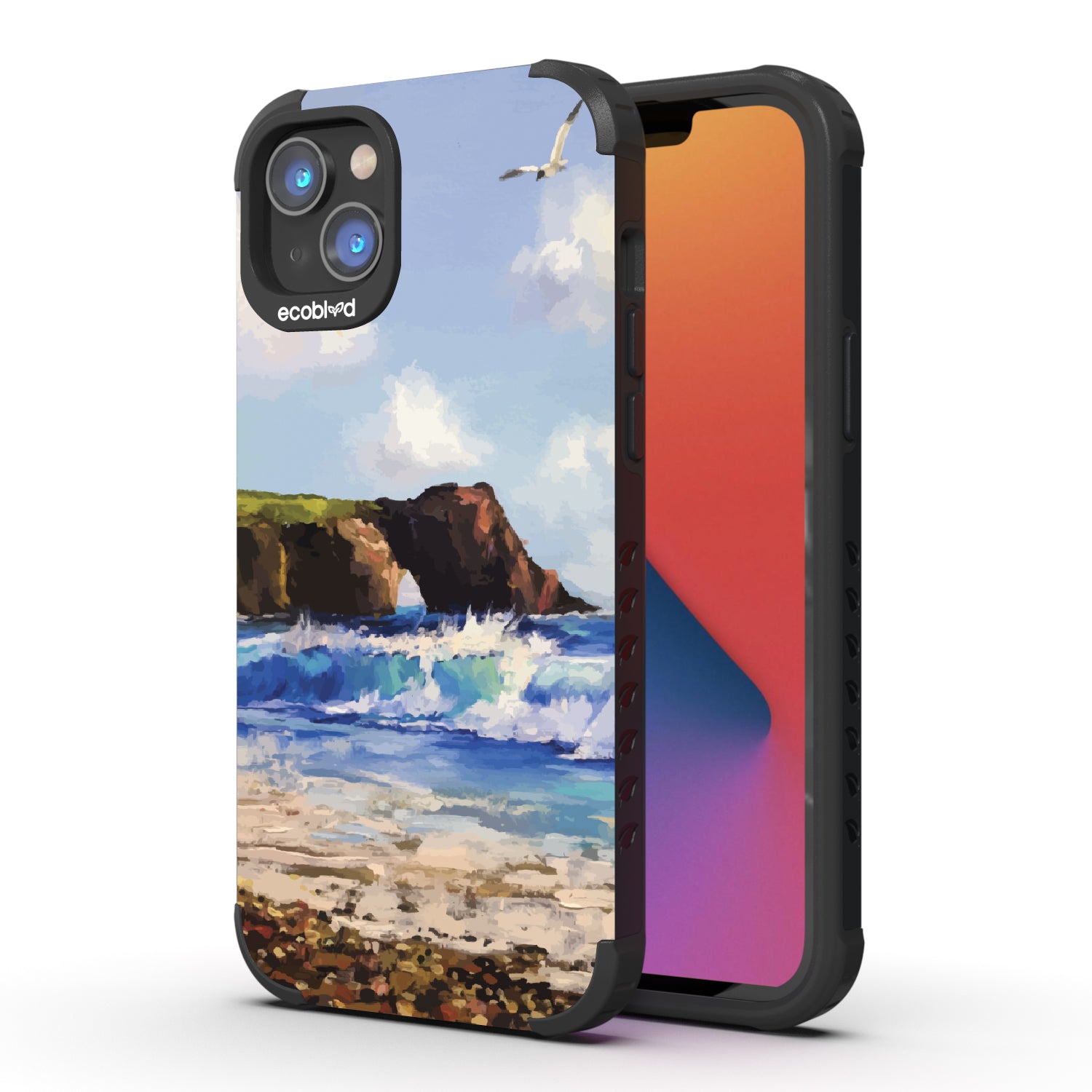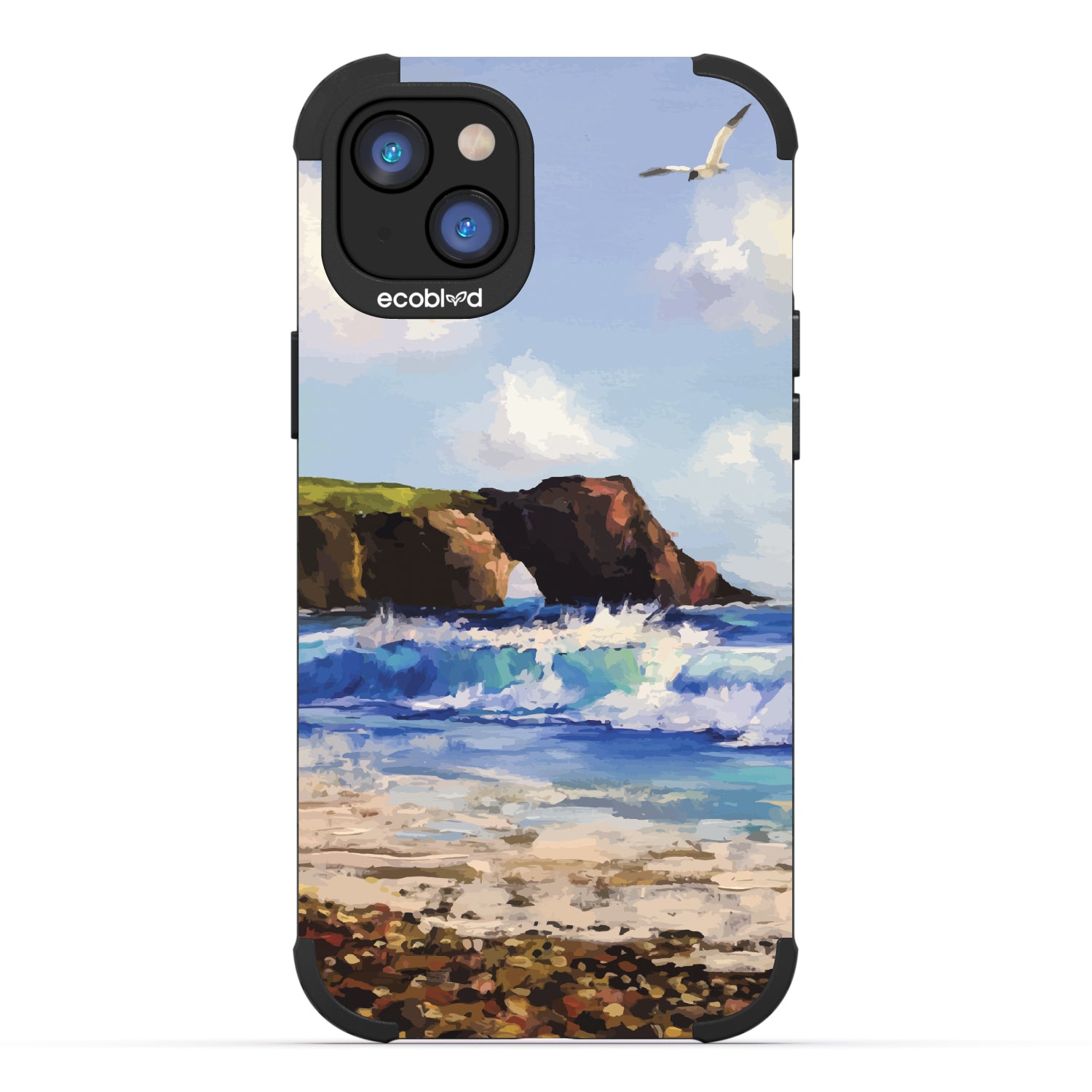 The calm before…. The Cliffhanger design on our Mojave rugged and compostable iPhone 14 Plus case holds a moment of painted suspense—brushed cliffs, churning tides, and a palette that builds to the brink. A story captured at its turning point.