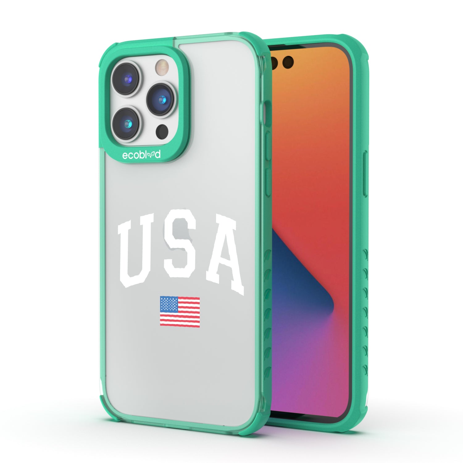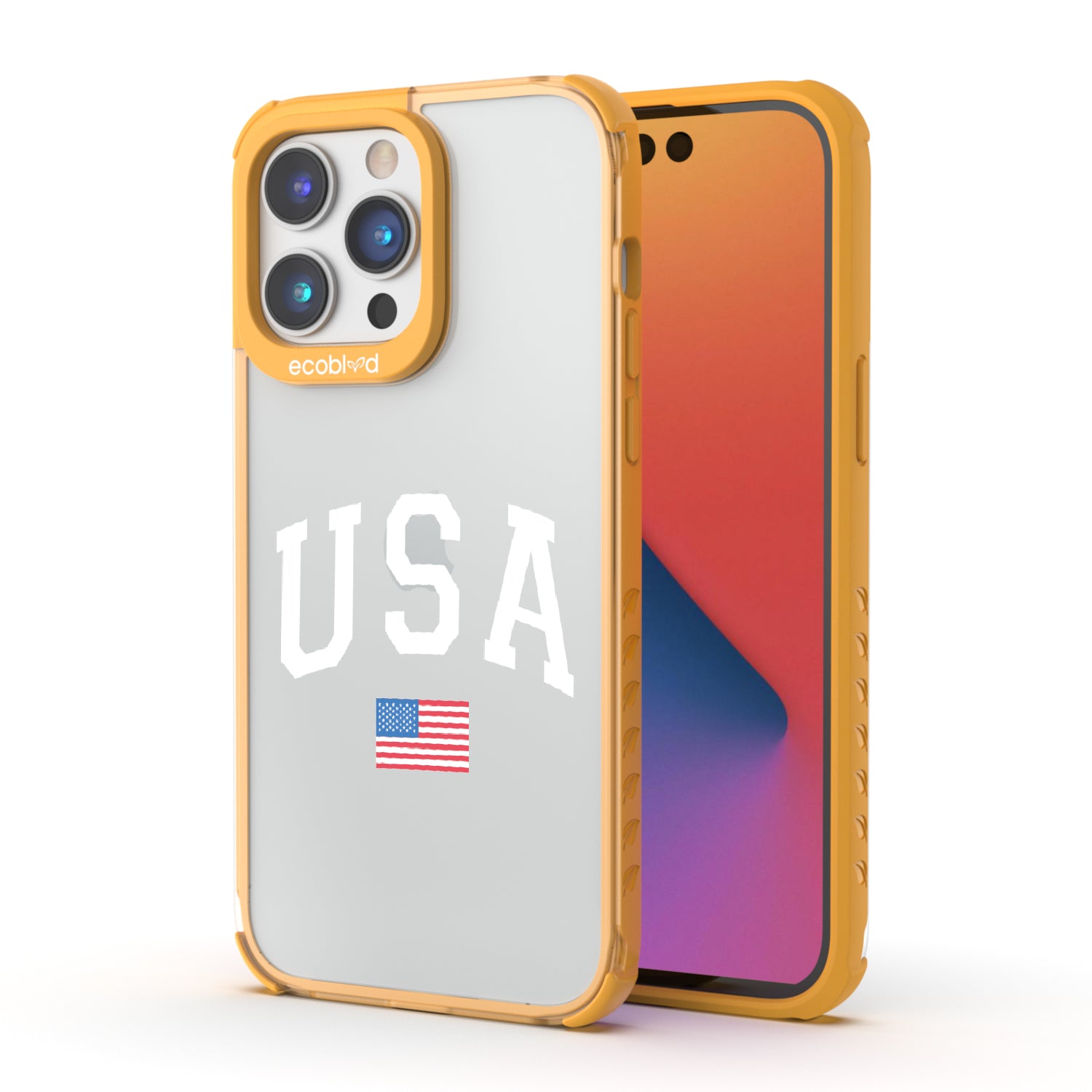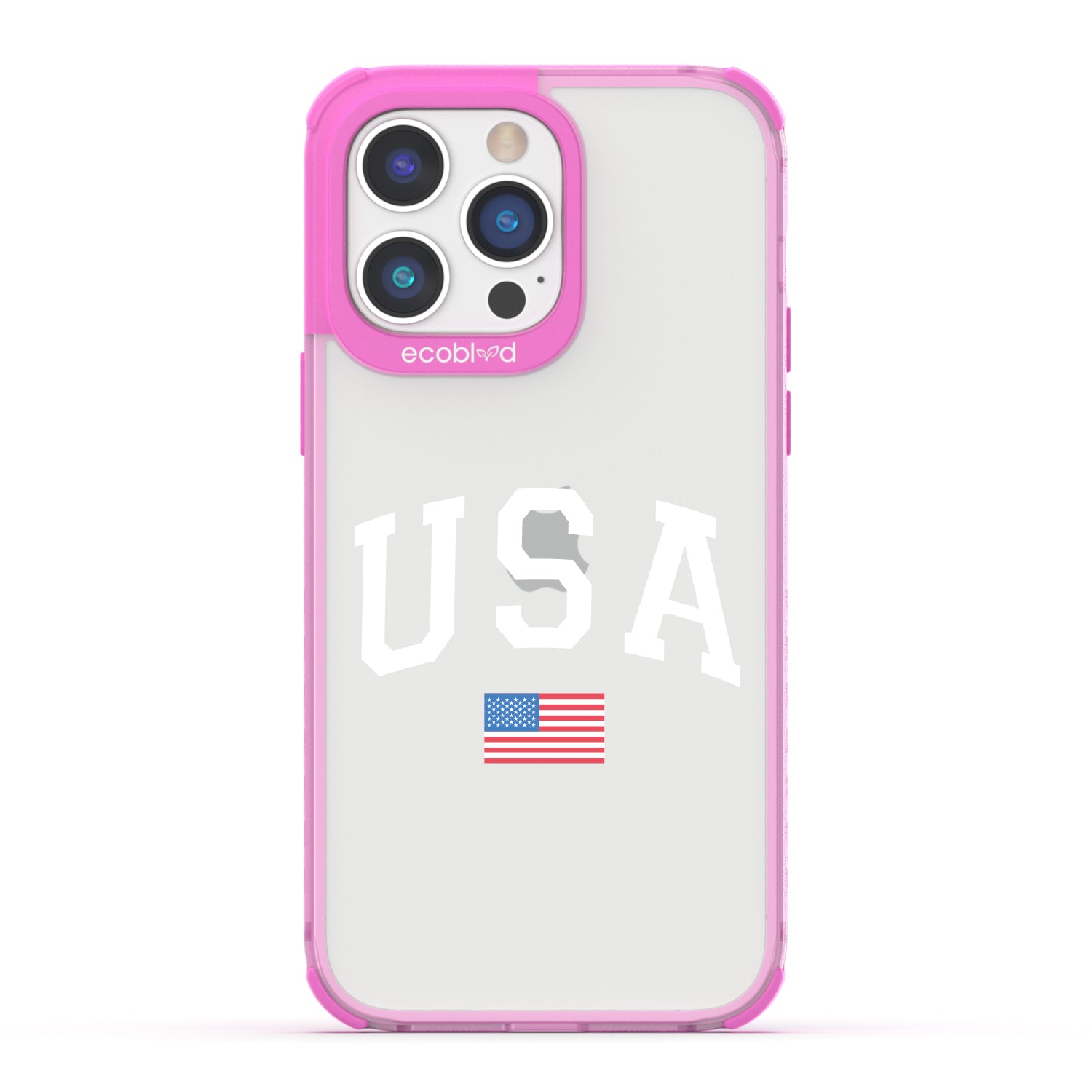 Cheer on the stars and stripes with the All-American design on our Laguna clear iPhone 14 Pro phone case. With bold "USA" and the American flag, this case celebrates Team USA and the Olympic games.