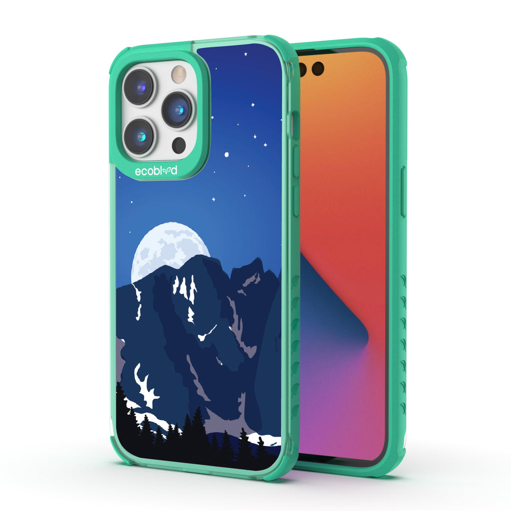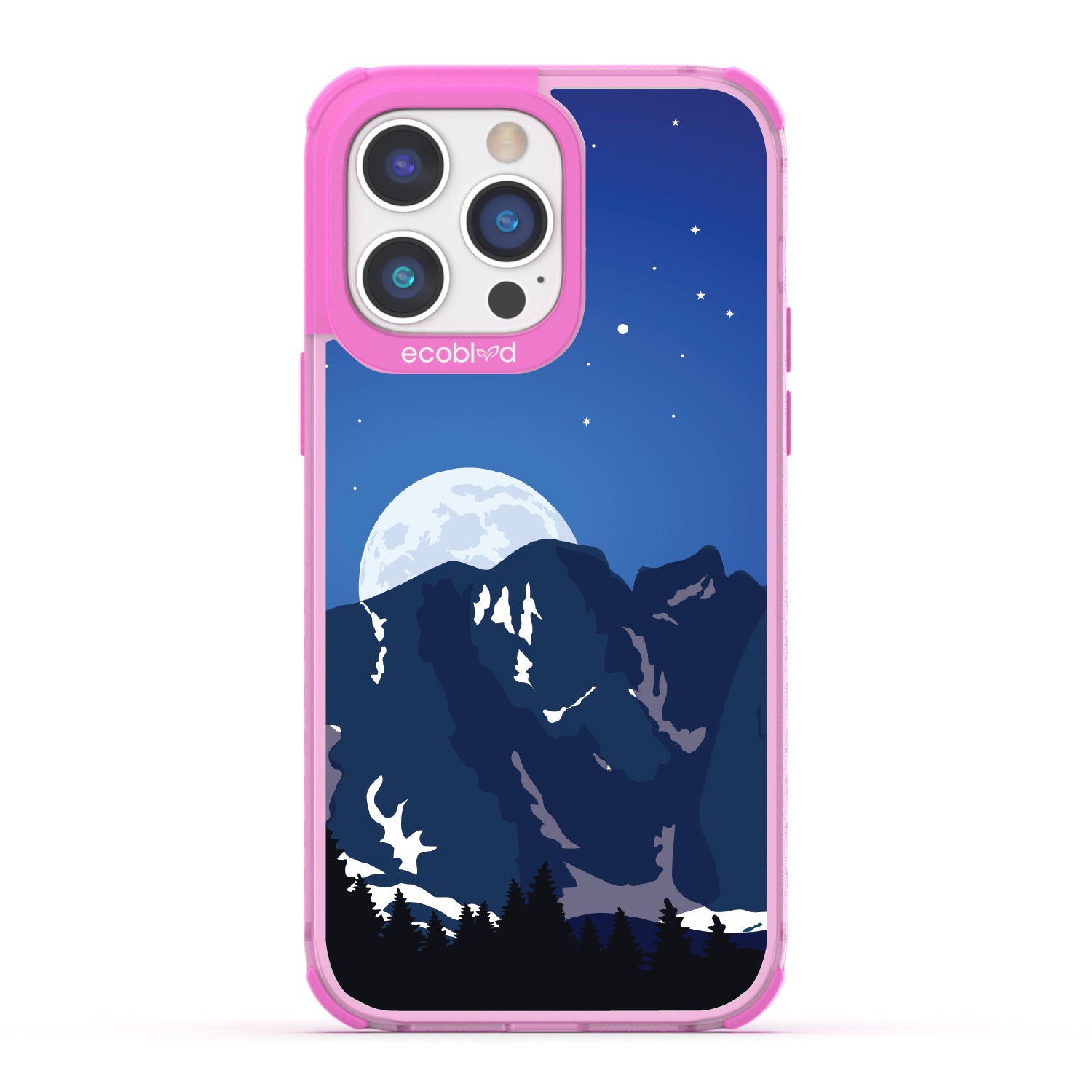 Bask in the ethereal glow of our Alpine Moon design on our Laguna clear iPhone 14 Pro case, where the moon hangs like a luminous pearl against the velvet canvas of the night sky, casting its soft radiance upon the rugged terrain below.