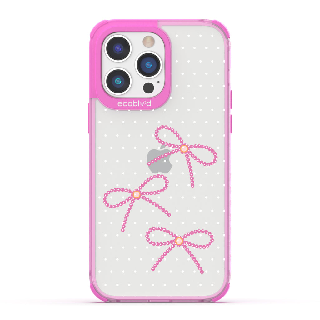 Knot to be outdone, the Knot So Little design on our Laguna clear iPhone 14 Pro phone case brings big style in small doses. Featuring pearls tied into dainty bows, this design adds a sophisticated touch to your phone. Show off your love for the little things with this elegant look.